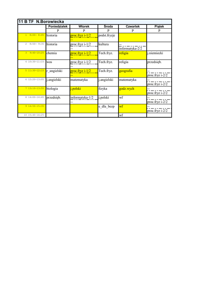 11 B TF N.Borowiecka Poniedziałek 1 8:00- 8:45 P historia 2 8:50- 9:35 historia 3 9:40-10:25 chemia Wtorek Środa Piątek P P 4 10:30-11:15 wos 5 11:30-12:15 r_angielski 6 12:20-13:05 j.angielski 7 13:10-13:55 biologia j.polski fizyka godz.wych 8 14:00-14:45 przedsięb. informatyka-1/2 -- j.polski wf e_dla_bezp wf 9 14:50-15:35 10 15:40-16:25 P podst.fryzje Czwartek P proc.fryz i-1/2 -proc.fryz i-1/2 -proc.fryz i-1/2 -proc.fryz i-1/2 -proc.fryz i-1/2 -matematyka kultura Tech.fryz. -informatyka-2/2 religia j.niemiecki Tech.fryz. religia przedsięb. Tech.fryz. geografia j.angielski matematyka -proc.fryz i-2/2 -proc.fryz i-2/2 -proc.fryz i-2/2 -proc.fryz i-2/2 -proc.fryz i-2/2 wf