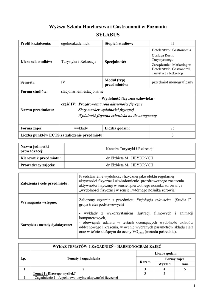 Wyższa Szkoła Hotelarstwa i Gastronomii w Poznaniu SYLABUS ogólnoakademicki Profil kształcenia: Stopień studiów: II Kierunek studiów: Turystyka i Rekreacja Specjalność: Hotelarstwo i Gastronomia Obsługa Ruchu Turystycznego Zarządzanie i Marketing w Hotelarstwie, Gastronomii, Turystyce i Rekreacji Semestr: IV Moduł (typ) przedmiotów: przedmiot monograficzny Forma studiów: stacjonarne/niestacjonarne Nazwa przedmiotu: - Wydolność fizyczna człowieka część IV: Prozdrowotna rola aktywności fizyczne Złoty marker wydolności fizycznej Wydolność fizyczna człowieka na tle ontogenezy wykłady Forma zajęć 75 Liczba godzin: Liczba punktów ECTS za zaliczenie przedmiotu: 3 Nazwa jednostki prowadzącej: Katedra Turystyki i Rekreacji Kierownik przedmiotu: dr Elżbieta M. HEYDRYCH Prowadzący zajęcia: dr Elżbieta M. HEYDRYCH Założenia i cele przedmiotu: Przedstawienie wydolności fizycznej jako efektu regularnej aktywności fizyczne i uświadomienie prozdrowotnego znaczenia aktywności fizycznej w sensie „pierwotnego nośnika zdrowia”, i „wydolności fizycznej w sensie „wtórnego nośnika zdrowia” Wymagania wstępne: Zaliczony egzamin z przedmiotu Fizjologia człowieka grupa treści podstawowych) Narzędzia / metody dydaktyczne: (Studia Io . - wykłady z wykorzystaniem ilustracji filmowych i animacji komputerowych, - obowiązek udziału w testach oceniających wydolność układów oddechowego i krążenia, w ocenie wybranych parametrów składu ciała oraz w teście służącym do oceny VO2max (metoda pośrednia). WYKAZ TEMATÓW I ZAGADNIEŃ – HARMONOGRAM ZAJĘĆ Liczba godzin Lp. Tematy i zagadnienia Razem 1 1 2 Temat 1: Dlaczego wysiłek? - Zagadnienie 1: Aspekt ewolucyjny aktywności fizycznej 3 3 Formy zajęć Wykład Inne 4 5 3 1 2 3 4 5 - Zagadnienie 2: Programy wysiłkowe zapewniające zdrowie - Zagadnienie 3: Znaczenie biegu - Zagadnienie 4: Znaczenie pływania - Zagadnienie 5: Kulturystyka umysłowa - Zagadnienie 6: Efekty codziennej aktywności fizycznej Temat 2: Złoty marker wydolności fizycznej czyli VO 2max - Zagadnienie 1: Definicja wydolności - Zagadnienie 2: Wydolność fizyczna a wydolność tlenowa - Zagadnienie 3: Maksymalny pobór tlenu - Zagadnienie 4: Wartości VO2max w zależności od płci i wieku - Zagadnienie 5: Podział intensywności wysiłków fizycznych wg VO2max Temat 3: Metody oznaczania maksymalnego zużycia tlenu (VO2max) - Zagadnienie 1: Metoda bezpośrednia - Zagadnienie 2: Metoda pośrednia - Zagadnienie 3: Metody „szacunkowe” Temat 4: Ocena wydolności fizycznej - Zagadnienie 1: Testy laboratoryjne - Zagadnienie 2: Testy terenowe - Zagadnienie 3: Szacunkowe oceny ciężkości wysiłków fizycznych Temat 5: Wydolność fizyczna na tle ontogenezy - Zagadnienie 1: Wydolność fizyczna dzieci i młodzieży - Zagadnienie 2: Wydolność fizyczna dorosłych (kobiet i mężczyzn) - Zagadnienie 3: Wydolność fizyczna osób starszych Razem Symbol efektów kształcenia 2 2… 4 4 2 2 4 4 15 15 Opis zamierzonych efektów kształcenia Po zaliczeniu zajęć student: Odniesienie do efektów kształcenia dla kierunku W zakresie wiedzy W01 Posiada znajomość funkcji organizmu człowieka w zakresie studiowanego kierunku studiów K1_W01 W02 Ma pogłębioną wiedzę z zakresu nauk o zdrowiu oraz nauk o kulturze fizycznej K1_W01 W03 Rozumie i wskazuje na elementy wpływające na wybranym module zachowań prozdrowotnych K1_W03 W04 Zna zależności między wiekiem, płcią a wydolnością fizyczną K1_W04 W05 Zna wybrane testy wysiłkowe i parametry oceny wydolności fizycznej K1_W05 W06 Jest świadomy praktycznej roli CIOP w ocenie wydolności fizycznej pracowników K1_W06 W zakresie umiejętności U01 Zna odpowiednie testy służące ocenie wydolności tlenowej i beztlenowej K1_U01 U02 Zna metody szcukowe i pośrednie wyznaczania wartości V02max K1-U02 U03 Posiada umiejętności wykorzystania zdrowego stylu życia w praktyce K1_U03 aspektów promocji 2 W zakresie kompetencji personalnych i społecznych K01 Posiada umiejętności wykorzystania zdrowego stylu życia w praktyce aspektów promocji K1_K01 Forma zajęć: Zamierzone efekty kształcenia Metody / formy oceny - Wykłady: Wiedza teoretyczna i umiejętności praktyczne - Przedmiot na prawach zaliczenia Forma zaliczenia: ustna lub pisemna (test) - Inne: Elementy składowe oceny końcowej Efekt kształcenia Sposób sprawdzenia osiągnięć efektów kształcenia Procenty Ocena wiedzy na podstawie wyników uzyskanych z zaliczenia ustnego lub pisemnego (test) (decyduje % prawidłowych odpowiedzi): niedostateczny dostateczny dobry bardzo dobry ˂ 33% 33% 66% 100% Forma oceny Egzamin ustny Egzamin pisemny Kolokwium Projekt Zaliczenie W1 X W2 X W3 X W4 X W5 X W6 X U1 X U2 X U3 X K1 ……… X 3 Całkowity nakład pracy studenta potrzebny do osiągnięcia efektów w godzinach Aktywność Udział w wykładach Samodzielne studiowanie tematyki wykładów Udział w teście do wyznaczenia pośrednio V02max Przygotowanie do zaliczenia / kolokwium i udział w zaliczeniu / kolokwium Obciążenie studenta 15 h 15 h 3h 8h+2h Razem: 43 godziny Zalecana literatura przedmiotu Podstawowa: Uzupełniająca: 1. Czarkowska – Pączek B. Przybylski J.: Zarys fizjologii wysiłku fizycznego. Urban & Partner 2004. 2. Brich K., MacLaren D., George K.: Krótkie wykłady Fizjologii sportu. Wydawnictwo NaukowePWN 2009. 3. Gieremek K. Dec L.: Zmęczenie i regeneracja sił. Odnowa biologiczna. HAS-MED. S.C. Katowice 2000. 4. Górski J.(red.): Fizjologiczne podstawy wysiłku fizycznego. Wydawnictwo Lekarskie PZWL. Warszawa 2005. 5. Hansen J.T. Koeppen B.M. S. Konturka (red) Atlas fizjologii człowieka. Nettera. Wydawnictwo Medyczne Urban & Partner. Wrocław 2005. 6. Jaskólski A. Jaskólska A.: Podstawy fizjologii wysiłku fizycznego z zarysem fizjologii człowieka. Wydawnictwo AWF we Wrocławiu. Wrocław 2005. 7. Rosołowska – Huszcz D. Gromadzka – Ostrowska E.: Przewodnik do ćwiczeń z fizjologii człowieka.
