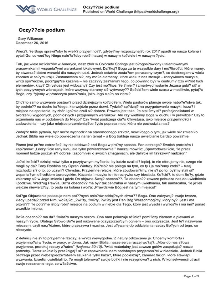 Oczy??cie podium Published on World Challenge (https://worldchallenge.org) Oczy??cie podium Gary Wilkerson December 26, 2016 Wierz?, ?e Bogu sprawi?oby to wielk? przyjemno??, gdyby?my rozpoczynaj?c rok 2017 upadli na nasze kolana i pytali Go, co wed?ug Niego nale?a?oby robi? inaczej w naszym ko?ciele i w naszym ?yciu. Tak, jak wiele ko?cio?ów w Ameryce, nasz zbór w Colorado Springs jest b?ogos?awiony utalentowanymi pracownikami i wspania?ymi warunkami lokalowymi. Dzi?kuj? Bogu za te wszystkie dary i mo?liwo?ci, które mamy, by stwarza? dobre warunki dla naszych ludzi. Jednak ostatnio zosta?em poruszony czym?, co dostrzegam w wielu zborach w ca?ym kraju. Zastanawiam si?, czy mo?e elementy, które wielu z nas stosuje – rozrywkowa muzyka, wi?zi spo?eczne, poci?gaj?ce kazania – nie zacz??y zas?ania? tego, co powinno by? w centrum? Czy w?ród tych elementów, krzy? Chrystusa jest widoczny? Czy jest mo?liwe, ?e ?mier? i zmartwychwstanie Jezusa gubi? si? w tych pozytywnych wibracjach, które wszyscy staramy si? wytworzy?? Sp?dzi?em wiele czasu w modlitwie, pytaj?c Boga, czy ?yjemy w proroczym powo?aniu, jako Jego cia?o na ziemi? Chc? to samo wyzwanie postawi? przed dzisiejszym ko?cio?em. Wielu pastorów planuje swoje nabo?e?stwa tak, by podnie?? na duchu ka?dego, kto wejdzie przez drzwi. Tydzie? sp?dzaj? na przygotowaniu muzyki, kaza? i miejsca na spotkania, by zbór i go?cie czuli si? dobrze. Prawda jest taka, ?e stali?my si? profesjonalistami w tworzeniu wygodnych, podnios?ych i przyjemnych warunków. Ale czy wielbimy Boga w duchu i w prawdzie? Czy to przemienia nas w podobnych do Niego? Czy ?wiat postrzega cia?o Chrystusa, jako miejsce przyjemno?ci i zadowolenia – czy jako miejsce przemieniaj?ce ?ycie poprzez moc, która nie pochodzi z nas? Zadaj?c takie pytania, by? mo?e wychodz? na staromodnego zrz?d?, mówi?cego o tym, jak wiele si? zmieni?o. Jednak Biblia ma wiele do powiedzenia na ten temat – a Bóg traktuje nasze uwielbianie bardzo powa?nie. Pismo jest pe?ne ostrze?e?, by nie oddawa? czci Bogu w pró?ny sposób. Pan ostrzega? Swoich proroków i kap?anów: „Leczyli?cie rany ludu, ale tylko powierzchownie.” Inaczej mówi?c: „Spowodowali?cie, ?e przez moment ludzie poczuli si? dobrze i zapomnieli o swoich zmaganiach, ale dali?cie im fa?szyw? nadziej?.” Je?eli ko?ció? dzisiaj mówi tylko o pozytywnym my?leniu, by ludzie czuli si? lepiej, to nie oferujemy nic, czego nie mogli by da? Tony Robbins czy Oprah Winfrey. Ko?ció? nie polega na tym, co ty i ja mo?emy zrobi? – tutaj rozchodzi si? o to, co uczyni? Chrystus. Przyjemne relacje, które zbudowali?my, nie s? po to, by?my stali si? wspania?ym o?rodkiem towarzyskim. Kazania i muzyka to nie rozrywka czy biesiada. Ko?ció?, to dom Bo?y, gdzie zbieramy si? w Jego imieniu i gdzie On objawia Swoj? obecno??. Ta obecno?? zawsze pobudza nas do uwielbienia i podziwu. Wed?ug Paw?a, Bo?a obecno?? ma by? tak centralna w naszym uwielbianiu, tak namacalna, ?e je?eli wejdzie niewierz?cy, to pada na kolana i wo?a: „Prawdziwie Bóg jest na tym miejscu!” Ksi?ga Objawienia pokazuje nam pot??nych anio?ów oddaj?cych chwa?? Bogu. One zakrywaj? swoje twarze, kiedy upadaj? przed Nim, wo?aj?c: „?wi?ty, ?wi?ty, ?wi?ty jest Pan Bóg Wszechmog?cy, który by? i jest i ma przyj??!” Te pot??ne istoty robi? miejsce na podium w niebie dla Tego, który jest wysoki i wynios?y i ma imi? ponad wszelkie imiona. Bo?a obecno?? ma da? ?wiat?o naszym oczom. Ona nam pokazuje ró?nic? pomi?dzy ziarnem a plewami w naszym ?yciu. Dlatego S?owo Bo?e jest nazywane oczyszczaj?cym ogniem – ono oczyszcza. Jest te? nazywane mieczem, czyli narz?dziem, które przeszywa i rozcina. Jest u?ywane do oddzielania rzeczy Bo?ych od tego, co nieczyste. Z definicji nie s? to przyjemne rzeczy, a wr?cz niewygodne. Z natury odrzucamy je. Chcemy komfortu i przyjemno?ci w ?yciu, w pracy, w domu. Jak mówi Biblia, nasze serca raczej wo?aj?: „Mów do nas s?owa przyjemne, prorokuj rzeczy z?udne” (Izajasza 30:10). ?wiat materialny jest zawsze gotów zaspokaja? nasze potrzeby. Teraz ko?cio?y prze?cigaj? si? w zapewnianiu nam podobnych przyjemno?ci w niedziele. Jednak Biblia ostrzega przed niebezpiecze?stwem szukania tylko kaza?, które pocieszaj?, zamiast takich, które stawiaj? wyzwania. Izraelici uwielbiali to, ?e mogli tolerowa? swoje bo?ki i nie rezygnowa? z nich. W konsekwencji utracili swoje rozeznanie tego, co w?a?ciwe. Page 1 of 3 Oczy??cie podium Published on World Challenge (https://worldchallenge.org) Pierwsze przykazanie Bo?e brzmi: „Nie b?dziesz mia? innych bogów przede Mn?”. To nie tylko oznacza, ?e mamy Boga stawia? przed innymi sprawami. S?owo „przed” oznacza tu „w mojej obecno?ci.” Bóg mówi: „Nie wno?cie ?adnych bo?ków w miejsce Mojej obecno?ci – waszych bo?ków rozkoszy, ambicji i waszych ludzkich mo?liwo?ci. Nie znios? tego.” Bóg wzywa nas, by?my oczy?cili podium, aby Chrystus znalaz? si? ponownie w centrum. Pierwsze miejsce, które Bóg chce oczy?ci?, to nasze uwielbienie. Nasze dzisiejsze podej?cie do uwielbienia jest niczym telewizyjny program „The Voice,” w którym panel jurorów jest odwrócony ty?em, by nie widzie? wykonawcy. Jedyne kryterium oceny tego, co s?ysz? brzmi: „Czy mi si? to podoba?” Taki te? jest standard oceny uwielbiania w wielu ko?cio?ach: „Czy mi si? to podoba?”, zamiast: „Czy w tym jest Bóg?” Przez d?ugi czas toczy?a si? debata odno?nie tego, co lepiej oddaje cze?? Bogu: stare pie?ni, czy nowa muzyka? Oczywi?cie odpowied? brzmi, ?e ani jedno, ani drugie. Mamy tylko jeden standard naszego uwielbiania: „Lecz nadchodzi godzina i teraz jest, kiedy prawdziwi czciciele b?d? oddawali Ojcu cze?? w duchu i w prawdzie; bo i Ojciec takich szuka, którzy by mu tak cze?? oddawali. Bóg jest duchem, a ci, którzy mu cze?? oddaj?, winni mu j? oddawa? w duchu i w prawdzie” (Jana 4:23-24). Jednak tak, jak jurorzy w programie „The Voice,” bardziej wolimy by? zabawiani, ni? sk?oni? nasze kolana w uwielbieniu.