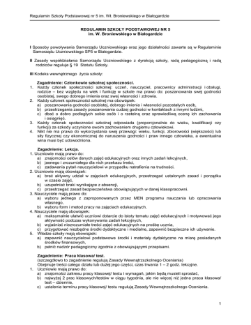 Regulamin Szkoły Podstawowej nr 5 im. Wł. Broniewskiego w Białogardzie REGULAMIN SZKOŁY PODSTAWOWEJ NR 5 im. W. Broniewskiego w Białogardzie I Sposoby powoływania Samorządu Uczniowskiego oraz jego działalności zawarte są w Regulaminie Samorządu Uczniowskiego SP5 w Białogardzie. II Zasady współdziałania Samorządu Uczniowskiego z dyrekcją szkoły, radą pedagogiczną i radą rodziców reguluje § 19 Statutu Szkoły. III Kodeks wewnętrznego Ŝycia szkoły: Zagadnienie: Członkowie szkolnej społeczności. 1. KaŜdy członek społeczności szkolnej: uczeń, nauczyciel, pracownicy administracji i obsługi, rodzice – bez względu na wiek i funkcję w szkole ma prawo do: poszanowania swej godności osobistej, swego dobrego imienia oraz swej własności i zdrowia. 2. KaŜdy członek społeczności szkolnej ma obowiązek: a) poszanowania godności osobistej, dobrego imienia i własności pozostałych osób, b) przestrzegania zasady poszanowania cudzej godności w kontaktach z innymi ludźmi, c) dbać o dobro podległych sobie osób i o rzetelną oraz sprawiedliwą ocenę ich zachowania i osiągnięć. 3. KaŜdy członek społeczności szkolnej odpowiada (proporcjonalnie do wieku, kwalifikacji czy funkcji) za szkody uczynione swoim zachowaniem drugiemu człowiekowi. 4. Nikt nie ma prawa do wykorzystania swej przewagi: wieku, funkcji, zbiorowości (większości) lub siły fizycznej czy ekonomicznej do naruszenia godności i praw innego człowieka, a ewentualna wina musi być udowodniona. Zagadnienie: Lekcja. 1. Uczniowie mają prawo do: a) znajomości celów danych zajęć edukacyjnych oraz innych zadań lekcyjnych, b) jasnego i zrozumiałego dla nich przekazu treści, c) zadawania pytań nauczycielowi w przypadku natrafienia na trudności. 2. Uczniowie mają obowiązek: a) brać aktywny udział w zajęciach edukacyjnych, przestrzegać ustalonych zasad i porządku w czasie zajęć, b) uzupełniać braki wynikające z absencji, c) przestrzegać zasad bezpieczeństwa obowiązujących w danej klasopracowni. 3. Nauczyciele mają prawo do: a) wyboru jednego z zaproponowanych przez MEN programu nauczania lub opracowania własnego, b) wyboru form i metod pracy na zajęciach edukacyjnych. 4. Nauczyciele mają obowiązek: a) maksymalnie ułatwić uczniowi dotarcie do istoty tematu zajęć edukacyjnych i motywować jego aktywność podczas wykonywania zadań lekcyjnych, b) wyjaśniać niezrozumiałe treści zajęć edukacyjnych na prośbę ucznia, c) przygotować niezbędne środki dydaktyczne i medialne, zapewnić bezpieczne ich uŜywanie. 5. Władze szkoły mają obowiązek: a) zapewnić nauczycielowi podstawowe środki i materiały dydaktyczne na miarę posiadanych środków finansowych, b) pełnić nadzór pedagogiczny zgodnie z obowiązującymi przepisami. Zagadnienie: Praca klasowa/ test. (szczegółowo to zagadnienie regulują Zasady Wewnątrzszkolnego Oceniania) Obejmuje treści całego działu lub duŜej jego części, czas trwania 1 – 2 godz. lekcyjne. 1. Uczniowie mają prawo do: a) znajomości zakresu pracy klasowej/ testu i wymagań, jakim będą musieli sprostać, b) najwyŜej 2 prac klasowych/testów w ciągu tygodnia, ale nie więcej niŜ jedna praca klasowa/ test – dziennie, c) ustalenia terminu pracy klasowej/ testu regulują Zasady Wewnątrzszkolnego Oceniania. 1 Regulamin Szkoły Podstawowej nr 5 im. Wł. Broniewskiego w Białogardzie Uwaga: jeŜeli znajomość terminu pracy klasowej/ testu będzie przez ucz. wykorzystywana do róŜnych „uników” (wagarów lub ucieczek) – nauczyciel ma prawo nie podać uczniom terminu pracy klasowej/testu. 2. Uczniowie mają obowiązek: a) przygotować się do pracy klasowej/ testu poprzez powtórzenie materiału, b) aktywnie uczestniczyć w zajęciach edukacyjnych o charakterze utrwalającym i przygotowującym do pracy klasowej/ testu, c) przynieść materiały wymagane przez nauczyciela na pracy klasowej/ teście: zeszyty do prac klasowych, papier podaniowy, przybory geometryczne, lektury, słowniki, itp. 3. Nauczyciele mają prawo do: a) wyboru formy pracy klasowej/ testu, b) nieprecyzowania terminu pracy klasowej/ testu, jeśli ucz. dezorganizowaliby proces kontroli postępów poprzez np. ucieczki, nieusprawiedliwioną absencję, itp. 4. Nauczyciele mają obowiązek: a) przestrzegać zasady ilościowego obciąŜenia uczniowskimi pracami klasowymi (testami) b) zapowiadać termin pracy klasowej (testu) z 2 tygodniowym wyprzedzeniem c) podać ucz. zakres materiału i wymagania pracy klasowej – testu, d) rzetelnie sprawdzać prace uczniów zgodnie z opracowanymi kryteriami zawartymi w Zasadach Wewnątrzszkolnego Oceniania, napisać recenzję lub podać punktację, e) omówić wyniki pracy klasowej/ testu, poprawić z ucz. typowe dla klasy błędy. 5. Rodzice mają prawo zapoznania się z pracami klasowymi/ testami swoich dzieci i oceną. 6. Rodzice mają obowiązek sprawdzić, czy dziecko poprawiło błędy zgodnie ze wskazówkami nauczyciela. 7. Władze szkolne mają obowiązek: a) kontrolować zasady ilościowego obciąŜenia ucz. pracami klasowymi/ testami, b) kontrolować sposób poprawiania prac klasowych/ testów przez nauczycieli, szczególnie w przypadku duŜej ilości ocen negatywnych. Zagadnienie: Frekwencja. 1. Uczniowie mają obowiązek: a) punktualnie przychodzić na lekcje, b) usprawiedliwiać nieobecności w szkole bezpośrednio po zakończeniu absencji, c) zgłaszać nauczycielowi, wychowawcy klasy informację o złym samopoczuciu w danym dniu, celem uzyskania zwolnienia z lekcji. 2. Uczniowie nie mogą samowolnie, bez wiedzy nauczyciela opuszczać szkoły. 3. Nauczyciele mają obowiązek: a) punktualnego rozpoczynania zajęć edukacyjnych, b) usprawiedliwiania własnej nieobecności w szkole, c) zawiadamiania dyrekcji szkoły o nieobecności w danym dniu, przed rozpoczęciem przez nich zajęć edukacyjnych, d) usprawiedliwiania nieobecności ucz. zgodnie z przyjętymi zasadami, e) sprawdzania na kaŜdej lek