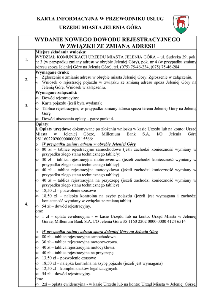 KARTA INFORMACYJNA W PRZEWODNIKU USŁUG URZĘDU MIASTA JELENIA GÓRA WYDANIE NOWEGO DOWODU REJESTRACYJNEGO W ZWIĄZKU ZE ZMIANĄ ADRESU 1. 2. 3. 4. Miejsce składania wniosku: WYDZIAŁ KOMUNIKACJI URZĘDU MIASTA JELENIA GÓRA – ul. Sudecka 29, pok. nr 3 (w przypadku zmiany adresu w obrębie Jeleniej Góry), pok. nr 4 (w przypadku zmiany adresu spoza Jeleniej Góry na Jelenią Górę), tel. (075) 75-46-234, (075) 75-46-284. Wymagane druki: • Zgłoszenie o zmianie adresu w obrębie miasta Jeleniej Góry. Zgłoszenie w załączeniu. • Wniosek o rejestrację pojazdu w związku ze zmianą adresu spoza Jeleniej Góry na Jelenią Górę. Wniosek w załączeniu. Wymagane załączniki: • Dowód rejestracyjny; • Karta pojazdu (jeśli była wydana); • Tablice rejestracyjne, w przypadku zmiany adresu spoza terenu Jeleniej Góry na Jelenią Górę • Dowód uiszczenia opłaty – patrz punkt 4. Opłaty: I. Opłaty urzędowe dokonywane po złożeniu wniosku w kasie Urzędu lub na konto: Urząd Miasta w Jeleniej Górze, Millenium Bank S.A. I/O Jelenia Góra 98116022020000000060115566: o W przypadku zmiany adresu w obrębie Jeleniej Góry • 80 zł – tablice rejestracyjne samochodowe (jeśli zachodzi konieczność wymiany w przypadku złego stanu technicznego tablic/y) • 30 zł – tablica rejestracyjna motorowerowa (jeżeli zachodzi konieczność wymiany w przypadku złego stanu technicznego tablicy) • 40 zł – tablica rejestracyjna motocyklowa (jeżeli zachodzi konieczność wymiany w przypadku złego stanu technicznego tablicy) • 40 zł – tablica rejestracyjna na przyczepę (jeżeli zachodzi konieczność wymiany w przypadku złego stanu technicznego tablicy) • 18,50 zł – pozwolenie czasowe • 18,50 zł – nalepka kontrolna na szybę pojazdu (jeżeli jest wymagana i zachodzi konieczność wymiany w związku ze zmianą tablic) • 54 zł – dowód rejestracyjny. oraz • 1 zł – opłata ewidencyjna - w kasie Urzędu lub na konto: Urząd Miasta w Jeleniej Górze, Millenium Bank S.A. I/O Jelenia Góra 35 1160 2202 0000 0000 4124 6514 o W przypadku zmiany adresu spoza Jeleniej Góry na Jelenią Górę • 80 zł – tablice rejestracyjne samochodowe • 30 zł – tablica rejestracyjna motorowerowa. • 40 zł – tablica rejestracyjna motocyklowa. • 40 zł – tablica rejestracyjna na przyczepę. • 13,50 zł – pozwolenie czasowe • 18,50 zł – nalepka kontrolna na szybę pojazdu (jeżeli jest wymagana) • 12,50 zł – komplet znaków legalizacyjnych. • 54 zł – dowód rejestracyjny. 0raz • 2zł – opłata ewidencyjna - w kasie Urzędu lub na konto: Urząd Miasta w Jeleniej Górze, Millenium Bank S.A. I/O Jelenia Góra 35 1160 2202 0000 0000 4124 6514 5. 6. 7. 8. 9. 10. 11. II. Opłaty skarbowe • brak Dokumenty do wglądu: • Dokument tożsamości: dowód osobisty z zameldowaniem na pobyt stały w Jeleniej Górze - osoba fizyczna lub zaświadczenie z ewidencji ludności potwierdzające zameldowanie na pobyt stały w Jeleniej Górze; • Aktualny odpis z KRS (wydany nie później niż 3 miesiące przed złożeniem wniosku), zaświadczenie o nadaniu nr REGON – pozostałe podmioty; • Dokument potwierdzający zawarcie umowy ubezpieczeniowej OC pojazdu Termin załatwienia sprawy: • Niezwłocznie – w terminie nie przekraczającym 1 miesiąca; • Do 2 miesięcy - sprawy szczególnie skomplikowane wymagające postępowania wyjaśniającego. Wydział realizujący wniosek: WYDZIAŁ KOMUNIKACJI URZĘDU MIASTA JELENIA GÓRA – ul. Sudecka 29, pok. nr 3 (w przypadku wydania nowego dowodu rejestracyjnego w związku ze zmianą adresu w obrębie Jeleniej Góry), pok. nr 4 (w przypadku wydania nowego dowodu rejestracyjnego w związku ze zmianą adresu spoza Jeleniej Góry na Jelenią Górę), tel. (075) 75-46-234, (075) 75-46-284. Tryb odwoławczy: Do Samorządowego Kolegium Odwoławczego, w terminie 14 dni od dnia doręczenia decyzji, za pośrednictwem organu, który wydał decyzję. Opłata za odwołanie: • brak Podstawa prawna: • Ustawa z dnia 14 czerwca 1960 r. Kodeks Postępowania Administracyjnego. (tekst jednolity: Dz. U. 2016 r. ,poz. 23 z późn.. zm.) • Ustawa z dnia 20 czerwca 1997 r. – Prawo o ruchu drogowym (tekst jednolity: Dz. U. z 2012 r. , poz. 1137 z póź. zmianami). • Ustawa z dnia 9 września 2000 r. o opłacie skarbowej (tekst jednolity Dz. U. z 2012 r., poz. 1282 z późn. zmianami). • Ustawa z dnia 22 maja 2003 r. o ubezpieczeniach obowiązkowych, Ubezpieczeniowym Funduszu Gwarancyjnym i Polskim Biurze Ubezpieczeń Komunikacyjnych (Dz. U. z 2013 r., poz. 392 z póź. zmianami). • Rozporządzenie Ministra Infrastruktury z dnia 22 lipca 2002 r. w sprawie rejestracji i oznaczenia pojazdów (tj.Dz. U. z 2014 r., poz. 1522 z póź. zmianami) • Rozporządzenie Ministra Infrastruktury z dnia 27 września 2003 r. w sprawie szczegółowych czynności organów związanych z dopuszczeniem pojazdu do ruchu oraz wzorów dokumentów w tych sprawach (tj.Dz. U. z 2014 r. , poz.1727 z póź. zmianami). • Rozporządzenie Ministra Transportu i Budownictwa z dnia 28 marca 2006 r. w sprawie wysokości opłat za kartę pojazdu (Dz. U. Nr 59, poz.421). • Rozporządzenie Ministra Infrastruktury z dnia 22 grudnia 2003 r. w sprawie wysokości opłat za wydanie dowodu rejestracyjnego, pozwolenia czasowego i tablic (tablicy) rejestracyjnych pojazdów (Dz. U. nr 230 poz. 2302 z póź. zmianami) • Rozporządzenie Ministra Spraw Wewnętrznych z dnia 15 maja 2015 r. w sprawie opłaty ewidencyjnej stanowiącej przychód Funduszu – Centralna Ewidencja Pojazdów i Kierowców ( Dz. U. z 2015 r, poz. 681 z późn. zm. ) • Rozporządzenie Ministra Transportu, Budownictwa i Gospodarki Morskiej z dnia 13 kwietnia 2012 r. w sprawie trybu legalizacji tablic rejestracyjnych oraz warunków technicznych i wzorów znaku legalizacyjnego ( Dz.U. z 2012 r. ,Poz.481) Uwagi: • Sprawę rejestracji może załatwiać wnioskodawca (właściciel lub właścic
