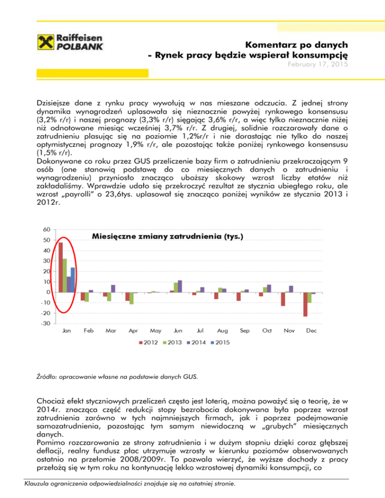 Komentarz po danych - Rynek pracy będzie wspierał konsumpcję February 17, 2015 Dzisiejsze dane z rynku pracy wywołują w nas mieszane odczucia. Z jednej strony dynamika wynagrodzeń uplasowała się nieznacznie powyżej rynkowego konsensusu (3,2% r/r) i naszej prognozy (3,3% r/r) sięgając 3,6% r/r, a więc tylko nieznacznie niżej niż odnotowane miesiąc wcześniej 3,7% r/r. Z drugiej, solidnie rozczarowały dane o zatrudnieniu plasując się na poziomie 1,2%r/r i nie dorastając nie tylko do naszej optymistycznej prognozy 1,9% r/r, ale pozostając także poniżej rynkowego konsensusu (1,5% r/r). Dokonywane co roku przez GUS przeliczenie bazy firm o zatrudnieniu przekraczającym 9 osób (one stanowią podstawę do co miesięcznych danych o zatrudnieniu i wynagrodzeniu) przyniosło znacząco uboższy skokowy wzrost liczby etatów niż zakładaliśmy. Wprawdzie udało się przekroczyć rezultat ze stycznia ubiegłego roku, ale wzrost „payrolli” o 23,6tys. uplasował się znacząco poniżej wyników ze stycznia 2013 i 2012r. Źródło: opracowanie własne na podstawie danych GUS. Chociaż efekt styczniowych przeliczeń często jest loterią, można poważyć się o teorię, że w 2014r. znacząca część redukcji stopy bezrobocia dokonywana była poprzez wzrost zatrudnienia zarówno w tych najmniejszych firmach, jak i poprzez podejmowanie samozatrudnienia, pozostając tym samym niewidoczną w „grubych” miesięcznych danych. Pomimo rozczarowania ze strony zatrudnienia i w dużym stopniu dzięki coraz głębszej deflacji, realny fundusz płac utrzymuje wzrosty w kierunku poziomów obserwowanych ostatnio na przełomie 2008/2009r. To pozwala wierzyć, że wyższe dochody z pracy przełożą się w tym roku na kontynuację lekko wzrostowej dynamiki konsumpcji, co Klauzula ograniczenia odpowiedzialności znajduje się na ostatniej stronie. znacząco wspierać będzie utrzymanie PKB powyżej 3% na początku roku i marsz w kierunku 4% r/r pod jego koniec. Źródło: Obliczenia własne na podstawie danych GUS. W tym kontekście dzisiejsze dane z rynku pracy stanowić powinny argument wspierający przeciwników obniżek stóp procentowych, ponieważ z jednej strony pokazują brak jakichkolwiek przejawów rodzenia się spirali deflacyjnej w gospodarce, z drugiej mogą zapowiadać w średnim horyzoncie stopniowe budowanie się proinflacyjnej presji popytowej. Nie sądzimy jednak, aby dane z rynku pracy były dla Rady elementem rozstrzygającym w dylemacie ciąć czy nie ciąć, zwłaszcza, że w obliczu ostatnich klarownych sugestii wydaje się, że bardziej przyjął on obecnie formułę „ciąć o 25pb czy o 50pb”. W tym dylemacie większe znaczenie może mieć naszym zdaniem ostatnie uspokojenie sytuacji na rynkach finansowych (umocnienie złotego i ponowne obawy o skalę napływu kapitału portfelowego w obliczu europejskiego QE) oraz chęć dokonania jedynie „dostosowania” stóp procentowych, nie cyklu obniżek. To, mimo wszystko, przemawiałoby zaś za większym ruchem o skali 50pb. Klauzula ograniczenia odpowiedzialności znajduje się na ostatniej stronie. Raiffeisen Polbank ul. Piękna 20. 00-549 Warszawa www.raiffeisenpolbank.com Klauzula Ograniczenia Odpowiedzialności Raiffeisen Bank Polska SA: Niniejsza wiadomość została przesłana zgodnie z Pani/Pana zleceniem. Informujemy, że zgoda na otrzymywanie informacji może zostać w każdej chwili odwołana. Jeżeli nie życzy sobie Pani/ Pan dalszego otrzymywania materiałów przygotowanych przez Zespół Analiz Ekonomicznych Raiffeisen Bank Polska S.A (dalej: RBPL lub Bank) lub niniejszy materiał został wysłany na Pani/Pana adres przez pomyłkę, prosimy o przesłanie e-maila o tytule "REZYGNACJA" na skrzynkę e-mailową: [email protected]. Opracowanie to nie stanowi oferty w rozumieniu art. 66 Kodeksu Cywilnego i zostało przesłane na podstawie ustnej zgody, która w każdej chwili może być odwołana. Ma ono charakter wyłącznie informacyjny. Powielanie bądź publikowanie go lub jego części bez pisemnej zgody Banku jest zabronione. Decyzja inwestycyjna w odniesieniu do papieru wartościowego, produktu finansowego lub inwestycji powinna być podjęta na podstawie opublikowanego prospektu emisyjnego lub kompletnej dokumentacji dla papieru wartościowego, produktu finansowego lub inwestycji. Ostateczna decyzja zawarcia transakcji należy wyłącznie do Klienta. Bank nie występuje w roli pośrednika ani przedstawiciela Klienta. Przed zawarciem każdej transakcji Klient powinien nie opierając się na informacjach przekazanych przez Bank określić jej ryzyko, potencjalne korzyści oraz straty z nią związane, jak również w szczególności charakterystykę, konsekwencje prawne, podatkowe i księgowe transakcji oraz konsekwencje zmieniających się czynników rynkowych, a także w sposób niezależny ocenić czy jest w stanie sam lub po konsultacjach ze swoimi doradcami podjąć takie ryzyko. Niniejszy dokument nie stanowi rekomendacji kupna lub sprzedaży instrumentów finansowych. Dokument, ani żadna z jego części nie stanowi podstawy do zawarcia jakiejkolwiek umowy lub powstania zobowiązania. Opracowanie to nie zastępuje niezbędnych porad odnośnie zakupu lub sprzedaży papieru wartościowego, inwestycji lub innego produktu finansowego. Analiza oparta jest na informacjach publicznie dostępnych – do jej sporządzenia nie wykorzystano żadnych informacji poufnych. Wyrażane opinie są niezależnymi opiniami Banku. W opracowaniu wykorzystano źródła informacji, które Bank uważa za wiarygodne i dokładne, lecz nie istnieje gwarancja, że są one wyczerpujące i w pełni odzwierciedlają stan faktyczny. Wykresy i diagramy przestawione w niniejszym opracowaniu mają charakter wyłącznie ilustracyjny oraz nie są doradztwem inwestycyjnym ani prognozą. Informacje zawarte w tej publikacji są aktualne na datę utworzenia dokumentu i mogą ulec zmianie w przyszłości. Analitycy zatrudnieni przez RBPL
