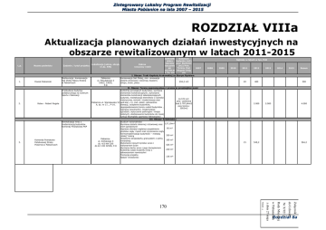 Zintegrowany Lokalny Program Rewitalizacji Miasta Pabianice na lata 2007 – 2015 ROZDZIAŁ VIIIa Aktualizacja planowanych działań inwestycyjnych na obszarze rewitalizowanym w latach 2011-2015 L.p. 1. Nazwa podmiotu Powiat Pabianicki Zadanie / tytuł projektu Restauracja i konserwacja Sali Złotej Pałacu Endera w Pabianicach Przebudowa budynku pofabrycznego na Centrum Sportu i Rekreacji 2. Rotex - Robert Rogala Rewitalizacja wraz z modernizacją budynków Komendy Powiatowej PSP 3. Komenda Powiatowa Państwowej Straży Pożarnej w Pabianicach Jednostki Kubatura miary budynku (m3) zakresu pow. Budynku Lokalizacja [adres, obręb, Zakres rzeczowe (m2) Pow. nr.dz. KW] rzeczowy robót go Terenu (ha) 2007 m2,mb,m długość dróg 3, ha, szt. ulic I. Obszar: Trakt Kapituły Krakowskiej ze Starym Rynkiem Pabianice Konserwacja Sali Złotej, min. renowacja ul. Piłsudskiego 2 stolarki drzwiowej i okiennej, boazerii, 294,2 m3 530/2, 530/6, stropu, ścian, pieca. P-8 II. Obszar: Tereny poprzemysłowe i promocja przedsiębiorczości Rozbiórka przyległych budynków, wymiana elementów konstrukcyjnych, wykonanie elementów konstrukcji zabezpieczających budynek, rewitalizacja elementów o wartości 14.570 m3 historycznej, remont i modernizacja sieci pow. użytkowa Pabianice ul. Warszawska 51 wod.kan, c.o, inst. elektr, odnowienie bud.2.787,64m2 A, dz. nr 17, , P-14, elewacji, ocieplenie budynków, pow terenu: zagospodarowanie terenu wokół budynków , 3003m2 naprawa nawierzchni, modernizacja ogrodzeń, wytyczenie parkingów i miejsc zielonych, dostosowanie budynków do nowej funkcji 9kompleks sportowo-rekreacyjny) III. Obszar: Śródmieście Studium wykonalności Wymiana stolarki okiennej i drzwiowej oraz 127,19m² Pabianice ul. Kilińskiego 4 dz. 4/2 KW 320 dz.4/1 KW 32538, P-8 bram garażowych Naprawa elewacji ceglanej-uzupełnienie ubytków cegły i spoin oraz czyszczenie cegły Termomodernizacja budynków – metodą „lekką” mokrą Ocieplenie stropodachu granulatem z wełny mineralnej Wykonanie nowych tynków wraz z malowaniem ścian Wymiana dachu wraz z jego dociepleniem Rozbiórka części budynku wraz z odtworzeniem nawierzchni Promocja projektu Nadzór inwestorski Nakłady w latach w tys. PLN 2008 2009 2010 2011 2012 20 480 2013 2014 2015 Razem 500 2.000 2.000 4.000 95 m² 339 m² 180 m² 15 549,2 564,2 426 m² 230 m² 136 m² Załącznik Nr X/92/11 do Uchwały Rady Miejskiej z dnia 27 maja w Pabianicach 2011 r. 170 Rozdział 8a Zintegrowany Lokalny Program Rewitalizacji Miasta Pabianice na lata 2007 – 2015 Nazwa podmiotu Zadanie / tytuł projektu .p. 4. Lokalizacja [adres, obręb, nr.dz. KW] Kubatura Jednostki miary budynku (m3) zakresu pow. Budynku Zakres rzeczowego (m2) Pow. rzeczowy robót m2,mb,m3, ha, Terenu (ha) 2007 szt. długość dróg ulic II. Obszar: Tereny poprzemysłowe i promocja przedsiębiorczości Nakłady w latach w tys. PLN 2008 2009 2010 2011 2012 2013 2014 2015 Razem 5.000 19.000 7.000 31.000 AFLOPA Nieruchomości sp. z o.o. sp.k. Zadanie nr 1. „Fabryka Centrum – kompleksowa rewitalizacja pofabrycznych budynków ZPW „PAWELANA” S.A. w Pabianicach oraz ich adaptacja do nowych funkcji”. 1. 2. ul. Zamkowa 2 dz. nr 8 KW LD1P/00005822/0; ul. Zamkowa 4 – dz. nr 6/5 – KW LD1P/00031615/7, P-13 3. 4. 5. 6. Wykonanie nowych elementów konstrukcyjnych w budynkach istniejących: stropy, klatki schodowe, szyby windowe, konstrukcja dachu wraz z pokryciem. Pogłębienie istniejącego podpiwniczenia. Roboty ziemne – wykonanie nowej infrastruktury (gaz, woda, kanalizacja, ciepło, energia elektryczna). Rewitalizacja elewacji ceglanej. Wykonanie nowego pięciokondygnacyjnego obiektu. Roboty instalacyjne i wykończeniowe wewnętrzne. Zadanie nr 2. „Rekonstrukcja historyczna, funkcjonalna i estetyczna ul. Lipowej” ul. Lipowa -dz. nr 7, P-13 Wykonanie remontu ul. Lipowej (wymiana podbudowy, wykonanie nowej nawierzchni, instalacja oświetlenia). Zadanie nr 3. „Zabezpieczenie potrzeb ul. Zamkowa 4 - dz. nr 6/5 - KW parkingowych Fabryki LD1P/00031615/7, P-13 Centrum oraz SIŁOWNI”. Zadanie nr 4. „Modernizacja i przystosowanie ul. Grobelnej do obsługi komunikacyjnej ul. Grobelna na odcinku od ul. zrewitalizowanych terenów Kilińskiego do ul. Piotra Skargi – poprzemysłowych”. dz. nr 9/2, P-13 Wykonanie parkingu wraz z podbudową, oświetleniem i odwodnieniem. 10.000m² Budowa zjazdu na parking z pasem bezpiecznego włączenia/wyłączenia do/z ruchu. 2. Zapewnienie miejsc parkingowych Szkole Muzycznej w Pabianicach. 3. Zmiana organizacji ruchu Zadanie nr 5. „Oczyszczenie 1. Zabiegi pielęgnacyjne koryta wraz z odnowieniem zieleni (prześwietlanie nadbrzeży rzeki Dobrzynki”. korony krzewów, nowe Rzeka Dobrzynka na odcinku od nasadzenia). Parku im. Juliusza Słowackiego do 2. Mechaniczne oczyszczenie Parku im. Feliksa Kruschego. P-13 koryta. 3. Wymiana elementów nabrzeży. Zadanie nr 6. „Adaptacja ul. Zamkowa 4 - dz. nr 6/5 - KW 1. Wymiana niektórych istniejącego budynku LD1P/00031615/7, P-13 elementów konstrukcyjnych pofabrycznego do funkcji sali (dach). koncertowo-widowiskowej 2. Wykonanie nowych SIŁOWNIA”. elementów konstrukcyjnych zabezpieczających budynek. 3. Rewitalizacja elementów o wartości historycznej(sufit kasetonowy, elewacja ceglana). 4. Dostosowanie budynku do nowej funkcji. 1400m² 1.000 1.000 2.000 16.498 m² 500 1.500 2.000 1. 300 mb 2000m² 500 500 500 500 4.000 3.000 171 Rozdział 8a 7.000 Zintegrowany Lokalny Program Rewitalizacji Miasta Pabianice na lata 2007 – 2015 Nazwa podmiotu .p. 5. Zadanie / tytuł projektu Zadanie nr 7. „Budowa Centrum HandlowoUsługowego”. Firma „Bartek” Paweł Miszczak Lokalizacja [adres, obręb, nr.dz. KW] Zakres rzeczowy robót 1. Opracowanie projektów wykonawczych. 2. Zabezpieczenie gruntu dla ul. Zamkowa 4 - dz. nr 6/5 - KW potrzeb budowy Centrum. LD1P/00031615/7, P-13 3. Wybór wykonawców inwestycji. 4. Budowa Centrum Zadanie nr 8. „Odnowienie 1. Oczyszczenie elewacji ze el