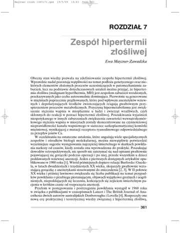 Mayzner rozdz 1465(7).qxd 19/5/09 16:43 Page 361 ROZDZIA¸ 7 Zespó∏ hipertermii z∏oÊliwej Ewa Mayzner-Zawadzka Obecny stan wiedzy pozwala na zdefiniowanie zespo∏u hipertermii z∏oÊliwej. Wprawdzie nadal pozostajà wàtpliwoÊci na temat pod∏o˝a genetycznego oraz niektórych elementów z∏o˝onych procesów uczestniczàcych w patomechanizmie zaburzeƒ, lecz na podstawie dotychczasowych ustaleƒ mo˝na przyjàç, ˝e hipertermia z∏oÊliwa (malignant hyperthermia, MH) jest zespo∏em zaburzeƒ wrodzonych, przekazywanych jako cecha autosomalnie dominujàca. Pierwotnie sà generowane w mi´Êniach poprzecznie prà˝kowanych, które pod wp∏ywem anestetyków wziewnych i depolaryzujàcych Êrodków zwiotczajàcych reagujà gwa∏townym przyspieszeniem procesów metabolicznych. Przyczynà hipermetabolizmu jest zwi´kszenie st´˝enia wapnia w mioplazmie u ludzi i zwierzàt wra˝liwych, czyli sk∏onnych do reakcji w postaci hipertermii z∏oÊliwej. Poszukiwania wyjaÊnieƒ niespotykanego w innych zaburzeniach zwi´kszenia zawartoÊci wewnàtrzkomórkowego st´˝enia wapnia w miocytach zosta∏y skoncentrowane na czynnoÊciowej nieprawid∏owoÊci kana∏u wapniowego w siateczce sarkoplazmatycznej komórki mi´Êniowej, wynikajàcej z mutacji receptora ryanodinowego odpowiedzialnego za przep∏yw jonów Ca. W oczekiwaniu na ostateczne ustalenia, które anga˝ujà wiele specjalistycznych zespo∏ów i oÊrodków biologii molekularnej, mo˝na niewàtpliwie potwierdziç wczeÊniejsze sugestie wyst´powania najcz´Êciej Êmiertelnego w skutkach powik∏ania narkozy od czasów, kiedy zosta∏a ona wprowadzona do praktyki. Poszukujàc dowodów retrospektywnych, nie sposób nie zatrzymaç si´ nad opisami gwa∏townie pojawiajàcej si´ goràczki podczas operacji i po niej, przede wszystkim u dzieci poddawanych wziewnej anestezji. Jeden z pierwszych dost´pnych artyku∏ów opublikowano w 1900 roku [1]. WÊród póêniejszych dopiero relacje Burforda i Guedela, w latach dwudziestych i trzydziestych XX wieku, skojarzy∏y gwa∏townie wzrastajàcà goràczk´ z anestetykami stosowanymi do znieczulenia [2, 3]. W II po∏owie XX wieku i póêniej lawinowo zwi´ksza∏a si´ liczba publikacji na temat przypadków powik∏ania o przebiegu piorunujàcym, objawach wyjàtkowo groênych i uogólnionych, niepoddajàcych si´ leczeniu, koƒczàcych si´ zejÊciem Êmiertelnym pacjenta w krótkim czasie od rozpocz´cia anestezji. Prze∏om w post´powaniu i postrzeganiu powik∏ania wystàpi∏ w 1960 roku w zwiàzku z publikacjami w czasopismach Lancet i The British Journal of Anaesthesia dwóch autorów australijskich Denborougha i Lovella [4]. Rozpocz´∏y one nowà er´ praktycznej i teoretycznej wiedzy zwiàzanej z hipertermià z∏oÊliwà, 361 Mayzner rozdz 1465(7).qxd 19/5/09 16:43 Page 362 w tym terminologii. A wszystko wzi´∏o si´ ze skrupulatnoÊci lekarzy anestezjologów i rzetelnie przeprowadzonego wywiadu oraz konsekwentnego post´powania. Problem dotyczy∏ m∏odego ch∏opca, który wymaga∏ operacji zespolenia koÊci z powodu z∏amania koƒczyny dolnej. Pacjent z przera˝eniem opowiada∏ lekarzom o niewyjaÊnionych zgonach krewnych poddawanych operacjom w znieczuleniu. Anestezjolodzy, Êwiadomi mo˝liwoÊci wystàpienia trudnego do zdefiniowania powik∏ania, uÊpili ch∏opca halotanem i wkrótce rozpocz´li heroicznà walk´ z pe∏noobjawowym zespo∏em hipertermii z∏oÊliwej. Wczesne rozpoznanie i wielokierunkowe leczenie objawowe pozwoli∏y uratowaç ch∏opca. JednoczeÊnie na Êwiat∏o dzienne wydobyto wiele sytuacji medycznych, sk∏adajàcych si´ na niezwykle z∏o˝ony problem, jaki stanowi hipertermia z∏oÊliwa. W zwiàzku z tym podj´to wszechstronne badania doÊwiadczalne w zakresie wielu dziedzin teoretycznych oraz dociekania kliniczne. W Êlad za wskazaniami autorów australijskich potwierdzono patogenez´ mi´Êniowà patologii oraz uwarunkowania dziedziczne. Dalszy post´p w badaniach nastàpi∏ dzi´ki odkryciu w 1970 roku modelu doÊwiadczalnego. Sà nim trzy gatunki Êwiƒ bardzo podatne na warunki stresowe: Landrace, Poland China i Pietrain. Zwierz´ta pos∏u˝y∏y jako doskona∏y materia∏ do badaƒ obejmujàcych patomechanizmy zaburzeƒ, diagnostyk´ i terapi´ dantrolenem sodu. Kolejnym etapem kontynuowanych obecnie badaƒ sà ustalenia dotyczàce genetyki i identyfikacji genów odpowiedzialnych za podatnoÊç na hipertermi´ z∏oÊliwà, czyli mutacj´ receptora ryanodinowego, regulujàcego przep∏yw wewnàtrzkomórkowy jonów wapnia. Patogeneza i patomechanizm zaburzeƒ w hipertermii z∏oÊliwej Odkrycie i wykorzystanie modelu doÊwiadczalnego do badaƒ nad patogenezà hipertermii z∏oÊliwej stanowi∏y prze∏om w dalszych pracach badawczych. Umo˝liwi∏y zdefiniowanie zespo∏u zaburzeƒ oraz okreÊlenie defektu genetycznego wp∏ywajàcego na wyst´powanie gwa∏townych objawów Êwiadczàcych o nag∏ym przyspieszeniu procesów metabolicznych. Badania doÊwiadczalne wykaza∏y, ˝e podstawowym ogniwem w patofizjologii hipertermii z∏oÊliwej jest niekontrolowane zwi´kszenie wewnàtrzkomórkowego st´˝enia jonów wapnia w mi´Êniach poprzecznie prà˝kowanych. Bardzo wiele prac eksperymentalnych, prowadzonych u Êwiƒ wra˝liwych na wziewne anestetyki i sukcynylocholin´, czyli nale˝àcych do tzw. ras mi´snych, zmierza∏o do ustalenia nieprawid∏owoÊci w budowie komórek mi´Êniowych, które mog∏yby usposabiaç do zaburzeƒ przep∏ywu jonów wapnia. Najwi´kszà patologi´ odnajdowano w nast´pujàcych strukturach wewnàtrzkomórkowych: siateczka Êródplazmatyczna – wykazywa∏a brak w∏aÊciwoÊci zatrzymywania i gromadzenia jonów wapnia przy jednoczesnym ponad 500-krotnym zwi´kszeniu uwalniania jonów wapnia, 362 Mayzner rozdz 1465(7).qxd 19/5/09 16:43 Page 363 mitochondria – wykazywa∏y zmniejszony potencja∏ wychwytywania jonów wapnia, sarkolemma o cechach nadmiernej wra˝liwoÊci na uwalniane jony