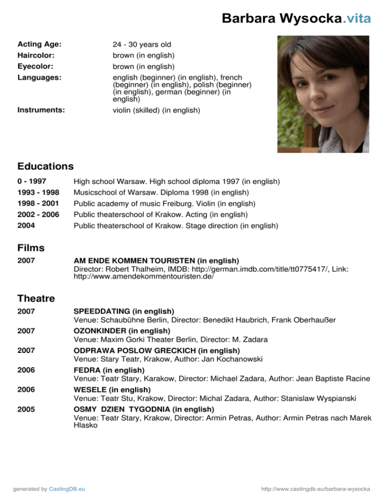 Barbara Wysocka.vita Acting Age: 24 - 30 years old Haircolor: brown (in english) Eyecolor: brown (in english) Languages: english (beginner) (in english), french (beginner) (in english), polish (beginner) (in english), german (beginner) (in english) Instruments: violin (skilled) (in english) Educations 0 - 1997 High school Warsaw. High school diploma 1997 (in english) 1993 - 1998 Musicschool of Warsaw. Diploma 1998 (in english) 1998 - 2001 Public academy of music Freiburg. Violin (in english) 2002 - 2006 Public theaterschool of Krakow. Acting (in english) 2004 Public theaterschool of Krakow. Stage direction (in english) Films 2007 AM ENDE KOMMEN TOURISTEN (in english) Director: Robert Thalheim, IMDB: http://german.imdb.com/title/tt0775417/, Link: http://www.amendekommentouristen.de/ Theatre 2007 SPEEDDATING (in english) Venue: Schaubühne Berlin, Director: Benedikt Haubrich, Frank Oberhaußer 2007 OZONKINDER (in english) Venue: Maxim Gorki Theater Berlin, Director: M. Zadara 2007 ODPRAWA POSLOW GRECKICH (in english) Venue: Stary Teatr, Krakow, Author: Jan Kochanowski 2006 FEDRA (in english) Venue: Teatr Stary, Karakow, Director: Michael Zadara, Author: Jean Baptiste Racine 2006 WESELE (in english) Venue: Teatr Stu, Krakow, Director: Michal Zadara, Author: Stanislaw Wyspianski 2005 OSMY DZIEN TYGODNIA (in english) Venue: Teatr Stary, Krakow, Director: Armin Petras, Author: Armin Petras nach Marek Hlasko generated by CastingDB.eu http://www.castingdb.eu/barbara-wysocka Barbara Wysocka.vita 2005 KSIADZ MAREK (in english) Venue: Teatr Stary, Krakow, Director: Michal Zadara, Author: Juliusz Slowacki 2004 KAMIEN I POPIOLY (in english) Venue: Teatr Polski, Bydgoszcz, Director: Iwona Kempa, Author: Daniel Danis 2004 KOREK (Lembouteillage) (in english) Venue: Teatr Stary, Krakow, Director: Anne-Laure Liegois, Author: verschiedene 2003 HAMLET MASCHINE (in english) Venue: Teatr PWST, Krakow, Author: Heiner Muller generated by CastingDB.eu http://www.castingdb.eu/barbara-wysocka