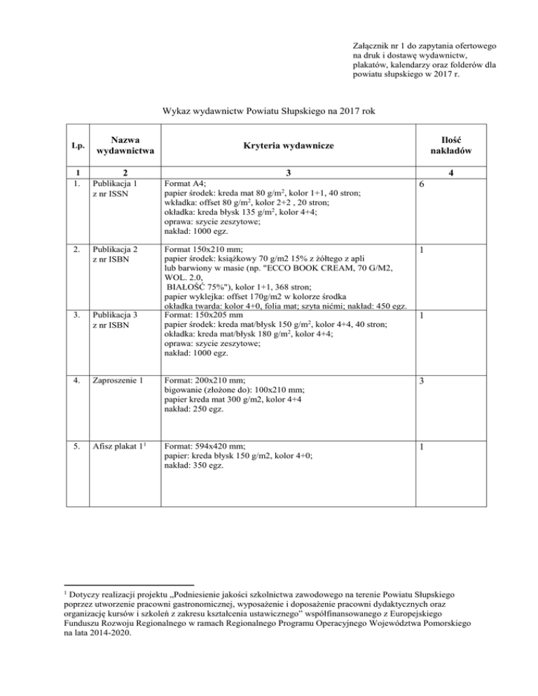 Załącznik nr 1 do zapytania ofertowego na druk i dostawę wydawnictw, plakatów, kalendarzy oraz folderów dla powiatu słupskiego w 2017 r. Wykaz wydawnictw Powiatu Słupskiego na 2017 rok Lp. 1 1. Nazwa wydawnictwa 2 Ilość nakładów Kryteria wydawnicze 3 4 Publikacja 1 z nr ISSN Format A4; papier środek: kreda mat 80 g/m2, kolor 1+1, 40 stron; wkładka: offset 80 g/m2, kolor 2+2 , 20 stron; okładka: kreda błysk 135 g/m2, kolor 4+4; oprawa: szycie zeszytowe; nakład: 1000 egz. 6 2. Publikacja 2 z nr ISBN 1 3. Publikacja 3 z nr ISBN Format 150x210 mm; papier środek: książkowy 70 g/m2 15% z żółtego z apli lub barwiony w masie (np. "ECCO BOOK CREAM, 70 G/M2, WOL. 2.0, BIAŁOŚĆ 75%"), kolor 1+1, 368 stron; papier wyklejka: offset 170g/m2 w kolorze środka okładka twarda: kolor 4+0, folia mat; szyta nićmi; nakład: 450 egz. Format: 150x205 mm papier środek: kreda mat/błysk 150 g/m2, kolor 4+4, 40 stron; okładka: kreda mat/błysk 180 g/m2, kolor 4+4; oprawa: szycie zeszytowe; nakład: 1000 egz. 4. Zaproszenie 1 Format: 200x210 mm; bigowanie (złożone do): 100x210 mm; papier kreda mat 300 g/m2, kolor 4+4 nakład: 250 egz. 3 5. Afisz plakat 11 Format: 594x420 mm; papier: kreda błysk 150 g/m2, kolor 4+0; nakład: 350 egz. 1 1 Dotyczy realizacji projektu „Podniesienie jakości szkolnictwa zawodowego na terenie Powiatu Słupskiego poprzez utworzenie pracowni gastronomicznej, wyposażenie i doposażenie pracowni dydaktycznych oraz organizację kursów i szkoleń z zakresu kształcenia ustawicznego” współfinansowanego z Europejskiego Funduszu Rozwoju Regionalnego w ramach Regionalnego Programu Operacyjnego Województwa Pomorskiego na lata 2014-2020. 1 Lp. Nazwa wydawnictwa Ilość nakładów Kryteria wydawnicze 6. Afisz plakat 22 Format: 594x420 mm; papier: kreda błysk 150 g/m2, kolor 4+0; nakład: 350 egz. 1 7. Afisz plakat 3 Format: 594x420 mm; papier: kreda błysk 150 g/m2, kolor 4+0; nakład: 250 egz. 3 8. Publikacja 4 z nr ISBN Format: 210x210 mm papier środek: kreda mat 150 g/m², kolor 4+4, 48 stron papier okładka: kreda mat 300 g/m2 + folia mat, kolor 4+4, 4 strony oprawa: szycie zeszytowe nakład: 1000 egz. 1 9. Zaproszenie 2 Format: 297x105 mm; bigowanie (złożone do): 148,5x105 mm; papier: kreda mat 300 g/m2 + folia mat, kolor 4+4 nakład: 500 egz. 1 10. Zaproszenie 3 Format: 297x105 mm; bigowanie (złożone do): 148,5x105 mm; papier: kreda mat 300 g/m2 + folia mat, kolor 4+4 nakład: 500 egz. 1 11. Kartka okolicznościowa Format: 270x135 mm; 1 1 bigowanie (złożone do: 135x135 mm); papier kreda mat 350 g/m2 + folia mat + złocenie lub srebrzenie kolor 4+4; nakład: 800 egz. Format: 310x765 mm, papier główka: 310x210 mm kreda mat/błysk 1 250 g/m2 + folia mat/błysk; kolor 4+0 oklejana na kartonie; podkład pod kalendarium: 310x555 mm karton 300 g/m2, kolor 4+0; Kalendarium zrywalne: 3 komplety po 12 arkuszy każdy formatu 290x144 mm, z usztywnionym kartonikiem od spodu, papier: offset 80 g/m2, kolor 2+0, Pierwszy arkusz: od grudnia 2017 do listopada 2017, drugi: od stycznia 2018 do grudnia 2018, trzeci: od lutego 2018 do stycznia 2019 roku." otwór w główce kalendarza do powieszenia na ścianie; Przesuwane okienko na pasku z folii. Nakład 600 egz. 12. Kalendarz ścienny trójdzielny Dotyczy realizacji projektu: „Podniesienie jakości szkolnictwa zawodowego na terenie Powiatu Słupskiego na potrzeby rynku pracy” współfinansowanego z Europejskiego Funduszu Społecznego w ramach Regionalnego Programu Operacyjnego Województwa Pomorskiego na lata 2014-2020. 2 Lp. Nazwa wydawnictwa Ilość nakładów Kryteria wydawnicze 13. Publikacja 5 z nr ISBN Format: 210x210 mm, Papier środek: kreda mat /błysk 170 g/m2, kolor 4+4, 72 strony Oprawa twarda + folia błysk, kolor 4+0, szyta nicią Papier wklejka: offset 120g/m2, kolor 4+0 Nakład: 1000 egz. 14. Teczka Format: 430 x 307 mmBigowanie (po złożeniu: 215 x 307 1 mm)Papier: 350 g/m2, folia, Środek: trójkątna przeźroczysta kieszeń Nakład: 800 szt. 15. Ulotka 13 Format: 297x210 mmm Bigowanie (złożone do: 99 x 210 mm), Papier: kreda mat 170 g/m2, kolor 4+4 Nakład: 1000 1 16. Ulotka 2 Format: 420x297 mm; bigowanie (złożone do): 297x140 mm; papier: kreda mat 170 g/m2, kolor 4+4; nakład: 1000 egz. 1 17. Publikacja 6 z nr ISBN Format: 225x225 mm; papier środek: kreda mat 200 g/m2, kolor 4+4, 24 strony; papier okładka: kreda mat 300 g/m2 +lakier UV wybiórczo, kolor 4+4, 4 strony; oprawa: szycie zeszytowe; nakład: 500 egz. Zestaw 10 widokówek, zapakowanych w składane pudełko; widokówka, Format: A6; papier: karton 300 g/m² + folia błysk/mat jednostronnie, kolor 4+1; pudełko – papier kreda mat 200 g/m² + folia mat + lakier UV wybiórczo, kolor 4+1; nakład: 1000 egz Format: A2, jednoplanszowy papier: kreda mat 250 g/m2, kolor 4+0 + okucie z góry (z zawieszką) i z dołu (listwowany) nakład: 250 egz. 2 Format 50x90 mm papier: karton mat 300 g/m2, kolor 4+0; nakład: 250 egz. 2 18. Zestaw widokówek 19. Kalendarz jednoplanszowy 20. Wizytówki 1 1 1 Dotyczy realizacji projektu: „Podniesienie jakości szkolnictwa zawodowego na terenie Powiatu Słupskiego na potrzeby rynku pracy” współfinansowanego z Europejskiego Funduszu Społecznego w ramach Regionalnego Programu Operacyjnego Województwa Pomorskiego na lata 2014-2020. 3