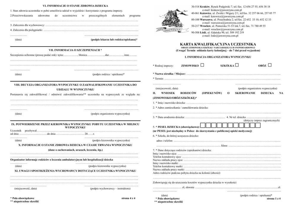 VI. INFORMACJE O STANIE ZDROWIA DZIECKA 30-518 Kraków, Rynek Podgórski 7, tel./fax. 12 656 27 55, 656 38 18 e-mail: [email protected] 40-061 Katowice, ul. Żwirki i Wigury 2/1, tel/fax. 32 257 06 66, 257 05 77 e-mail: [email protected] 00-100 Warszawa, ul. Przechodnia 2, tel/fax. 22 652 33 10, 652 12 33 e-mail: [email protected] 50-217 Wrocław, ul. Pomorska 51-53 lok.7, tel./fax. 71 780 49 55 e-mail: wrocł[email protected] 90-508 Łódź, ul. Gdańska 90, tel. 509 192 219 e-mail: [email protected] 1. Stan zdrowia uczestnika w pełni umożliwia udział w wyjeździe i korzystanie z programu imprezy. 2.Przeciwwskazania zdrowotne do uczestnictwa w poszczególnych elementach programu ………………………………………………………………………………………………………………………... 3. Zalecenia dla wychowawcy: ………………………………………………………………………………………. 4. Zalecenia dla pielęgniarki: ………………………………………………………………........................................ ……………… (data) …………………………………………………. (podpis lekarza lub rodzica/opiekuna)* KARTA KWALIFIKACYJNA UCZESTNIKA OBOZU/ZIMOWISKA/SZKÓŁKI NARCIARSKIEJ LUB SNOWBOARDOWEJ VII. INFORMACJA O SZCZEPIENIACH * (Uwaga! Termin oddania karty kolonijnej – do 7 dni przed wyjazdem) Szczepienia ochronne (proszę podać rok): tężec……………, błonica………………, dur……………, inne……... I. INFORMACJA ORGANIZATORA WYPOCZYNKU ………………………………………………………………………………………………..……………………… ………………………………………………………………………………………………………………………. ………………… (data) * Rodzaj imprezy: ZIMOWISKO …………………………………………………………… (podpis rodzica / opiekuna)* □ SZKÓŁKA □ OBÓZ □ * Nazwa ośrodka / Miejsce: ………………………………………………………………………………………... * Termin: …………………………………………………………………………………………………………….. VIII. DECYZJA ORGANIZATORA WYPOCZYNKU O ZAKWALIFIKOWANIU UCZESTNIKA DO ………………………… …………………………………………. UDZIAŁU W WYPOCZYNKU (miejscowość, data) (podpis organizatora wypoczynku) Postanawia się zakwalifikować / odmówić zakwalifikowania** uczestnika na wypoczynek ze względu na: II. ………………………………………………………………………………………………………………………... (ZIMOWISKO/OBÓZ/SZKÓŁKĘ)* ………………………………………………………………………………………………………………………. 1. * Imię i nazwisko dziecka: ………………………………………………………………………………………… ……………… 2. * Adres zamieszkania / zameldowania dziecka: (data) …………………………………………………. (podpis organizatora wypoczynku) WNIOSEK RODZICÓW (OPIEKUNÓW) O SKIEROWANIE DZIECKA NA …………………………………………………………………………………………………………....................... 3. * Data urodzenia dziecka: …………………………................. 4. Nr tel. dziecka …............................................. (dotyczy imprez zagranicznych) IX. POTWIERDZENIE PRZEZ KIEROWNIKA WYPOCZYNKU POBYTU UCZESTNIKA W MIEJSCU WYPOCZYNKU Uczestnik przebywał…………………………………………………………………………………………………. od dnia …………………………do dnia ………………………… 20……r. ……………… …………………………………………………. (data) (podpis kierownika wypoczynku) X. INFORMACJE O STANIE ZDROWIA DZIECKA W CZASIE TRWANIA WYPOCZYNKU (dane o zachowaniach, urazach, leczeniu, itp.) …………………………………………………………………………………........................................................... …................................................................................................................................................................................... Organizator informuje rodziców o leczeniu ambulatoryjnym lub hospitalizacji dziecka ……………… ………………………………………………………….. (data) (podpis kierownika wypoczynku) XI. UWAGI I SPOSTRZEŻENIA WYCHOWAWCY DOTYCZĄCE UCZESTNIKA WYPOCZYNKU ……………………………………………………………………………………………………………………....... …………………………….………………………………………………………………………………………….. ………………………………………………………………………………………………………………………... ………………………………… …………………………………………………. (miejscowość, data) (podpis wychowawcy – instruktora) * Pola obowiązkowe ** niepotrzebne skreślić strona 4 z 4 5. * PESEL DZIECKA (obowiązkowo): (nr PESEL jest niezbędny w Polsce do skorzystania z publicznej opieki medycznej) 6. * Szkoła, do której uczęszcza dziecko: adres i telefon: ………………………………………………………………………………………………......... …………………………………………………………… klasa: ……………………………………………...… 7. * Dane dotyczące rodziców (opiekunów) dziecka: Imię i nazwisko ojca: ……………………………………………………………