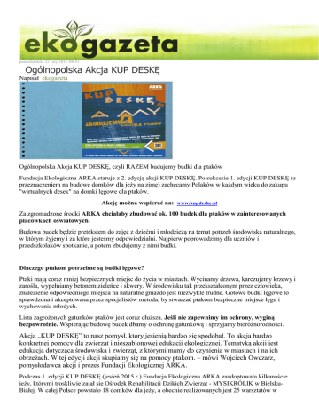 poniedziałek, 22 luty 2016 08:41 Ogólnopolska Akcja KUP DESKĘ Napisał ekogazeta Ogólnopolska Akcja KUP DESKĘ, czyli RAZEM budujemy budki dla ptaków Fundacja Ekologiczna ARKA staruje z 2. edycją akcji KUP DESKĘ. Po sukcesie 1. edycji KUP DESKĘ (z przeznaczeniem na budowę domków dla jeży na zimę) zachęcamy Polaków w każdym wieku do zakupu "wirtualnych desek" na domki lęgowe dla ptaków. Akcję można wspierać na: www.kupdeske.pl Za zgromadzone środki ARKA chciałaby zbudować ok. 100 budek dla ptaków w zainteresowanych placówkach oświatowych. Budowa budek będzie pretekstem do zajęć z dziećmi i młodzieżą na temat potrzeb środowiska naturalnego, w którym żyjemy i za które jesteśmy odpowiedzialni. Najpierw poprowadzimy dla uczniów i przedszkolaków spotkanie, a potem zbudujemy z nimi budki. Dlaczego ptakom potrzebne są budki lęgowe? Ptaki mają coraz mniej bezpiecznych miejsc do życia w miastach. Wycinamy drzewa, karczujemy krzewy i zarośla, wypełniamy betonem zieleńce i skwery. W środowisku tak przekształconym przez człowieka, znalezienie odpowiedniego miejsca na naturalne gniazdo jest niezwykle trudne. Gotowe budki lęgowe to sprawdzona i akceptowana przez specjalistów metoda, by stwarzać ptakom bezpieczne miejsce lęgu i wychowania młodych. Lista zagrożonych gatunków ptaków jest coraz dłuższa. Jeśli nie zapewnimy im ochrony, wyginą bezpowrotnie. Wspierając budowę budek dbamy o ochronę gatunkową i sprzyjamy bioróżnorodności. Akcja „KUP DESKĘ” to nasz pomysł, który jesienią bardzo się spodobał. To akcja bardzo konkretnej pomocy dla zwierząt i nieszablonowej edukacji ekologicznej. Tematyką akcji jest edukacja dotycząca środowiska i zwierząt, z którymi mamy do czynienia w miastach i na ich obrzeżach. W tej edycji akcji skupiamy się na pomocy ptakom. – mówi Wojciech Owczarz, pomysłodawca akcji i prezes Fundacji Ekologicznej ARKA. Podczas 1. edycji KUP DESKĘ (jesień 2015 r.) Fundacja Ekologiczna ARKA zaadoptowała kilkanaście jeży, którymi troskliwie zajął się Ośrodek Rehabilitacji Dzikich Zwierząt - MYSIKRÓLIK w BielskuBiałej. W całej Polsce powstało 18 domków dla jeży, a obecnie realizowanych jest 25 warsztatów w szkołach, by młodzi ludzie z jeszcze większym zapałem zaangażowali się w ochronę jeży następnej zimy by zrozumieli potrzeby tych zwierząt, również zagrożonych wyginięciem.