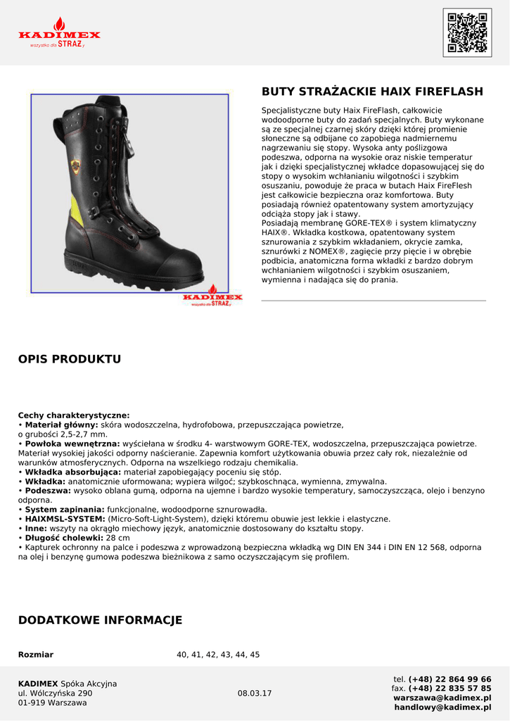 BUTY STRAŻACKIE HAIX FIREFLASH Specjalistyczne buty Haix FireFlash, całkowicie wodoodporne buty do zadań specjalnych. Buty wykonane są ze specjalnej czarnej skóry dzięki której promienie słoneczne są odbijane co zapobiega nadmiernemu nagrzewaniu się stopy. Wysoka anty poślizgowa podeszwa, odporna na wysokie oraz niskie temperatur jak i dzięki specjalistycznej wkładce dopasowującej się do stopy o wysokim wchłanianiu wilgotności i szybkim osuszaniu, powoduje że praca w butach Haix FireFlesh jest całkowicie bezpieczna oraz komfortowa. Buty posiadają również opatentowany system amortyzujący odciąża stopy jak i stawy. Posiadają membranę GORE-TEX® i system klimatyczny HAIX®. Wkładka kostkowa, opatentowany system sznurowania z szybkim wkładaniem, okrycie zamka, sznurówki z NOMEX®, zagięcie przy pięcie i w obrębie podbicia, anatomiczna forma wkładki z bardzo dobrym wchłanianiem wilgotności i szybkim osuszaniem, wymienna i nadająca się do prania. OPIS PRODUKTU Cechy charakterystyczne: • Materiał główny: skóra wodoszczelna, hydrofobowa, przepuszczająca powietrze, o grubości 2,5-2,7 mm. • Powłoka wewnętrzna: wyściełana w środku 4- warstwowym GORE-TEX, wodoszczelna, przepuszczająca powietrze. Materiał wysokiej jakości odporny naścieranie. Zapewnia komfort użytkowania obuwia przez cały rok, niezależnie od warunków atmosferycznych. Odporna na wszelkiego rodzaju chemikalia. • Wkładka absorbująca: materiał zapobiegający poceniu się stóp. • Wkładka: anatomicznie uformowana; wypiera wilgoć; szybkoschnąca, wymienna, zmywalna. • Podeszwa: wysoko oblana gumą, odporna na ujemne i bardzo wysokie temperatury, samoczyszcząca, olejo i benzyno odporna. • System zapinania: funkcjonalne, wodoodporne sznurowadła. • HAIXMSL-SYSTEM: (Micro-Soft-Light-System), dzięki któremu obuwie jest lekkie i elastyczne. • Inne: wszyty na okrągło miechowy język, anatomicznie dostosowany do kształtu stopy. • Długość cholewki: 28 cm • Kapturek ochronny na palce i podeszwa z wprowadzoną bezpieczna wkładką wg DIN EN 344 i DIN EN 12 568, odporna na olej i benzynę gumowa podeszwa bieżnikowa z samo oczyszczającym się profilem. DODATKOWE INFORMACJE Rozmiar KADIMEX Spóka Akcyjna ul. Wólczyńska 290 01-919 Warszawa 40, 41, 42, 43, 44, 45 08.03.17 tel. (+48) 22 864 99 66 fax. (+48) 22 835 57 85 [email protected] [email protected]