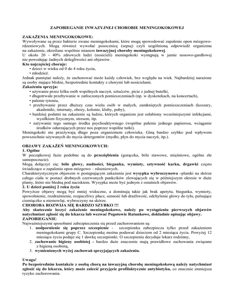 ZAPOBIEGANIE INWAZYJNEJ CHOROBIE MENINGOKOKOWEJ ZAKAśENIA MENINGOKOKOWE: Wywoływane są przez bakterie zwane meningokokami, które mogą spowodować zapalenie opon mózgowordzeniowych. Mogą równieŜ wywołać posocznicę (sepsę) czyli uogólnioną odpowiedź organizmu na zakaŜenie, określane wspólnie mianem inwazyjnej choroby meningokokowej. U około 20 - 40% zdrowych ludzi (nosicieli) meningokoki występują w jamie nosowo-gardłowej nie powodując Ŝadnych dolegliwości ani objawów. Kto najczęściej choruje: • dzieci w wieku od 0 do 4 roku Ŝycia, • młodzieŜ. Jednak pamiętać naleŜy, Ŝe zachorować moŜe kaŜdy człowiek, bez względu na wiek. Najbardziej naraŜone są osoby mające bliskie, bezpośrednie kontakty z chorymi lub nosicielami. ZakaŜeniu sprzyja: • uŜywanie przez kilka osób wspólnych naczyń, sztućców, picie z jednej butelki, • długotrwałe przebywanie w zatłoczonych pomieszczeniach (np. w dyskotekach, na koncertach), • palenie tytoniu, • przebywanie przez dłuŜszy czas wielu osób w małych, zamkniętych pomieszczeniach (koszary, akademiki, internaty, obozy, kolonie, kluby, puby), • bardziej podatni na zakaŜenie są ludzie, których organizm jest osłabiony wcześniejszymi infekcjami, wysiłkiem fizycznym, stresem, itp. • zaŜywanie tego samego środka psychoaktywnego (wspólne palenie jednego papierosa, wciąganie środków odurzających przez nos poprzez wspólne tutki). Meningokoki nie przeŜywają długo poza organizmem człowieka. Giną bardzo szybko pod wpływem powszechnie uŜywanych do mycia detergentów (mydło, płyn do mycia naczyń, itp.). OBJAWY ZAKAśEŃ MENINGOKOWYCH: 1. Ogólne W początkowej fazie podobne są do przeziębienia (gorączka, bóle stawowe, mięśniowe, ogólne złe samopoczucie). Mogą dołączyć się: bóle głowy, nudności, biegunka, wymioty, sztywność karku, drgawki często świadczące o zapaleniu opon mózgowo – rdzeniowych. Charakterystycznym objawem w postępującym zakaŜeniu jest wysypka wybroczynowa –plamki na skórze całego ciała w postaci drobnych czerwonych punkcików zlewających się w późniejszym okresie w duŜe plamy, które nie bledną pod naciskiem. Wysypka moŜe być jednym z ostatnich objawów. 2. U dzieci poniŜej 2 roku Ŝycia PowyŜsze objawy mogą być mniej widoczne, a dominują takie jak brak apetytu, biegunka, wymioty, spowolnienie, rozdraŜnienie, rozpaczliwy płacz, senność lub draŜliwość, odchylenie głowy do tyłu, pulsujące ciemiączko u niemowląt, wybroczyny na skórze. CHOROBA ROZWIJA SIĘ BARDZO SZYBKO !!! Aby skutecznie leczyć zakaŜenie meningokokowe, naleŜy po wystąpieniu pierwszych objawów natychmiast zgłosić się do lekarza lub wezwać Pogotowie Ratunkowe, dokładnie opisując objawy. ZAPOBIEGANIE: NajwaŜniejszymi sposobami zabezpieczenia się przed zachorowaniem są: 1. uodpornienie się poprzez szczepienie - szczepionka zabezpiecza tylko przed zakaŜeniem meningokokami grupy C. Szczepionkę moŜna podawać dzieciom od 2 miesiąca Ŝycia. PowyŜej 12 miesiąca Ŝycia podaje się 1 dawkę szczepionki. O szczepieniu decyduje lekarz rodzinny, 2. zachowanie higieny osobistej - bardzo duŜe znaczenie mają prawidłowe zachowania związane z higieną osobistą, 3. wymienionych wyŜej zachowań sprzyjających zakaŜeniu. Uwaga! Po bezpośrednim kontakcie z osobą chorą na inwazyjną chorobę meningokokową naleŜy natychmiast zgłosić się do lekarza, który moŜe zalecić przyjęcie profilaktycznie antybiotyku, co znacznie zmniejsza ryzyko zachorowania.