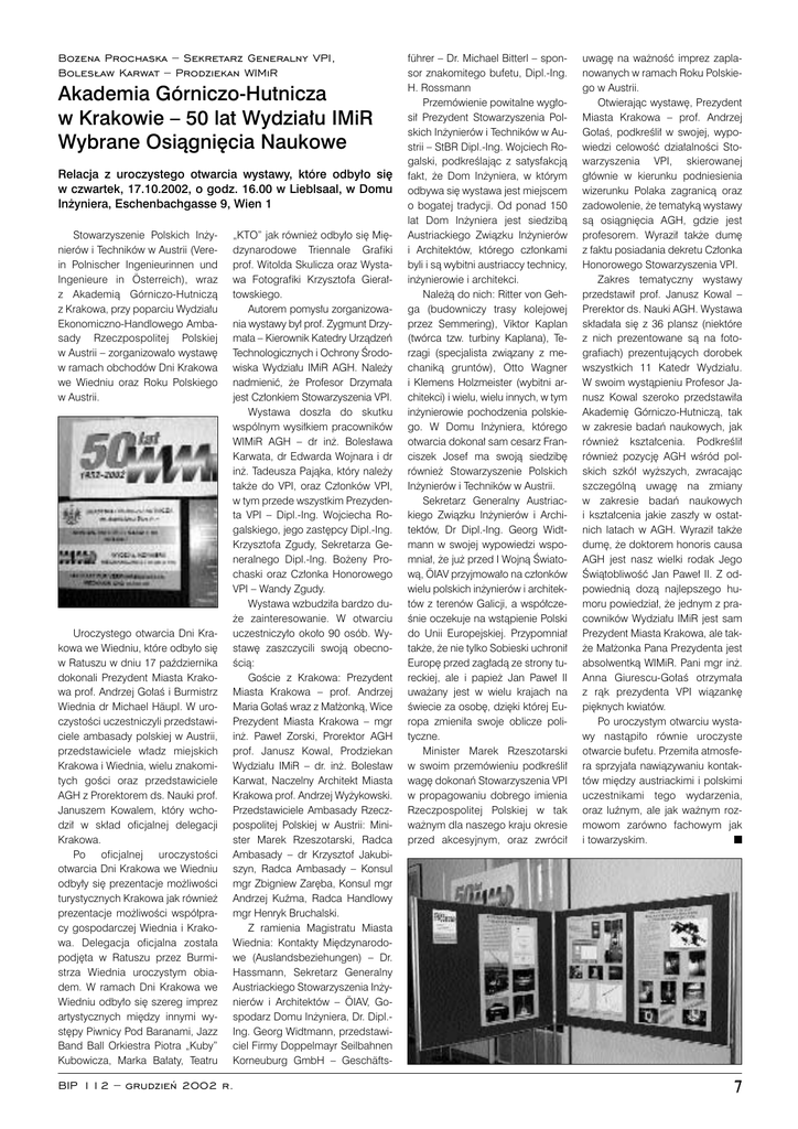 Bo¿ena Prochaska – Sekretarz Generalny VPI, Boles³aw Karwat – Prodziekan WIMiR Akademia Górniczo-Hutnicza w Krakowie – 50 lat Wydzia³u IMiR Wybrane Osi¹gniêcia Naukowe Relacja z uroczystego otwarcia wystawy, które odby³o siê w czwartek, 17.10.2002, o godz. 16.00 w Lieblsaal, w Domu In¿yniera, Eschenbachgasse 9, Wien 1 Stowarzyszenie Polskich In¿ynierów i Techników w Austrii (Verein Polnischer Ingenieurinnen und Ingenieure in Österreich), wraz z Akademi¹ Górniczo-Hutnicz¹ z Krakowa, przy poparciu Wydzia³u Ekonomiczno-Handlowego Ambasady Rzeczpospolitej Polskiej w Austrii – zorganizowa³o wystawê w ramach obchodów Dni Krakowa we Wiedniu oraz Roku Polskiego w Austrii. Uroczystego otwarcia Dni Krakowa we Wiedniu, które odby³o siê w Ratuszu w dniu 17 paŸdziernika dokonali Prezydent Miasta Krakowa prof. Andrzej Go³aœ i Burmistrz Wiednia dr Michael Häupl. W uroczystoœci uczestniczyli przedstawiciele ambasady polskiej w Austrii, przedstawiciele w³adz miejskich Krakowa i Wiednia, wielu znakomitych goœci oraz przedstawiciele AGH z Prorektorem ds. Nauki prof. Januszem Kowalem, który wchodzi³ w sk³ad oficjalnej delegacji Krakowa. Po oficjalnej uroczystoœci otwarcia Dni Krakowa we Wiedniu odby³y siê prezentacje mo¿liwoœci turystycznych Krakowa jak równie¿ prezentacje mo¿liwoœci wspó³pracy gospodarczej Wiednia i Krakowa. Delegacja oficjalna zosta³a podjêta w Ratuszu przez Burmistrza Wiednia uroczystym obiadem. W ramach Dni Krakowa we Wiedniu odby³o siê szereg imprez artystycznych miêdzy innymi wystêpy Piwnicy Pod Baranami, Jazz Band Ball Orkiestra Piotra „Kuby” Kubowicza, Marka Ba³aty, Teatru „KTO” jak równie¿ odby³o siê Miêdzynarodowe Triennale Grafiki prof. Witolda Skulicza oraz Wystawa Fotografiki Krzysztofa Giera³towskiego. Autorem pomys³u zorganizowania wystawy by³ prof. Zygmunt Drzyma³a – Kierownik Katedry Urz¹dzeñ Technologicznych i Ochrony Œrodowiska Wydzia³u IMiR AGH. Nale¿y nadmieniæ, ¿e Profesor Drzyma³a jest Cz³onkiem Stowarzyszenia VPI. Wystawa dosz³a do skutku wspólnym wysi³kiem pracowników WIMiR AGH – dr in¿. Boles³awa Karwata, dr Edwarda Wojnara i dr in¿. Tadeusza Paj¹ka, który nale¿y tak¿e do VPI, oraz Cz³onków VPI, w tym przede wszystkim Prezydenta VPI – Dipl.-Ing. Wojciecha Rogalskiego, jego zastêpcy Dipl.-Ing. Krzysztofa Zgudy, Sekretarza Generalnego Dipl.-Ing. Bo¿eny Prochaski oraz Cz³onka Honorowego VPI – Wandy Zgudy. Wystawa wzbudzi³a bardzo du¿e zainteresowanie. W otwarciu uczestniczy³o oko³o 90 osób. Wystawê zaszczycili swoj¹ obecnoœci¹: Goœcie z Krakowa: Prezydent Miasta Krakowa – prof. Andrzej Maria Go³aœ wraz z Ma³¿onk¹, Wice Prezydent Miasta Krakowa – mgr in¿. Pawe³ Zorski, Prorektor AGH prof. Janusz Kowal, Prodziekan Wydzia³u IMiR – dr. in¿. Boles³aw Karwat, Naczelny Architekt Miasta Krakowa prof. Andrzej Wy¿ykowski. Przedstawiciele Ambasady Rzeczpospolitej Polskiej w Austrii: Minister Marek Rzeszotarski, Radca Ambasady – dr Krzysztof Jakubiszyn, Radca Ambasady – Konsul mgr Zbigniew Zarêba, Konsul mgr Andrzej KuŸma, Radca Handlowy mgr Henryk Bruchalski. Z ramienia Magistratu Miasta Wiednia: Kontakty Miêdzynarodowe (Auslandsbeziehungen) – Dr. Hassmann, Sekretarz Generalny Austriackiego Stowarzyszenia In¿ynierów i Architektów – ÖIAV, Gospodarz Domu In¿yniera, Dr. Dipl.Ing. Georg Widtmann, przedstawiciel Firmy Doppelmayr Seilbahnen Korneuburg GmbH – Geschäfts- BIP 112 – grudzieñ 2002 r. führer – Dr. Michael Bitterl – sponsor znakomitego bufetu, Dipl.-Ing. H. Rossmann Przemówienie powitalne wyg³osi³ Prezydent Stowarzyszenia Polskich In¿ynierów i Techników w Austrii – StBR Dipl.-Ing. Wojciech Rogalski, podkreœlaj¹c z satysfakcj¹ fakt, ¿e Dom In¿yniera, w którym odbywa siê wystawa jest miejscem o bogatej tradycji. Od ponad 150 lat Dom In¿yniera jest siedzib¹ Austriackiego Zwi¹zku In¿ynierów i Architektów, którego cz³onkami byli i s¹ wybitni austriaccy technicy, in¿ynierowie i architekci. Nale¿¹ do nich: Ritter von Gehga (budowniczy trasy kolejowej przez Semmering), Viktor Kaplan (twórca tzw. turbiny Kaplana), Terzagi (specjalista zwi¹zany z mechanik¹ gruntów), Otto Wagner i Klemens Holzmeister (wybitni architekci) i wielu, wielu innych, w tym in¿ynierowie pochodzenia polskiego. W Domu In¿yniera, którego otwarcia dokona³ sam cesarz Franciszek Josef ma swoj¹ siedzibê równie¿ Stowarzyszenie Polskich In¿ynierów i Techników w Austrii. Sekretarz Generalny Austriackiego Zwi¹zku In¿ynierów i Architektów, Dr Dipl.-Ing. Georg Widtmann w swojej wypowiedzi wspomnia³, ¿e ju¿ przed I Wojn¹ Œwiatow¹, ÖIAV przyjmowa³o na cz³onków wielu polskich in¿ynierów i architektów z terenów Galicji, a wspó³czeœnie oczekuje na wst¹pienie Polski do Unii Europejskiej. Przypomnia³ tak¿e, ¿e nie tylko Sobieski uchroni³ Europê przed zag³ad¹ ze strony tureckiej, ale i papie¿ Jan Pawe³ II uwa¿any jest w wielu krajach na œwiecie za osobê, dziêki której Europa zmieni³a swoje oblicze polityczne. Minister Marek Rzeszotarski w swoim przemówieniu podkreœli³ wagê dokonañ Stowarzyszenia VPI w propagowaniu dobrego imienia Rzeczpospolitej Polskiej w tak wa¿nym dla naszego kraju okresie przed akcesyjnym, oraz zwróci³ uwagê na wa¿noœæ imprez zaplanowanych w ramach Roku Polskiego w Austrii. Otwieraj¹c wystawê, Prezydent Miasta Krakowa – prof. Andrzej Go³aœ, podkreœli³ w swojej, wypowiedzi celowoœæ dzia³alnoœci Stowarzyszenia VPI, skierowanej g³ównie w kierunku podniesienia wizerunku Polaka zagranic¹ oraz zadowolenie, ¿e tematyk¹ wystawy s¹ osi¹gniêcia AGH, gdzie jest profesorem. Wyrazi³ tak¿e dumê z faktu posiadania dekretu Cz³onka Honorowego Stowarzyszenia VPI. Zakres tematyczny wystawy przedstawi³ prof. Janusz Kowal – Prerektor ds. Nauki AGH. Wystawa sk³ada³a siê z 36 plansz (niektóre z nich prezentowane s¹ na fotografiach) prezentuj¹cych dor