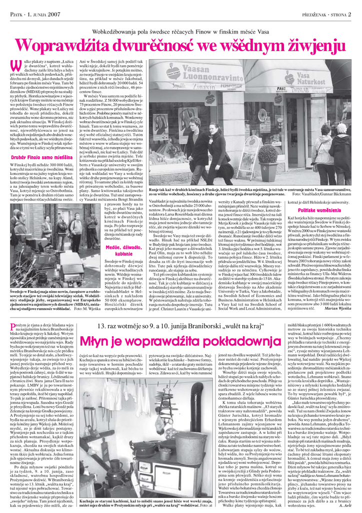 PJATK . 1. JUNIJA 2007 PŘEDźENAK . STRONA 2 Wobkedźbowanja pola šwedsce rěčacych Finow w finskim měsće Vasa Woprawdźita dwurěčnosć we wšědnym žiwjenju W ulke plakaty z napisom „Łužica je dwurěčna“, kotrež wuhladachmy zašłe lěta hdys a hdys při wulkich serbskich podawkach, přińdźechu mi do mysli, jako dundach srjedź februara po finskim měsće Vasa. Tam bě Europske zjednoćenstwo mjeńšinowych dźenikow (MIDAS) přeprosyło na studijny přebytk. Horstka nowinarjow z wjacorych krajow Europy móžeše so na městnje wo połoženju šwedsce rěčacych Finow přeswědčić. Wone plakaty we Łužicy mi tohodla do mysli přińdźechu, dokelž zwuraznichu wone skromnu próstwu, nic pak aktualnu situaciju. W Finskej dožiwich porno tomu woprawdźitu dwurěčnosć, njewotbłyšćowacu so jenož na někajkich swjedźenjach abo druhich wosebitych podawkach, ale we wšědnym žiwjenju. Wuměnjenja w Finskej wšak njehodźa so z tymi we Łužicy scyła přirunować. Druhdy Finojo samo mjeńšina W Finskej bydli něhdźe 300 000 ludźi, kotrychž maćeršćina je šwedšćina. Woni koncentruja so na južny region kraja wokoło stolicy Helsinkow, na kupy Aland, kotrež tworja šwedski awtonomny region, a na juhozapadny teren wokoło města Vasa, kotryž mjenuje so Ostrobothnia. Tam je w poměru k druhim rěčam samo najwjace šwedsce rěčacych ludźi na swěće. Ani w Šwedskej samej jich podźěl tak wulki njeje, dokelž bydli tam poměrnje wjele wukrajnikow. Je potajkim móžno, zo tworja Finojo w swójskim kraju mjeńšinu, na přikład w měsće Jakobstad, hdźež bydli dohromady 20 000 ludźi. 54 procentow z nich rěči šwedsce, 46 procentow finsce. W měsće Vasa samym su podźěle hinak rozdźělene. Z 58 000 wobydlerjow je 75 procentow Finow, 20 procentow Šwedow a pjeć procentow přisłušnikow druhich rěčow. Podobne poměry maš tež w někotrych łužiskich komunach. Wonkowny wobraz dwurěčnosće pak je w Finskej cyle hinaši. Tam so stat k tomu wuznawa, zo je wón dwurěčny. Finšćina a šwedšćina stej wobě oficialnej statnej rěči. Tutón fakt tež wuswětla, čehodla jewja so mjena městow a wsow w atlasu stajnje we woběmaj rěčomaj, a to runoprawnje w samsnej wulkosći, nic kaž we Łužicy. Tule dźě je serbske pismo zwjetša mjeńše. Tole kritizowaše na přikład sociolog Kjell Herberts z Vasaskeje uniwersity w swojim přednošku europskim nowinarjam. Runje tak wuhladaš we Vasy a wokolinje wšitke druhe pomjenowanja we woběmaj rěčomaj. To samsne płaći za kóždy napis při priwatnym wobchodźe, za busowe plany. Samo kwitowanka taksijoweho šofera je dwurěčna. Tuž smě zastupowacy Vasaski měšćanosta Bengt Strandin z prawom hordy na to być, zo płaći Vasa jako najbóle dwurěčne město, kotrež w dwurěčnych kónčinach Finskeje maja. Po jeho rozprawje su na přikład tež posedźenja měšćanskeje rady dwurěčne. Medije, dźiwadło, kubłanje Šwedojo w Finskej maja nimo nowin, časopisow a rozhłosowych stacijow tež swójski telewizijny sćelak. Wobdźělnicy studijneje jězby, organizowanej wot Europskeho zjednoćenstwa mjeńšinowych dźenikow (MIDAS), móžachu sej studijowe rumnosće wobhladać. Foto: M. Wjeńka P rožym je rjana a derje hladana wjes na najjužnišim kóncu Braniborskeje blisko krajneje mjezy k Sakskej. Wo tym njeswědča jenož prědnje zaměstnjenja we wubědźowanju wo najrjeńšu wjes. Rady bychu po wokrjesnym tež raz w krajnym měritku Braniborskeje nós cyle prědku měli. To njeje so dotal stało, a horliwcywjesnjenjo tukaja, zo zwisuje to z jich jasnej poziciju nastupajo přichod wsy. Wobydlerjo derje wědźa, za čo měli za jedyn postronk ćahnyć, steja-li dźě w napjatosći łužiskeje brunicy. Lětdźesatki su z brunicu žiwi. Stara jama Clara II na to pokazuje. LMBV je ju po towaršnostnym přewróće rekultiwowała a w njej terasy zapołožiła, štož bě rjany napohlad. To pak je zašłosć. Přitomnosć tajka přijomna njewupada. Susodna wjes Gozdź je přesydlena. Loni bu nowy Gozdź pola Zelezneje na kromje Grodka poswjećeny. A Prožymjenjo su sej toho wědomi, zo bydla na arealu, kotryž słuša do prioritneje kónčiny jamy Wjelcej-juh. Móžeš sej myslić, zo je dóńt takrjec postajeny. Wjesnjenjo pak nochcedźa so z tajkim přichodom wotnamakać, kajkiž druzy za nich planuja. Přesydlenje wotpokazuja, chcedźa na swojich statokach wostać. Aktualna diskusija wo klimowym škiće jich wobkruća. Jedna forma jich spjećowanja je přewšo čiłe towaršnostne žiwjenje. Po dnju młynow swjatki póndźelu je za tydźeń, 9. a 10. junija, zaso składnosć, wutrobnu hospodliwosć Prožymjanow dožiwić. W Braniborskej wotměje so 13. lětnik „wulěta na kraj“, tuž njesmě wjes pobrachować. Towarstwo za tradicionalnu ratarsku techniku a burske žiwjenske wašnje přeprošuje do „swojeho“ młyna. Tam jenož njezhoniš, kak su prjedownicy žito mlěli, ale za- Šwedojo w Finskej maja dohromady dźewjeć wšědnje wuchadźacych nowin. Wšědnje woznamjenja w Finskej wot póndźele do njedźele. Najwjetša z nich je Hufvudstadsbladet w Helsinkach z nakładom 50 000 eksemplarow. Hosćićelski dźenik europskich nowinarjow Runje tak kaž w druhich kónčinach Finskeje, hdźež bydli šwedska mjeńšina, je tež tule w centrumje města Vasa samozrozumliwe, zo su wšitke wobchody, hosćency a druhe zjawne twarjenja dwurěčnje pomjenowane. Foto: Vasabladet/Gunnar Bäckmann Vasabladet je najwažniša šwedska nowina w Ostrobothniji a ma něhdźe 25 000 abonentow. Po słowach jeje nawjedowaceho redaktora Larsa Rosenblada maš dźensa lědma hišće domjacnosće, w kotrychž maja jenož nowinu jedneje abo tamneje rěče, ale zwjetša wjacore dźeniki we woběmaj rěčomaj. Šwedojo we Vasy maja tež swoje dźiwadło. Hinak hač na přikład NSLDź w Budyšinje pak hraja tam jeno šwedsce. Kaž praji jeho manager a dźiwadźelnik Paul Olin, maja za to wob lěto něhdźe dwaj mi