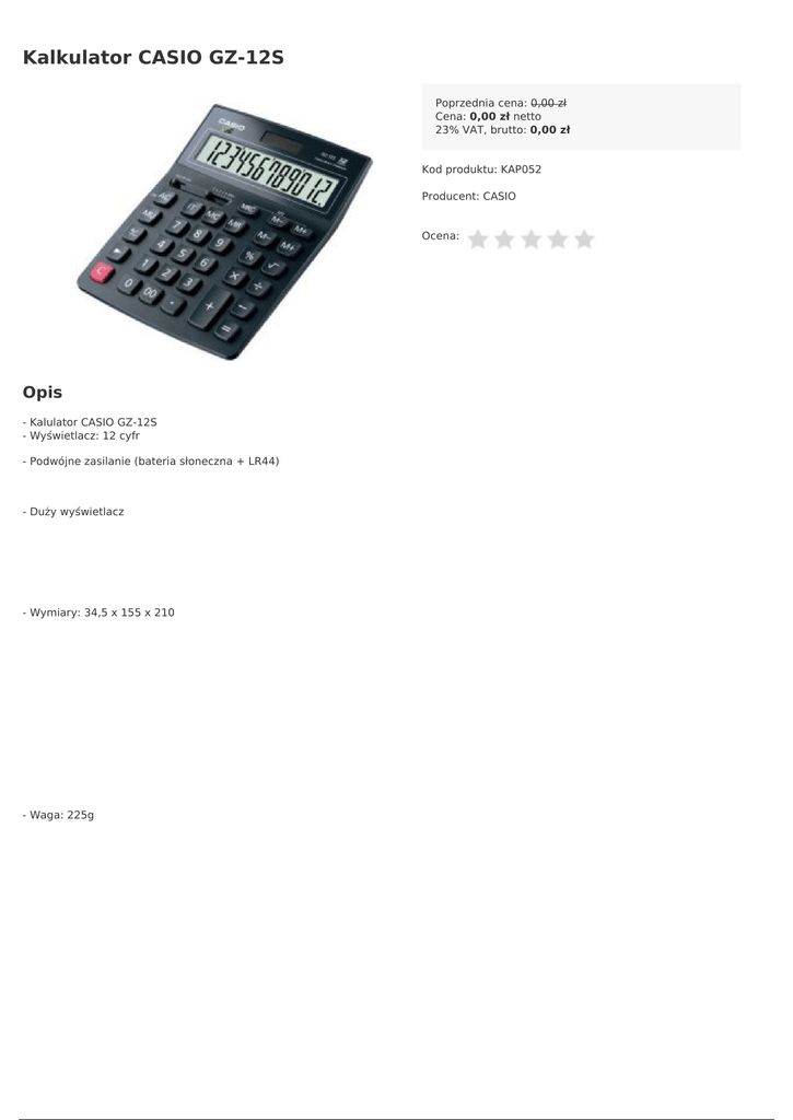 Kalkulator CASIO GZ-12S Poprzednia cena: 0,00 zł Cena: 0,00 zł netto 23% VAT, brutto: 0,00 zł Kod produktu: KAP052 Producent: CASIO Ocena: Opis - Kalulator CASIO GZ-12S - Wyświetlacz: 12 cyfr - Podwójne zasilanie (bateria słoneczna + LR44) - Duży wyświetlacz - Wymiary: 34,5 x 155 x 210 - Waga: 225g - Jednostka sprzedaży 1 sztuka Powered by TCPDF (www.tcpdf.org)