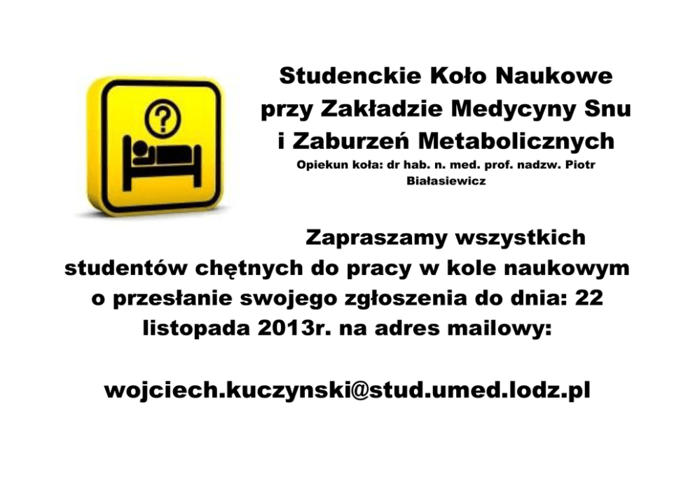 Studenckie Koło Naukowe przy Zakładzie Medycyny Snu i Zaburzeń Metabolicznych Opiekun koła: dr hab. n. med. prof. nadzw. Piotr Białasiewicz Zapraszamy wszystkich studentów chętnych do pracy w kole naukowym o przesłanie swojego zgłoszenia do dnia: 22 listopada 2013r. na adres mailowy: [email protected]
