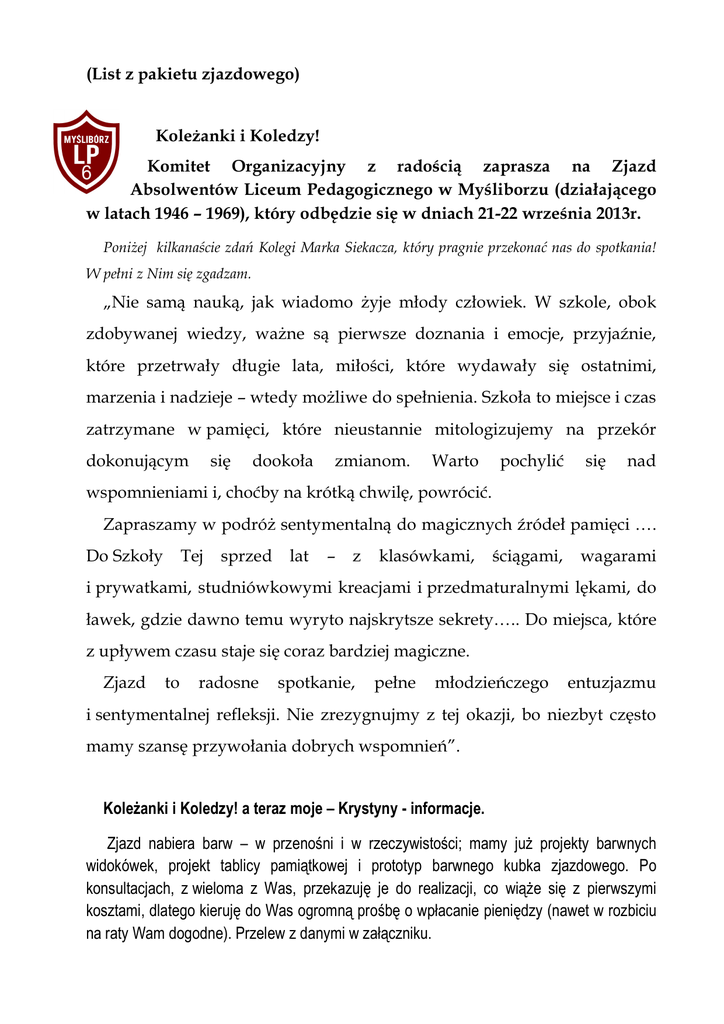 (List z pakietu zjazdowego) Koleżanki i Koledzy! Komitet Organizacyjny z radością zaprasza na Zjazd Absolwentów Liceum Pedagogicznego w Myśliborzu (działającego w latach 1946 – 1969), który odbędzie się w dniach 21-22 września 2013r. Poniżej kilkanaście zdań Kolegi Marka Siekacza, który pragnie przekonać nas do spotkania! W pełni z Nim się zgadzam. „Nie samą nauką, jak wiadomo żyje młody człowiek. W szkole, obok zdobywanej wiedzy, ważne są pierwsze doznania i emocje, przyjaźnie, które przetrwały długie lata, miłości, które wydawały się ostatnimi, marzenia i nadzieje – wtedy możliwe do spełnienia. Szkoła to miejsce i czas zatrzymane w pamięci, które nieustannie mitologizujemy na przekór dokonującym się dookoła zmianom. Warto pochylić się nad wspomnieniami i, choćby na krótką chwilę, powrócić. Zapraszamy w podróż sentymentalną do magicznych źródeł pamięci …. Do Szkoły Tej sprzed lat – z klasówkami, ściągami, wagarami i prywatkami, studniówkowymi kreacjami i przedmaturalnymi lękami, do ławek, gdzie dawno temu wyryto najskrytsze sekrety….. Do miejsca, które z upływem czasu staje się coraz bardziej magiczne. Zjazd to radosne spotkanie, pełne młodzieńczego entuzjazmu i sentymentalnej refleksji. Nie zrezygnujmy z tej okazji, bo niezbyt często mamy szansę przywołania dobrych wspomnień”. Koleżanki i Koledzy! a teraz moje – Krystyny - informacje. Zjazd nabiera barw – w przenośni i w rzeczywistości; mamy już projekty barwnych widokówek, projekt tablicy pamiątkowej i prototyp barwnego kubka zjazdowego. Po konsultacjach, z wieloma z Was, przekazuję je do realizacji, co wiąże się z pierwszymi kosztami, dlatego kieruję do Was ogromną prośbę o wpłacanie pieniędzy (nawet w rozbiciu na raty Wam dogodne). Przelew z danymi w załączniku. W załączniku programowym przedstawiłam ogólną kalkulację i wraz z Komitetem Organizacyjnym - z Franciszkiem Mikuckim na czele odp. za finanse - zobowiązujemy się rozliczyć każdą złotówkę. Przyjmujemy, że nie wszyscy będą mogli uczestniczyć w dwudniowym spotkaniu, dlatego przedstawiamy kosztorys w rozbiciu na każdy dzień. Może się zdarzyć, że Ktoś z różnych powodów nie będzie mógł uczestniczyć w Zjeździe LP 2013, ale rozumiejąc nasz trud wniesie do jego organizacji swoją cegiełkę, pozwalającą jednocześnie ocalić od zapomnienia naszą myśliborską Alma Mater. Zapraszamy do współfinansowania tablicy pamiątkowej, która zawiśnie na murze szkoły, wydruku publikacji o naszym Liceum oraz uhonorowania naszych nauczycieli – żyjących i spoczywających na cmentarzu myśliborskim. Hojności Waszej polecamy to dzieło. Na przelewie prosimy w tym przypadku zaznaczyć – „wsparcie organizacji zjazdu” . Osoby, które nie będą mogły uczestniczyć w zjeździe mogą także zamówić pamiątki zjazdowe, które zostaną przesłane pocztą na adres zamieszczony na przelewie lub przekazane uczestniczącej w zjeździe osobie upoważnionej do odbioru. Wówczas na przelewie proszę zaznaczyć „pamiątki zjazdowe” – (koszt 34zł: kubek, widokówki, książka - w przypadku odbioru, a w przypadku wysyłki proszę doliczyć koszty przesyłki). Inne uwagi 1. Nadal oczekuję na zdjęcia zapisane w jpg z lat szkolnych wraz z opisem, które wzbogacą książkę i wystawę. 2. Proszę także o kilkuzdaniowe odpowiedzi na pytania: W jakim stopniu LP wpłynęło na Twoje dalsze życie? Którego nauczyciela do dzisiaj zachowujesz w pamięci i dlaczego? Wydarzenie, którego nie zatarł czas. 3. Wypowiedzi proszę nadsyłać drogą elektroniczną na adres [email protected] lub pocztą na adres: Krystyna Tomczak; 64-510 Wronki, ul. Cienista 6 4. Proszę o wypełnienie „ankiety zjazdowej”, która ułatwi nam organizację zjazdu i pozwoli podjąć decyzję o ilości zamówień: pamiątek, noclegów, posiłków. PILNE! Nie trudno zauważyć, że pracy za nami moc, a przed nami jeszcze więcej. Wierzymy, że w programie, który Wam prezentujemy, każdy znajdzie coś dla siebie, a ZJAZD będzie okazją do radosnego spotkania wszystkich Absolwentów Liceum Pedagogicznego w Myśliborzu! Pozdrawiam serdecznie i liczę na Waszą pomoc – Krystyna Peczko – Tomczak (1968)