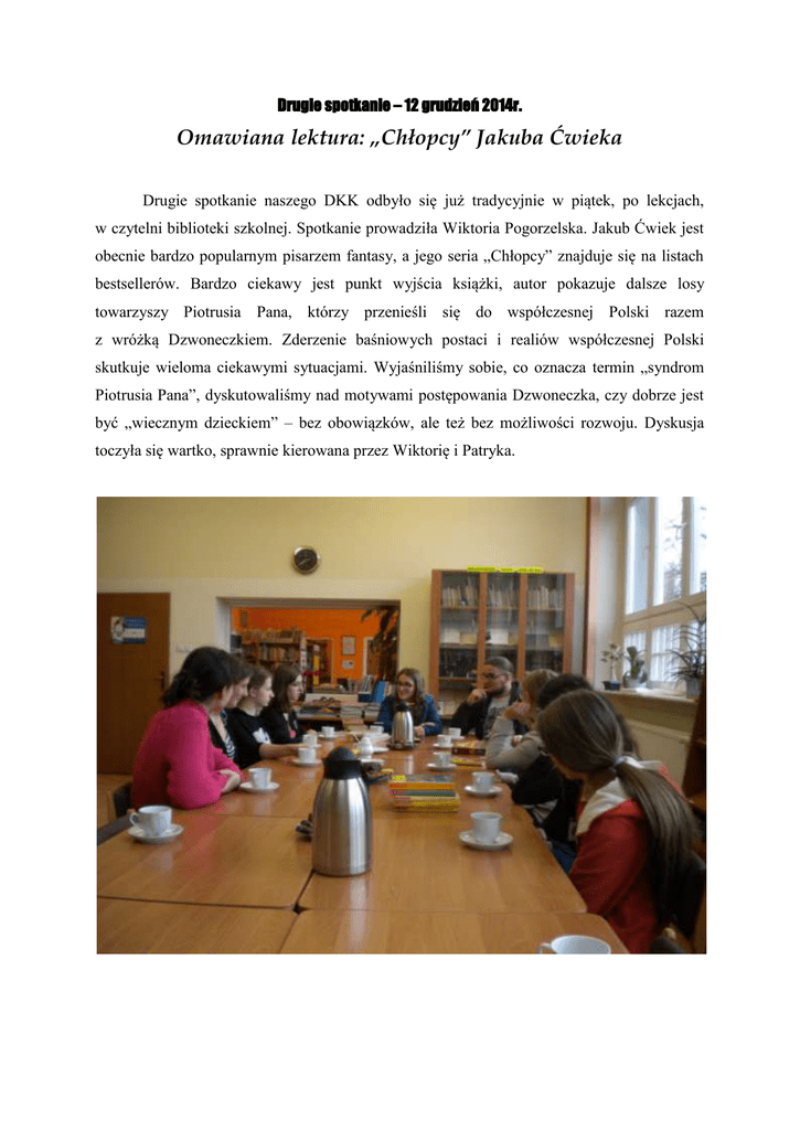 Drugie spotkanie – 12 grudzień 2014r. Omawiana lektura: „Chłopcy” Jakuba Ćwieka Drugie spotkanie naszego DKK odbyło się już tradycyjnie w piątek, po lekcjach, w czytelni biblioteki szkolnej. Spotkanie prowadziła Wiktoria Pogorzelska. Jakub Ćwiek jest obecnie bardzo popularnym pisarzem fantasy, a jego seria „Chłopcy” znajduje się na listach bestsellerów. Bardzo ciekawy jest punkt wyjścia książki, autor pokazuje dalsze losy towarzyszy Piotrusia Pana, którzy przenieśli się do współczesnej Polski razem z wróżką Dzwoneczkiem. Zderzenie baśniowych postaci i realiów współczesnej Polski skutkuje wieloma ciekawymi sytuacjami. Wyjaśniliśmy sobie, co oznacza termin „syndrom Piotrusia Pana”, dyskutowaliśmy nad motywami postępowania Dzwoneczka, czy dobrze jest być „wiecznym dzieckiem” – bez obowiązków, ale też bez możliwości rozwoju. Dyskusja toczyła się wartko, sprawnie kierowana przez Wiktorię i Patryka. Wszyscy zgodziliśmy się co do tego, że książka jest bardzo sprawnie napisana, wciągająca, stanowi dobrą rozrywkę. Cześć osób postanowiła sięgnąć po inne utwory tego pisarza. Do prowadzenie następnego spotkania, które odbędzie się w drugim tygodniu lutego, zgłosił się Patryk. Będziemy omawiać twórczość Terrego Pratcheta. Patryk zaproponował, żeby omówić trzy pierwsze tomy serii Świat Dysku: „Kolor magii”, „Blask fantastyczny”, „Równoumagicznienie”, w których występuje mag Rincewind. Wszyscy zgodziliśmy się na zaproponowane lektury, tak że czeka nas zapoznanie się z fascynującym Światem Dysku.