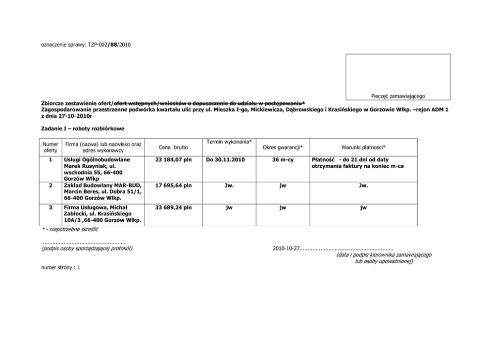 oznaczenie sprawy: TZP-002/88/2010 Pieczęć zamawiającego Zbiorcze zestawienie ofert/ofert wstępnych/wniosków o dopuszczenie do udziału w postępowaniu* Zagospodarowanie przestrzenne podwórka kwartału ulic przy ul. Mieszka I-go, Mickiewicza, Dąbrowskiego i Krasińskiego w Gorzowie Wlkp. –rejon ADM 1 z dnia 27-10-2010r Zadanie I – roboty rozbiórkowe Termin wykonania* Numer oferty Firma (nazwa) lub nazwisko oraz adres wykonawcy 1 Usługi Ogólnobudowlane Marek Rusyniak, ul. wschodnia 55, 66-400 Gorzów Wlkp Zakład Budowlany MAR-BUD, Marcin Beres, ul. Dobra 51/1, 66-400 Gorzów Wlkp. 23 184,07 pln 17 695,64 pln Jw. jw Jw. Firma Usługowa, Michał Zabłocki, ul. Krasińskiego 10A/3 ,66-400 Gorzów Wlkp. 33 689,24 pln jw jw jw 2 3 Cena brutto Okres gwarancji* Do 30.11.2010 36 m-cy Warunki płatności* Płatność - do 21 dni od daty otrzymania faktury na koniec m-ca * - niepotrzebne skreślić ..................................................... (podpis osoby sporządzającej protokół) 2010-10-27........................................................... (data i podpis kierownika zamawiającego lub osoby upowaŜnionej) numer strony : 1 oznaczenie sprawy: TZP-002/88/2010 Pieczęć zamawiającego Zbiorcze zestawienie ofert/ofert wstępnych/wniosków o dopuszczenie do udziału w postępowaniu* Zagospodarowanie przestrzenne podwórka kwartału ulic przy ul. Mieszka I-go, Mickiewicza, Dąbrowskiego i Krasińskiego w Gorzowie Wlkp. –rejon ADM 1 z dnia 27-10-2010r Zadanie II – elementy małej architektury Termin wykonania* Numer oferty Firma (nazwa) lub nazwisko oraz adres wykonawcy 2 Zakład Budowlany MAR-BUD, Marcin Beres, ul. Dobra 51/1, 66-400 Gorzów Wlkp. 67 010,64 pln 3 Firma Usługowa, Michał Zabłocki, ul. Krasińskiego 10A/3 ,66-400 Gorzów Wlkp. 133 055,20 pln Cena brutto Okres gwarancji* Do 30.11.2010 Jw. 36 m-cy jw Warunki płatności* Płatność - do 21 dni od daty otrzymania faktury na koniec m-ca Jw. * - niepotrzebne skreślić ..................................................... (podpis osoby sporządzającej protokół) 2010-10-27........................................................... (data i podpis kierownika zamawiającego lub osoby upowaŜnionej) numer strony : 1 oznaczenie sprawy: TZP-002/88/2010 Pieczęć zamawiającego Zbiorcze zestawienie ofert/ofert wstępnych/wniosków o dopuszczenie do udziału w postępowaniu* Zagospodarowanie przestrzenne podwórka kwartału ulic przy ul. Mieszka I-go, Mickiewicza, Dąbrowskiego i Krasińskiego w Gorzowie Wlkp. –rejon ADM 1 z dnia 27-10-2010r Zadanie III – Przebudowa elementów murka oporowego zejścia piwnicznego Termin wykonania* Numer oferty Firma (nazwa) lub nazwisko oraz adres wykonawcy 2 Zakład Budowlany MAR-BUD, Marcin Beres, ul. Dobra 51/1, 66-400 Gorzów Wlkp. 22 445,60 pln 3 Firma Usługowa, Michał Zabłocki, ul. Krasińskiego 10A/3 ,66-400 Gorzów Wlkp. 93 262,07 pln Cena brutto Okres gwarancji* Do 30.11.2010 Jw. 36 m-cy jw Warunki płatności* Płatność - do 21 dni od daty otrzymania faktury na koniec m-ca Jw. * - niepotrzebne skreślić ..................................................... (podpis osoby sporządzającej protokół) 2010-10-27........................................................... (data i podpis kierownika zamawiającego lub osoby upowaŜnionej) numer strony : 1