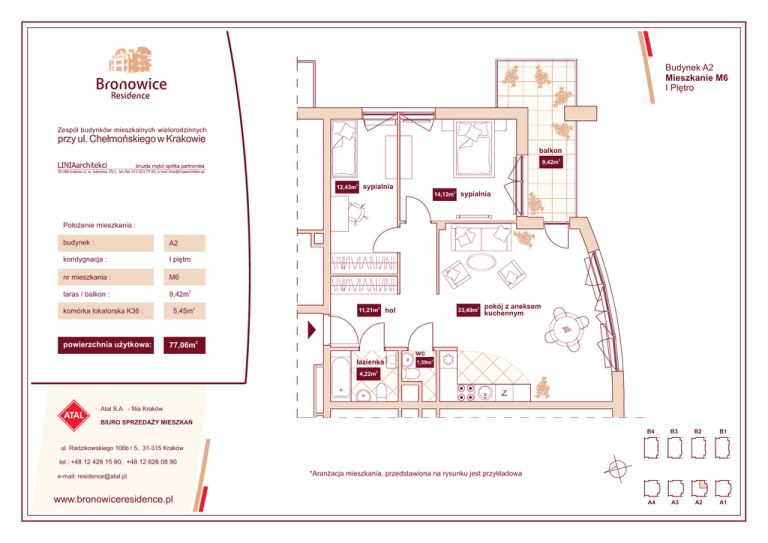 Budynek A2 Mieszkanie M6 I Piêtro Zespó³ budynków mieszkalnych wielorodzinnych przy ul. Che³moñskiego w Krakowie balkon 9,42m2 12,43m2 sypialnia 14,12m2 sypialnia Po³o¿enie mieszkania : budynek : A2 kondygnacja : I piêtro nr mieszkania : M6 taras / balkon : 9,42m2 powierzchnia u¿ytkowa: 11,21m2 5,45m2 komórka lokatorska K36 : 77,06m 33,49m2 hol pokój z aneksem kuchennym 2 wc ³azienka 1,59m2 4,22m2 Atal S.A. - filia Kraków BIURO SPRZEDA¯Y MIESZKAÑ B4 B3 B2 B1 A4 A3 A2 A1 ul. Radzikowskiego 106b / 5, 31-315 Kraków tel.: +48 12 426 15 90, +48 12 626 08 90 e-mail: [email protected] www.bronowiceresidence.pl *Aran¿acja mieszkania, przedstawiona na rysunku jest przyk³adowa