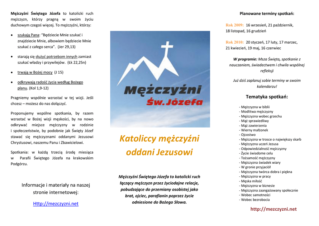 Planowane terminy spotkao: Mężczyźni Świętego Józefa to katolicki ruch mężczyzn, którzy pragną w swoim życiu duchowym czegoś więcej. To mężczyźni, którzy: Rok 2009: 16 wrzesieo, 21 październik, 18 listopad, 16 grudzieo szukają Pana: “Będziecie Mnie szukad i znajdziecie Mnie, albowiem będziecie Mnie szukad z całego serca”. (Jer 29,13) Rok 2010: 20 styczeo, 17 luty, 17 marzec, 21 kwiecieo, 19 maj, 16 czerwiec starają się służyd potrzebom innych zamiast szukad władzy i przywilejów. (Łk 22,25n) W programie: Msza Święta, spotkanie z nauczaniem, świadectwem i chwila wspólnej refleksji trwają w Bożej mocy (J 15) Już dziś zaplanuj sobie terminy w swoim kalendarzu! odkrywają radośd życia według Bożego planu. (Kol 1,9-12) Tematyka spotkao: Pragniemy wspólnie wzrastad w tej wizji. Jeśli chcesz – możesz do nas dołączyd. Proponujemy wspólne spotkania, by razem wzrastad w Bożej wizji męskości, by na nowo odkrywad miejsce mężczyzny w rodzinie i społeczeostwie, by podobnie jak Święty Józef stawad się mężczyznami oddanymi Jezusowi Chrystusowi, naszemu Panu i Zbawicielowi. Spotkania: w każdą trzecią środę miesiąca w Parafii Świętego Józefa na krakowskim Podgórzu. Informacje i materiały na naszej stronie internetowej: Http://mezczyzni.net Katoliccy mężczyźni oddani Jezusowi Mężczyźni Świętego Józefa to katolicki ruch łączący mężczyzn przez życiodajne relacje, pobudzające do przemiany osobistej jako brat, ojciec, parafianin poprzez życie odniesione do Bożego Słowa. - Mężczyzna w biblii - Modlitwa mężczyzny - Mężczyzna wobec grzechu - Mąż sprawiedliwy - Mąż zawierzenia - Wierny małżonek - Ojcostwo - Mężczyzna w trosce o największy skarb - Mężczyzna uczeo Jezusa - Odpowiedzialnośd mężczyzny - Życie świadome celu - Tożsamośd mężczyzny - Mężczyzna świadek wiary - W gronie przyjaciół - Mężczyzna twórca dobra i piękna - Mężczyzna w pracy - Męska miłośd - Mężczyzna w biznesie - Mężczyzna zaangażowany społecznie - Wobec samotności - Wobec bezrobocia http://mezczyzni.net Św. Józef – opiekun Jezusa Święty Józef był mężem Maryi. Jego postad znamy ze stron Ewangelii. Całe swoje życie św. Józef spędził jako rękodzielnik i wyrobnik w ciężkiej zarobkowej pracy. Ewangelie określają go mianem faber, przez co rozumiano wyrobnika - rzemieślnika od naprawy narzędzi rolniczych, przedmiotów drewnianych itp. Były to więc prace związane z budownictwem, z robotą w drzewie i w żelazie. Józef wykonywał na zamówienie bardzo ciężkie prace i z nich utrzymywał Najświętszą Rodzinę. Ta właśnie praca stała się równocześnie dla niego źródłem uświęcenia. Był on mistykiem nie przez kontemplację, przez uczynki pokutne czy przez dzieła miłosierdzia, ale przez pracę. Praca go uświęciła, gdyż wykonywał ją rzetelnie, nie żądał za nią wygórowanych cen, wypełniał ją cicho i pokornie jako zleconą sobie od Boga misję na ziemi. Spełniał ją zapatrzony w Jezusa i Maryję. Dla nich żył, dla nich się trudził, dla nich był gotów do najwyższych ofiar. Równocześnie był charyzmatykiem – mężem otwartym na działanie i prowadzenie Ducha Świętego. To właśnie dzięki swojej wrażliwości na Boga mógł w sposób doskonały zrealizowad plan Boga i zapewnid ochronę Jezusowi w czasie największego zagrożenia. Taki powinien byd styl pracy każdego chrześcijaoskiego mężczyzny. Praca ma go uświęcad, równocześnie pielęgnując relację z Bogiem w Duchu Świętym powinien on wzrastad we wrażliwości duchowej i obecności Bożej. Takie połączenie pozwala najpełniej rozwinąd jego uzdolnienia, energię, inicjatywę. Jest szkołą wielu cnót osobistych i społecznych, takich jak na przykład wytrzymałośd, solidarnośd, cierpliwośd, męstwo, odwaga i ład, współpraca, współzawodnictwo. Józef pochodził z rodu króla Dawida. Wykazuje to św. Mateusz w genealogii przodków św. Józefa. Na podstawie: brewiarz.pl Dziękczynienie za ochronę św. Józefa Boże, nieskooczenie dobry, który stworzyłeś wszystko poprzez Swoją miłośd i władasz światem w swej niewysłowionej opatrzności, z głębi serca dziękujemy Ci za Twe niezliczone łaski, które nam dajesz, a szczególnie za przywilej przyjęcia Św. Józefa za naszego orędownika, który z miłością troszczy się o nasze dobro. Z pomocą Twej łaski we wszystkim naśladując św. Józefa pragniemy okazad się godnymi Twojej przychylności. Obyśmy byli godni nazywad się dziedmi Boga, bradmi Chrystusa i synami Maryi. “Boży Mężczyzna w XXI wieku Spotkanie mężczyzn Pod patronatem św. Józefa Amen. (Joseph: The Man Closest to Jesus, St. Paul Editions, 1962.) 19 maja 2010 godz. 18:30 18:30 Msza Święta w kościele, po niej spotkanie w Kamieniołomie Parafia Świętego Józefa w Krakowie – Podgórzu, ul Zamoyskiego 2 http://www.mezczyzni.net ZAPRASZAMY