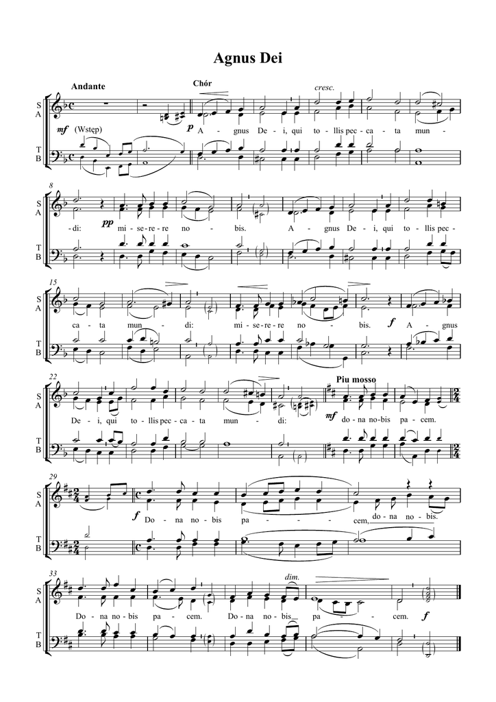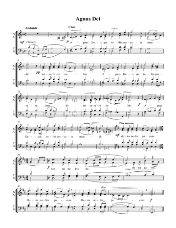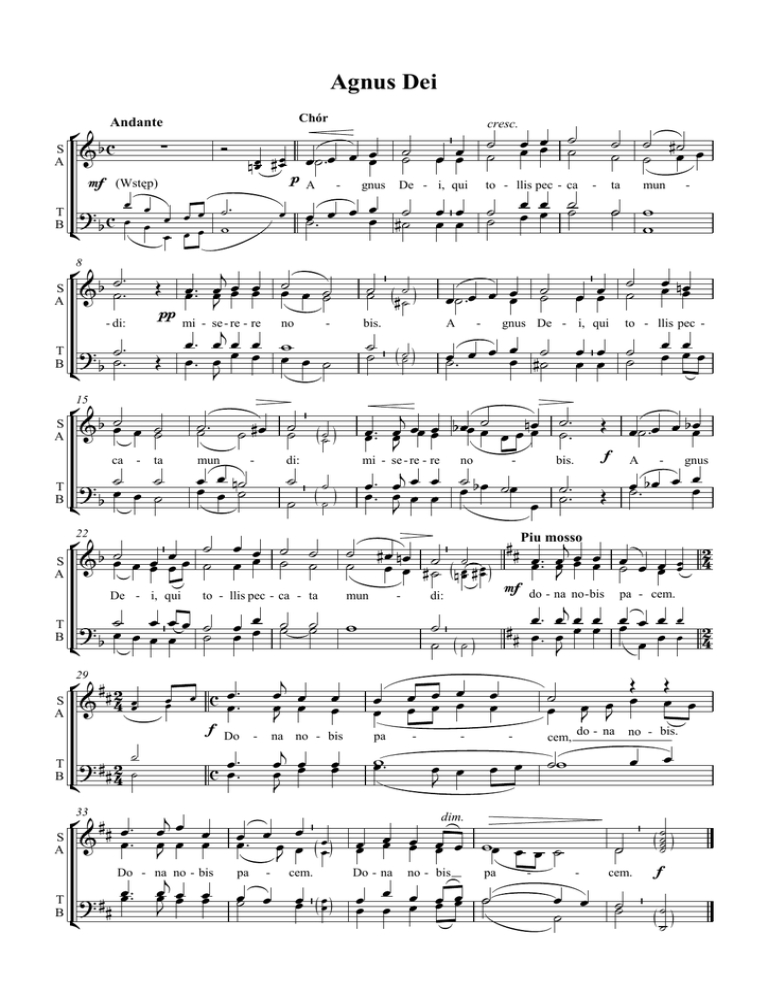Agnus Dei Chór Andante S A p mf (Wstęp) T B 8 pp - di: T B 15 S A ca T B - bis. A - f T B Do 33 S A mun T B Do - na no - bis pa - - pa cem. f A - gnus / 0 na no - bis bis. mf do - na no - bis di: - - - - cem, do - na no - bis. pa - cem. dim. /0 /0 - to - llis pec - - gnus De - i, qui no mun Piu mosso / 0 to - llis pec - ca - ta ta mi - se - re - re / 0 29 - - di: 22 S A / 0 / 0 S A T B mi - se - re - re no to - llis pec - ca De - i, qui De - i, qui / 0 mun gnus ta - S A A cresc. Do - na no - bis pa - / 0 - cem. f / 0