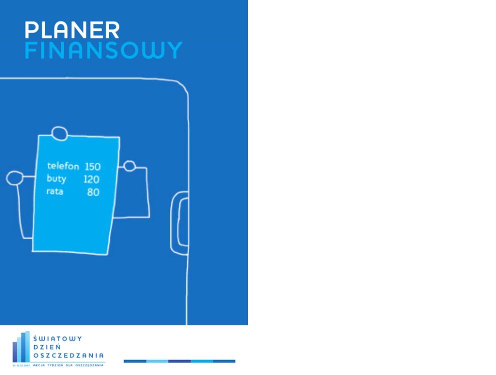 Nie radzisz sobie ze swoimi wydatkami? Toniesz w d∏ugach? Ciàgle brakuje ci Êrodków? Mo˝e ju˝ najwy˝szy czas, aby pomyÊleç o uporzàdkowaniu finansów i zaplanowaniu w∏asnego bud˝etu. Porzàdek w Twoim bud˝ecie i portfelu to podstawowy warunek, by sprawnie i efektywnie oszcz´dzaç. Im póêniej zabierzemy si´ za przeglàd w∏asnych wydatków, dochodów, d∏ugów i ewentualnie - jakichÊ oszcz´dnoÊci, tym gorzej dla nas. Dobre rady finansowe: Starajmy si´ zatem przestrzegaç kilku zasad: realistycznie okreÊl swoje cele ˝yciowe w obszarze finansowym, tzn. co i w jakim czasie chcia∏byÊ kupiç uporzàdkuj swoje bie˝àce wydatki oszcz´dzaj zawsze 5-10% Twoich dochodów netto na poczet planowanych zakupów staraj si´ zawsze zachowaç oszcz´dnoÊci z 3-6 miesi´cy na niespodziewane wydatki planuj z wyprzedzeniem najwa˝niejsze zakupy, które chcesz dokonaç w danym roku i porównuj ceny staraj si´ nie wydawaç wi´cej ni˝ 10-15% Twoich dochodów netto w p∏atnoÊciach kredytowych sporzàdzaj bilans swoich dochodów i wydatków ka˝dego miesiàca co najmniej raz w roku analizuj stan swojego zad∏u˝enia Po pierwsze kontrolujmy swoje d∏ugi; JeÊli mamy wiele drobnych d∏ugów, starajmy si´ w miar´ mo˝liwoÊci jak najszybciej uporaç si´ z ich sp∏atà; Kilka podobnych d∏ugów (na przyk∏ad lodówka kupiona na raty z banku, szybka po˝yczka na wakacje z firmy poÊrednictwa kredytowego, jakiÊ mebel na kart´ kredytowà) spróbujmy skumulowaç w jeden wi´kszy, dzi´ki czemu nie pogubimy si´ przy sp∏atach; Je˝eli nie staç nas na konsolidacj´ d∏ugów, starajmy si´ najpierw sp∏aciç te d∏ugi, które sà dla nas najbardziej kosztowne, na przyk∏ad kredyty o najwy˝szym oprocentowaniu. Najwa˝niejsze jednak jest, aby co pewien czas robiç remanent domowego bud˝etu. Takie porzàdki w finansach osobistych mo˝e u∏atwiç nawet proste narz´dzie, jak ten planer finansowy. PowinniÊmy w nim zawrzeç wszystkie dane finansowe dotyczàce dochodów netto tj. rzeczywistych wp∏ywów gotówki i wydatków. Zestawienie to pozwoli nam oceniç, czy nasze finanse sà zdrowe. W Y DAT K I M I E S I ¢ C Z N E MIESZKANIE Op∏aty za wynajem / czynsz Gaz Woda D O C H O DY M I E S I ¢ C Z N E Ogrzewanie Dochód 1 Utrzymanie (Êmieci, remonty, sprzàtanie, itp.) Dochód 2 Podatek od nieruchomoÊci Emerytura / Renta Inne wydatki Inne SUMA SUMA WY˚YWIENIE KO M U N I K AC JA I M E D I A Posi∏ki w pracy / szkole Telefon stacjonarny Wydatki na artyku∏y spo˝ywcze Telefon komórkowy Wydatki w restauracji i kawiarni Telewizja kablowa / satelitarna SUMA Op∏aty RTV Op∏aty za Internet Inne wydatki T R A N S P O RT SUMA Naprawy i utrzymanie samochodu Paliwo Transport miejski W Y DAT K I N A E D U K AC J ¢ Taksówki Op∏aty i czesne za szko∏´ / studia Op∏aty parkingowe Ksià˝ki Koszty podró˝y Pomoce naukowe (pociàg, autobus, itp.) Inne wydatki Inne wydatki SUMA SUMA LECZENIE R O Z RY W K A Produkty i leki Kino Koszty leczenia Prasa Inne wydatki Ksià˝ki SUMA Hobby Wydatki specjalne (okolicznoÊciowe) Inne wydatki UBEZPIECZENIA SUMA Na ˝ycie Dobrowolne emerytalne Zdrowotne W Y DAT K I R O D Z I N N E NNW Opieka nad dzieckiem Samochodu Ubrania Mieszkania Utrzymanie zwierzàt Majàtku Inne wydatki Inne SUMA SUMA INNE Sp∏ata d∏ugów Darowizny Zobowiàzania prawne i sk∏adki Inne wydatki SUMA OSZCZ¢DNOÂCI Podsumowanie Teraz chwila prawdy. Gdy ju˝ uda∏o nam si´ zebraç wszystkie dane o stanie naszych finansów, mo˝emy sprawdziç, czy nasz bud˝et jest zrównowa˝ony, czyli wyst´puje co najmniej nadwy˝ka dochodów nad wydatkami. JeÊli nie, czyli gdy mamy deficyt i nie mo˝emy poradziç sobie z jego ograniczeniem, wówczas koniecznie musimy pomyÊleç nad rezygnacjà z niektórych wydatków. C A ¸ KO W I T E M I E S I ¢ C Z N E D O C H O DY N E T T O Na niespodziewane wydatki Na planowane zakupy Inne C A ¸ KO W I T E M I E S I ¢ C Z N E W Y DAT K I SUMA Sp∏ata karty kredytowej Sp∏ata rat kredytów BILANS Planer powsta∏a w ramach akcji „Tydzieƒ dla oszcz´dzania”, której organizatorem jest Fundacja Kronenberga przy Citi Handlowy we wspó∏pracy z Fundacjà Think! Inicjatywie patronuje Komisja Nadzoru Finansowego. www.tdo.interia.pl www.think.org.pl