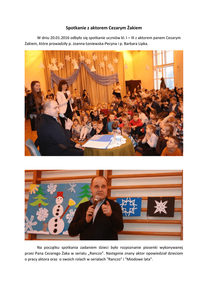 Spotkanie z aktorem Cezarym Żakiem W dniu 20.01.2016 odbyło się spotkanie uczniów kl. I – III z aktorem panem Cezarym Żakiem, które prowadziły p. Joanna Łoniewska-Pecyna i p. Barbara Lipka. Na początku spotkania zadaniem dzieci było rozpoznanie piosenki wykonywanej przez Pana Cezarego Żaka w serialu „Ranczo”. Następnie znany aktor opowiedział dzieciom o pracy aktora oraz o swoich rolach w serialach "Ranczo" i "Miodowe lata". Dzieci dowiedziały się również, jak zostać aktorem i jak pokonać tremę przed występem na scenie. Następnie Pan Cezary Żak przeczytał dzieciom fragment książki Ewy Skarżyńskiej „Przygoda w dżungli”, rozdział pod tytułem „Marzenia”. Na koniec uczniowie pięknie podziękowali aktorowi za odwiedziny i wręczyli prezent i kartę okolicznościową. Pan Cezary Żak wpisał się do szkolnej kroniki oraz rozdał wiele autografów dzieciom i pracownikom szkoły. Na zakończenie spotkania uczniowie wraz z wychowawcami i zaproszonym gościem wykonali pamiątkowe zdjęcie.