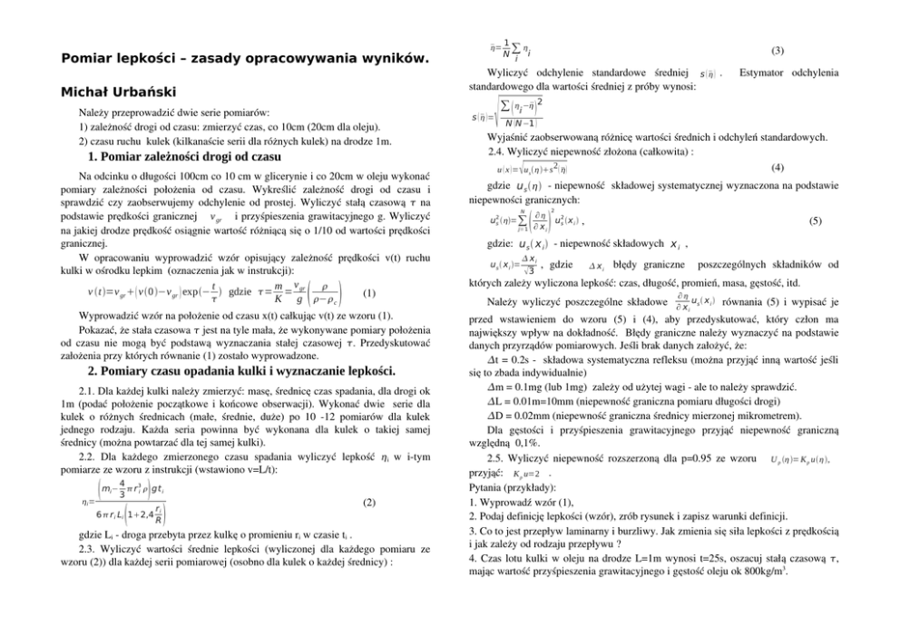 Pomiar lepkości – zasady opracowywania wyników. Należy przeprowadzić dwie serie pomiarów: 1) zależność drogi od czasu: zmierzyć czas, co 10cm (20cm dla oleju). 2) czasu ruchu kulek (kilkanaście serii dla różnych kulek) na drodze 1m. 1. Pomiar zależności drogi od czasu Na odcinku o długości 100cm co 10 cm w glicerynie i co 20cm w oleju wykonać pomiary zależności położenia od czasu. Wykreślić zależność drogi od czasu i sprawdzić czy zaobserwujemy odchylenie od prostej. Wyliczyć stałą czasową na podstawie prędkości granicznej v gr i przyśpieszenia grawitacyjnego g. Wyliczyć na jakiej drodze prędkość osiągnie wartość różniącą się o 1/10 od wartości prędkości granicznej. W opracowaniu wyprowadzić wzór opisujący zależność prędkości v(t) ruchu kulki w ośrodku lepkim (oznaczenia jak w instrukcji): t m v v t=v gr v0 −v gr exp− gdzie = = gr (1) K g − c Wyprowadzić wzór na położenie od czasu x(t) całkując v(t) ze wzoru (1). Pokazać, że stała czasowa jest na tyle mała, że wykonywane pomiary położenia od czasu nie mogą być podstawą wyznaczania stałej czasowej . Przedyskutować założenia przy których równanie (1) zostało wyprowadzone. 2. Pomiary czasu opadania kulki i wyznaczanie lepkości. 2.1. Dla każdej kulki należy zmierzyć: masę, średnicę czas spadania, dla drogi ok 1m (podać położenie początkowe i końcowe obserwacji). Wykonać dwie serie dla kulek o różnych średnicach (małe, średnie, duże) po 10 12 pomiarów dla kulek jednego rodzaju. Każda seria powinna być wykonana dla kulek o takiej samej średnicy (można powtarzać dla tej samej kulki). 2.2. Dla każdego zmierzonego czasu spadania wyliczyć lepkość i w itym pomiarze ze wzoru z instrukcji (wstawiono v=L/t): i= 4 mi− r 3i g t i 3 6 r i Li 12,4 ri R 1 ∑ i N i (3) Wyliczyć odchylenie standardowe średniej s . Estymator odchylenia standardowego dla wartości średniej z próby wynosi: Michał Urbański = (2) gdzie Li droga przebyta przez kulkę o promieniu ri w czasie ti . 2.3. Wyliczyć wartości średnie lepkości (wyliczonej dla każdego pomiaru ze wzoru (2)) dla każdej serii pomiarowej (osobno dla kulek o każdej średnicy) : s = ∑ i − 2 N N −1 Wyjaśnić zaobserwowaną różnicę wartości średnich i odchyleń standardowych. 2.4. Wyliczyć niepewność złożona (całkowita) : (4) u x = u s s 2 gdzie u s niepewność składowej systematycznej wyznaczona na podstawie niepewności granicznych: N u2s = ∑ j= 1 2 ∂ u2s x i ∂ xi , (5) gdzie: u s x i niepewność składowych x i , us x i = xi 3 , gdzie x i błędy graniczne poszczególnych składników od których zależy wyliczona lepkość: czas, długość, promień, masa, gęstość, itd. Należy wyliczyć poszczególne składowe ∂ u x ∂ xi s i równania (5) i wypisać je przed wstawieniem do wzoru (5) i (4), aby przedyskutować, który człon ma największy wpływ na dokładność. Błędy graniczne należy wyznaczyć na podstawie danych przyrządów pomiarowych. Jeśli brak danych założyć, że: t = 0.2s składowa systematyczna refleksu (można przyjąć inną wartość jeśli się to zbada indywidualnie) m = 0.1mg (lub 1mg) zależy od użytej wagi ale to należy sprawdzić. L = 0.01m=10mm (niepewność graniczna pomiaru długości drogi) D = 0.02mm (niepewność graniczna średnicy mierzonej mikrometrem). Dla gęstości i przyśpieszenia grawitacyjnego przyjąć niepewność graniczną względną 0,1%. 2.5. Wyliczyć niepewność rozszerzoną dla p=0.95 ze wzoru U p = K p u, przyjąć: K p u=2 . Pytania (przykłady): 1. Wyprowadź wzór (1), 2. Podaj definicję lepkości (wzór), zrób rysunek i zapisz warunki definicji. 3. Co to jest przepływ laminarny i burzliwy. Jak zmienia się siła lepkości z prędkością i jak zależy od rodzaju przepływu ? 4. Czas lotu kulki w oleju na drodze L=1m wynosi t=25s, oszacuj stałą czasową , mając wartość przyśpieszenia grawitacyjnego i gęstość oleju ok 800kg/m3.