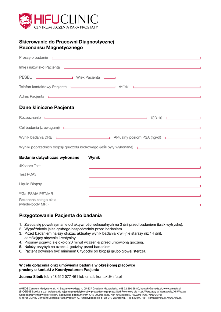 Skierowanie do Pracowni Diagnostycznej Rezonansu Magnetycznego Proszę o badanie Imię i nazwisko Pacjenta PESEL Wiek Pacjenta e-mail Telefon kontaktowy Pacjenta Adres Pacjenta Dane kliniczne Pacjenta Rozpoznanie ICD 10 Cel badania (z uwagami) Wynik badania DRE Aktualny poziom PSA (ng/dl) Wyniki poprzednich biopsji gruczołu krokowego (jeśli były wykonane) Badanie dotychczas wykonane Wynik 4Kscore Test Test PCA3 Liquid Biopsy Ga-PSMA PET/MR 68 Rezonans całego ciała (whole-body MRI) Przygotowanie Pacjenta do badania 1. 2. 3. 4. 5. 6. Zaleca się powstrzymanie od aktywności seksualnych na 3 dni przed badaniem (brak wytrysku). Wypróżnienie jelita grubego bezpośrednio przed badaniem. Przed badaniem należy okazać aktualny wynik badania krwi (nie starszy niż 14 dni), określający stężenie kreatyniny. Prosimy pojawić się około 20 minut wcześniej przed umówioną godziną. Należy przybyć na czczo 4 godziny przed badaniem. Pacjent powinien być minimum 6 tygodni po biopsji gruboigłowej stercza. W celu opłacenia oraz umówienia badania w określonej placówce prosimy o kontakt z Koordynatorem Pacjenta Joanna Sitnik tel: +48 512 077 461 lub email: [email protected] AMEDS Centrum Medyczne, ul. H. Szczerkowskiego 4, 05-827 Grodzisk Mazowiecki, +48 22 290 28 80, [email protected], www.ameds.pl (BIOGENE Spółka z o.o. wpisaną do rejestru przedsiębiorców prowadzonego przez Sąd Rejonowy dla m.st. Warszawy w Warszawie, XII Wydział Gospodarczy Krajowego Rejestru Sądowego pod numerem KRS 0000381838, NIP 7010288182, REGON 142877960 2016). © HIFU CLINIC Centrum Leczenia Raka Prostaty, Al. Rzeczypospolitej 5, 02-972 Warszawa, + 48 512 077 461, [email protected], www.hifu.pl.