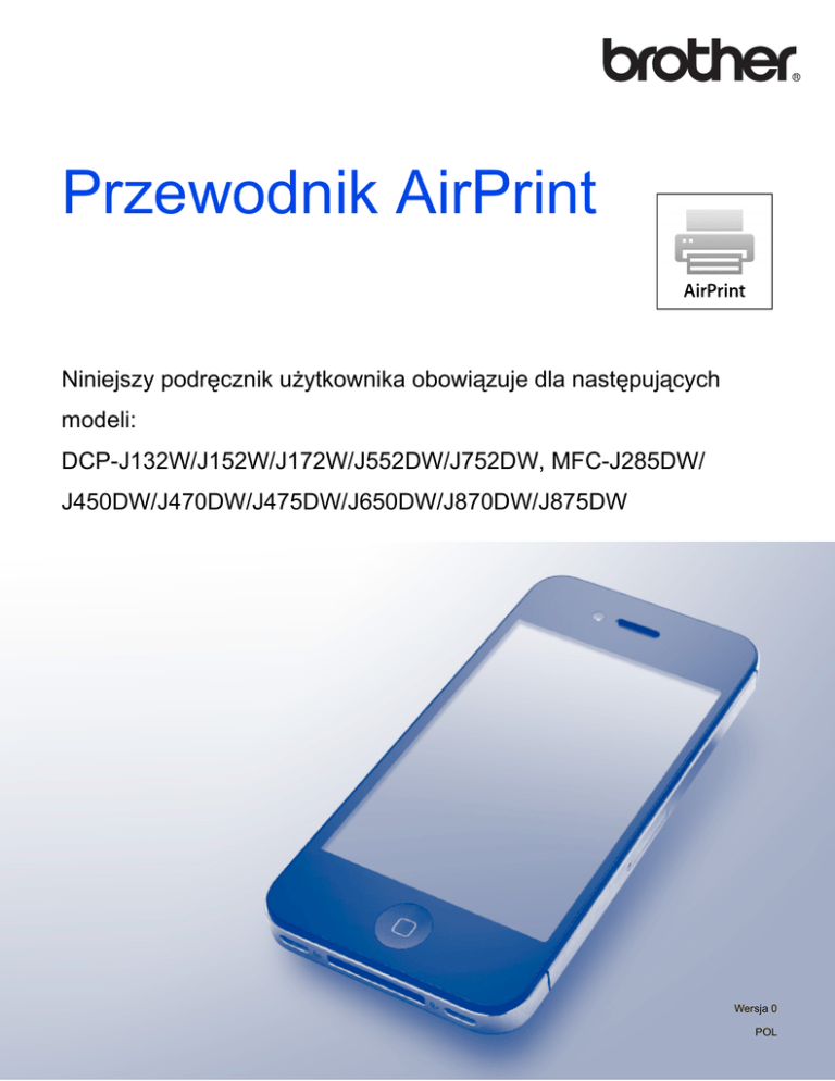 Przewodnik AirPrint Niniejszy podręcznik użytkownika obowiązuje dla następujących modeli: DCP-J132W/J152W/J172W/J552DW/J752DW, MFC-J285DW/ J450DW/J470DW/J475DW/J650DW/J870DW/J875DW Wersja 0 POL Definicje oznaczeń W niniejszym podręczniku użytkownika zastosowano następującą ikonę: INFORMACJA Informacje dotyczą tego, jak należy reagować w danej sytuacji lub zawierają wskazówki dotyczące wykonywania czynności w kontekście innych funkcji. Znaki handlowe Logo Brother jest zastrzeżonym znakiem handlowym firmy Brother Industries, Ltd. Brother jest znakiem handlowym firmy Brother Industries, Ltd. Apple, Macintosh, iPad, iPhone, iPod, iPod touch, OS X i Safari są znakami handlowymi firmy Apple Inc., zastrzeżonymi w Stanach Zjednoczonych i w innych krajach. AirPrint i logo AirPrint są znakami handlowymi firmy Apple Inc. Wi-Fi Direct jest znakiem handlowym grupy Wi-Fi Alliance. Każda firma, której nazwa oprogramowania została wymieniona w niniejszym podręczniku, posiada umowę licencyjną na oprogramowanie będące jej własnością. Wszystkie nazwy handlowe oraz nazwy produktów spółek występujące na produktach Brother, powiązane dokumenty oraz wszelkie inne materiały są znakami towarowymi lub zastrzeżonymi znakami towarowymi odpowiednich spółek. ©2013 Brother Industries, Ltd. Wszelkie prawa zastrzeżone. i Spis Treści 1 Wprowadzenie 1 Przegląd ................................................................................................................................................... 1 Wymagania sprzętowe ............................................................................................................................ 1 Obsługiwane systemy operacyjne ..................................................................................................... 1 Ustawienia sieciowe .......................................................................................................................... 1 2 Drukowanie 5 Drukowanie z urządzeń iPad, iPhone oraz iPod touch ............................................................................ 5 Drukowanie z wykorzystaniem systemu OS X v10.7 lub nowszej ........................................................... 5 A Rozwiązywanie problemów 7 W przypadku problemów z urządzeniem ................................................................................................. 7 Wyłączanie/włączanie funkcji AirPrint za pomocą aplikacji Zarządzanie przez Internet (przeglądarka WWW) .................................................................................................................................................. 7 ii 1 Wprowadzenie 1 Przegląd Funkcja AirPrint umożliwia bezprzewodowe drukowanie zdjęć, wiadomości e-mail, stron internetowych i dokumentów z urządzeń iPad, iPhone oraz iPod touch bez potrzeby instalowania sterowników. Żądanie drukowania Drukowanie Wymagania sprzętowe Obsługiwane systemy operacyjne Funkcja AirPrint jest zgodna z urządzeniami iPad (wszystkie modele), iPhone (3GS lub nowszy) i iPod touch (3. generacja lub nowszy), działającymi pod kontrolą najnowszej wersji systemu iOS. Więcej informacji można uzyskać na stronie internetowej firmy Apple: (http://support.apple.com/kb/HT4356). Ustawienia sieciowe Aby było możliwe korzystanie z funkcji AirPrint, urządzenie mobilne musi być połączone z siecią bezprzewodową, do której zostało także podłączone urządzenie Brother. Funkcja AirPrint obsługuje połączenia bezprzewodowe wykorzystujące tryb Ad-hoc, tryb infrastruktury lub Wi-Fi Direct™ (tylko obsługiwane modele). Aby skonfigurować urządzenie mobilne do pracy w sieci bezprzewodowej, zapoznaj się z podręcznikiem użytkownika urządzenia mobilnego. Łącze do podręcznika użytkownika urządzenia mobilnego, który jest dostępny na stronie internetowej firmy Apple, jest dostępne po naciśnięciu przycisku w przeglądarce Safari. Aby skonfigurować urządzenie Brother do pracy w sieci bezprzewodowej, patrz Podręcznik szybkiej obsługi lub Podręczniki oprogramowania i obsługi dla sieci urządzenia Brother. Jeśli urządzenie Brother obsługuje technologię Wi-Fi Direct™ i chcesz skonfigurować urządzenie Brother do połączenia z siecią Wi-Fi Direct™, pobierz Podręcznik Wi-Fi Direct™ z witryny Brother Solutions Center pod adresem http://solutions.brother.com/. 1 Wprowadzenie Tryb Ad-hoc Pozwala połączyć urządzenie mobilne z urządzeniem Brother bez potrzeby korzystania z bezprzewodowego punktu dostępowego lub routera. 1 2 1 Urządzenie mobilne 2 Urządzenie bezprzewodowe (urządzenie Brother użytkownika) 2 1 Wprowadzenie Tryb infrastruktury Pozwala połączyć urządzenie mobilne z urządzeniem Brother za pośrednictwem bezprzewodowego punktu dostępowego lub routera. Gdy urządzenie Brother jest połączone z bezprzewodowym punktem dostępowym lub routerem z wykorzystaniem funkcji sieci bezprzewodowej urządzenia: 1 2 3 1 Urządzenie mobilne 2 Bezprzewodowy punkt dostępowy lub router 3 Urządzenie bezprzewodowe (urządzenie Brother użytkownika) Gdy urządzenie Brother jest połączone z bezprzewodowym punktem dostępowym lub routerem z wykorzystaniem przewodu sieciowego: 1 2 4 3 1 Urządzenie mobilne 2 Bezprzewodowy punkt dostępowy lub router 3 Przewód sieciowy 4 Urządzenie przewodowe lub bezprzewodowe (urządzenie Brother użytkownika) 3 1 Wprowadzenie Sieć Wi-Fi Direct™ (tylko obsługiwane modele) Pozwala połączyć urządzenie mobilne z urządzeniem Brother za pomocą funkcji Wi-Fi Direct™. Wi-Fi Direct™ pozwala skonfigurować bezpieczne bezprzewodowe połączenie sieciowe między urządzeniem Brother a urządzeniem mobilnym bez korzystania z punktu dostępowego. 1 1 2 1 Urządzenie mobilne 2 Urządzenie Brother użytkownika INFORMACJA Podczas korzystania z połączenia Wi-Fi Direct™ urządzenie Brother obsługuje tylko komunikację bezprzewodową jeden-do-jednego. 4 2 Drukowanie Drukowan