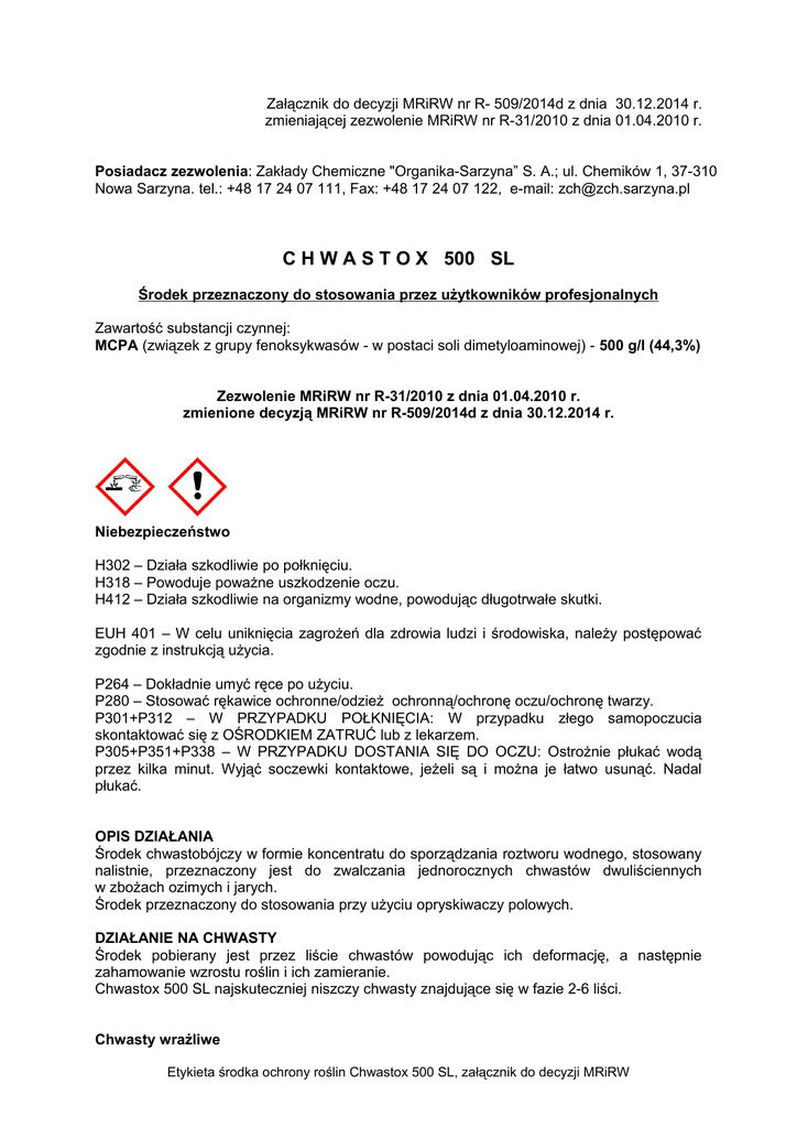 Załącznik do decyzji MRiRW nr R- 509/2014d z dnia 30.12.2014 r. zmieniającej zezwolenie MRiRW nr R-31/2010 z dnia 01.04.2010 r. Posiadacz zezwolenia: Zakłady Chemiczne "Organika-Sarzyna” S. A.; ul. Chemików 1, 37-310 Nowa Sarzyna. tel.: +48 17 24 07 111, Fax: +48 17 24 07 122, e-mail: [email protected] C H W A S T O X 500 SL Środek przeznaczony do stosowania przez użytkowników profesjonalnych Zawartość substancji czynnej: MCPA (związek z grupy fenoksykwasów - w postaci soli dimetyloaminowej) - 500 g/l (44,3%) Zezwolenie MRiRW nr R-31/2010 z dnia 01.04.2010 r. zmienione decyzją MRiRW nr R-509/2014d z dnia 30.12.2014 r. Niebezpieczeństwo H302 – Działa szkodliwie po połknięciu. H318 – Powoduje poważne uszkodzenie oczu. H412 – Działa szkodliwie na organizmy wodne, powodując długotrwałe skutki. EUH 401 – W celu uniknięcia zagrożeń dla zdrowia ludzi i środowiska, należy postępować zgodnie z instrukcją użycia. P264 – Dokładnie umyć ręce po użyciu. P280 – Stosować rękawice ochronne/odzież ochronną/ochronę oczu/ochronę twarzy. P301+P312 – W PRZYPADKU POŁKNIĘCIA: W przypadku złego samopoczucia skontaktować się z OŚRODKIEM ZATRUĆ lub z lekarzem. P305+P351+P338 – W PRZYPADKU DOSTANIA SIĘ DO OCZU: Ostrożnie płukać wodą przez kilka minut. Wyjąć soczewki kontaktowe, jeżeli są i można je łatwo usunąć. Nadal płukać. OPIS DZIAŁANIA Środek chwastobójczy w formie koncentratu do sporządzania roztworu wodnego, stosowany nalistnie, przeznaczony jest do zwalczania jednorocznych chwastów dwuliściennych w zbożach ozimych i jarych. Środek przeznaczony do stosowania przy użyciu opryskiwaczy polowych. DZIAŁANIE NA CHWASTY Środek pobierany jest przez liście chwastów powodując ich deformację, a następnie zahamowanie wzrostu roślin i ich zamieranie. Chwastox 500 SL najskuteczniej niszczy chwasty znajdujące się w fazie 2-6 liści. Chwasty wrażliwe Etykieta środka ochrony roślin Chwastox 500 SL, załącznik do decyzji MRiRW - dawka 1,5 l /ha : dymnica pospolita, tasznik pospolity, - dawka 1,1 l/ha : komosa biała, mak polny, poziewnik szorstki, sporek polny, tobołki polne. Chwasty odporne: bodziszek drobny, fiołek polny, gwiazdnica pospolita, maruna bezwonna, przetacznik polny, przytulia czepna, rdest powojowy, chwasty jednoliścienne. STOSOWANIE ŚRODKA Pszenica ozima, jęczmień ozimy, pszenżyto ozime, żyto Maksymalna / zalecana dawka dla jednorazowego zastosowania:1,5 l/ha. Termin stosowania: Środek stosować wiosną po ruszeniu wegetacji do końca fazy krzewienia (BBCH 20-29) Pszenica jara, jęczmień jary, pszenżyto jare, owies. Maksymalna / zalecana dawka dla jednorazowego zastosowania: 1,1 l/ha. Termin stosowania: Środek stosować od początku fazy krzewienia do końca fazy krzewienia (BBCH 20-29). Zalecana ilość wody: 200-300 l/ha. Zalecane opryskiwanie: średniokropliste. Maksymalna liczba zabiegów w sezonie wegetacyjnym: 1 NASTĘPSTWO ROŚLIN Środek rozkłada się w czasie wegetacji nie stwarzając zagrożenia dla roślin uprawianych następczo. W przypadku konieczności zaorania plantacji potraktowanej środkiem, po wykonaniu uprawy przedsiewnej można uprawiać inne rośliny z wyjątkiem gatunków szczególnie wrażliwych na środek, np. pomidor, burak. ŚRODKI OSTROŻNOŚCI PRAKTYKĄ ROLNICZĄ 1. - 2. - - I ZALECENIA STOSOWANIA ZWIĄZANE Z DOBRĄ Nie stosować środka: na rośliny chore, wylegnięte i uszkodzone, w temperaturze powietrza poniżej 10oC i powyżej 25oC, w okresie, gdy temperatura nocą jest niższa niż 5oC, w okresie nadmiernej suszy lub zbliżających się dreszczów, podczas wiatru, stwarzającego możliwość znoszenia cieczy użytkowej na sąsiednie rośliny uprawne. Podczas stosowania środka nie dopuścić do: znoszenia cieczy użytkowej na sąsiednie plantacje roślin uprawnych, nakładania się cieczy użytkowej na stykach pasów zabiegowych i uwrociach. SPORZĄDZANIE CIECZY UŻYTKOWEJ I TECHNIKA OPRYSKIWANIA Przed przystąpieniem do sporządzania cieczy użytkowej dokładnie ustalić potrzebną jej ilość. Odmierzoną ilość środka wlać do zbiornika opryskiwacza napełnionego częściowo wodą (z włączonym mieszadłem). Opróżnione opakowania przepłukać trzykrotnie wodą, a popłuczyny wlać do zbiornika opryskiwacza z cieczą użytkową. Zbiornik opryskiwacza uzupełnić wodą do potrzebnej ilości. Po wlaniu środka do zbiornika opryskiwacza nie wyposażonego w mieszadło hydrauliczne ciecz w zbiorniku mechanicznie wymieszać. W przypadku przerw w opryskiwaniu przed ponownym przystąpieniem do pracy, dokładnie wymieszać ciecz użytkową w zbiorniku opryskiwacza. POSTĘPOWANIE Z RESZTKAMI CIECZY UŻYTKOWEJ I MYCIE APARATURY Etykieta środka ochrony roślin Chwastox 500 SL, załącznik do decyzji MRiRW Z resztkami cieczy użytkowej po zabiegu należy postępować w sposób ograniczający ryzyko skażenia wód powierzchniowych i podziemnych w rozumieniu przepisów Prawa wodnego oraz skażenia gruntu, tj.: – po uprzednim rozcieńczeniu zużyć na powierzchni, na której przeprowadzono zabieg, jeżeli jest to możliwe lub – unieszkodliwić z wykorzystaniem rozwiązań technicznych zapewniających biologiczną degradację substancji czynnych środków ochrony roślin, lub – unieszkodliwić w inny sposób, zgodny z przepisami o odpadach. Po pracy aparaturę dokładnie wymyć. Uwaga: Ze względu na bardzo dużą wrażliwość niektórych roślin uprawnych nawet na znikome ilości środka, bardzo ważne jest dokładne wymycie opryskiwacza po zabiegu, zwłaszcza przed użyciem w innych roślinach niż zalecane. WARUNKI BEZPIECZNEGO STOSOWANIA ŚRODKA Przed zastosowaniem środka należy poinformować o tym fakcie wszystkie zainteresowane strony, które mogą być narażone na znoszenie cieczy roboczej i które zwróciły się o taką informację. Środki ostrożności dla osób stosujących środek: Nie jeść, nie pić ani nie palić podczas używania produktu. S