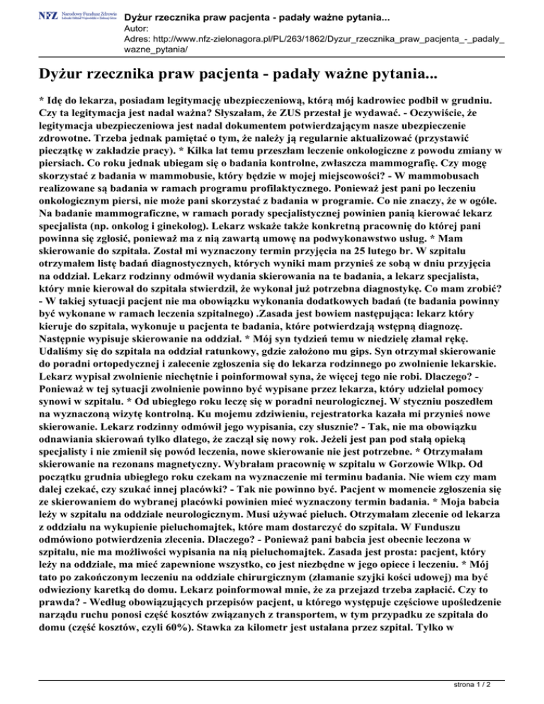 Dyżur rzecznika praw pacjenta - padały ważne pytania... Autor: Adres: http://www.nfz-zielonagora.pl/PL/263/1862/Dyzur_rzecznika_praw_pacjenta_-_padaly_ wazne_pytania/ Dyżur rzecznika praw pacjenta - padały ważne pytania... * Idę do lekarza, posiadam legitymację ubezpieczeniową, którą mój kadrowiec podbił w grudniu. Czy ta legitymacja jest nadal ważna? Słyszałam, że ZUS przestał je wydawać. - Oczywiście, że legitymacja ubezpieczeniowa jest nadal dokumentem potwierdzającym nasze ubezpieczenie zdrowotne. Trzeba jednak pamiętać o tym, że należy ją regularnie aktualizować (przystawić pieczątkę w zakładzie pracy). * Kilka lat temu przeszłam leczenie onkologiczne z powodu zmiany w piersiach. Co roku jednak ubiegam się o badania kontrolne, zwłaszcza mammografię. Czy mogę skorzystać z badania w mammobusie, który będzie w mojej miejscowości? - W mammobusach realizowane są badania w ramach programu profilaktycznego. Ponieważ jest pani po leczeniu onkologicznym piersi, nie może pani skorzystać z badania w programie. Co nie znaczy, że w ogóle. Na badanie mammograficzne, w ramach porady specjalistycznej powinien panią kierować lekarz specjalista (np. onkolog i ginekolog). Lekarz wskaże także konkretną pracownię do której pani powinna się zgłosić, ponieważ ma z nią zawartą umowę na podwykonawstwo usług. * Mam skierowanie do szpitala. Został mi wyznaczony termin przyjęcia na 25 lutego br. W szpitalu otrzymałem listę badań diagnostycznych, których wyniki mam przynieś ze sobą w dniu przyjęcia na oddział. Lekarz rodzinny odmówił wydania skierowania na te badania, a lekarz specjalista, który mnie kierował do szpitala stwierdził, że wykonał już potrzebna diagnostykę. Co mam zrobić? - W takiej sytuacji pacjent nie ma obowiązku wykonania dodatkowych badań (te badania powinny być wykonane w ramach leczenia szpitalnego) .Zasada jest bowiem następująca: lekarz który kieruje do szpitala, wykonuje u pacjenta te badania, które potwierdzają wstępną diagnozę. Następnie wypisuje skierowanie na oddział. * Mój syn tydzień temu w niedzielę złamał rękę. Udaliśmy się do szpitala na oddział ratunkowy, gdzie założono mu gips. Syn otrzymał skierowanie do poradni ortopedycznej i zalecenie zgłoszenia się do lekarza rodzinnego po zwolnienie lekarskie. Lekarz wypisał zwolnienie niechętnie i poinformował syna, że więcej tego nie robi. Dlaczego? Ponieważ w tej sytuacji zwolnienie powinno być wypisane przez lekarza, który udzielał pomocy synowi w szpitalu. * Od ubiegłego roku leczę się w poradni neurologicznej. W styczniu poszedłem na wyznaczoną wizytę kontrolną. Ku mojemu zdziwieniu, rejestratorka kazała mi przynieś nowe skierowanie. Lekarz rodzinny odmówił jego wypisania, czy słusznie? - Tak, nie ma obowiązku odnawiania skierowań tylko dlatego, że zaczął się nowy rok. Jeżeli jest pan pod stałą opieką specjalisty i nie zmienił się powód leczenia, nowe skierowanie nie jest potrzebne. * Otrzymałam skierowanie na rezonans magnetyczny. Wybrałam pracownię w szpitalu w Gorzowie Wlkp. Od początku grudnia ubiegłego roku czekam na wyznaczenie mi terminu badania. Nie wiem czy mam dalej czekać, czy szukać innej placówki? - Tak nie powinno być. Pacjent w momencie zgłoszenia się ze skierowaniem do wybranej placówki powinien mieć wyznaczony termin badania. * Moja babcia leży w szpitalu na oddziale neurologicznym. Musi używać pieluch. Otrzymałam zlecenie od lekarza z oddziału na wykupienie pieluchomajtek, które mam dostarczyć do szpitala. W Funduszu odmówiono potwierdzenia zlecenia. Dlaczego? - Ponieważ pani babcia jest obecnie leczona w szpitalu, nie ma możliwości wypisania na nią pieluchomajtek. Zasada jest prosta: pacjent, który leży na oddziale, ma mieć zapewnione wszystko, co jest niezbędne w jego opiece i leczeniu. * Mój tato po zakończonym leczeniu na oddziale chirurgicznym (złamanie szyjki kości udowej) ma być odwieziony karetką do domu. Lekarz poinformował mnie, że za przejazd trzeba zapłacić. Czy to prawda? - Według obowiązujących przepisów pacjent, u którego występuje częściowe upośledzenie narządu ruchu ponosi część kosztów związanych z transportem, w tym przypadku ze szpitala do domu (część kosztów, czyli 60%). Stawka za kilometr jest ustalana przez szpital. Tylko w strona 1 / 2 Dyżur rzecznika praw pacjenta - padały ważne pytania... Autor: Adres: http://www.nfz-zielonagora.pl/PL/263/1862/Dyzur_rzecznika_praw_pacjenta_-_padaly_ wazne_pytania/ przypadku, gdy pacjent w ogóle się nie porusza, transport jest dla niego bezpłatny. * Mojego 10-letniego syna wczoraj rano rozbolał ząb. Obdzwoniliśmy chyba piętnastu dentystów, aby znaleźć takiego, który zgodził się go przyjąć… - W przypadku bólu zęba, pacjent (a zwłaszcza dziecko) powinien być przyjęty w dniu zgłoszenia. Nie możemy jednak wymagać, aby stomatolog przyjął nas natychmiast. Nasz Rzecznik Praw Pacjenta Anna Gwara, miała niedawno w Gazecie Lubuskiej dyżur telefoniczny. W ciągu godziny odebrała wiele telefonów od pacjentów i ich rodzin. Jakie pytania padały? Przedstawiamy te najczęstsze. Oto relacja: strona 2 / 2 Powered by TCPDF (www.tcpdf.org)