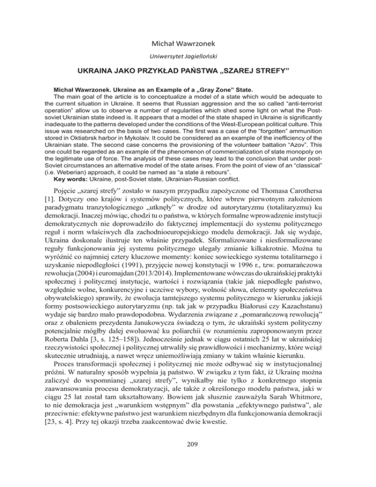 Michał Wawrzonek Uniwersytet Jagielloński UKRAINA JAKO PRZYKŁAD PAŃSTWA „SZAREJ STREFY” Michał Wawrzonek. Ukraine as an Example of a „Gray Zone” State. The main goal of the article is to conceptualize a model of a state which would be adequate to the current situation in Ukraine. It seems that Russian aggression and the so called “anti-terrorist operation” allow us to observe a number of regularities which shed some light on what the Postsoviet Ukrainian state indeed is. It appears that a model of the state shaped in Ukraine is significantly inadequate to the patterns developed under the conditions of the West-European political culture. This issue was researched on the basis of two cases. The first was a case of the “forgotten” ammunition stored in Oktiabrsk harbor in Mykolaiv. It could be considered as an example of the inefficiency of the Ukrainian state. The second case concerns the provisioning of the volunteer battalion “Azov”. This one could be regarded as an example of the phenomenon of commercialization of state monopoly on the legitimate use of force. The analysis of these cases may lead to the conclusion that under postSoviet circumstances an alternative model of the state arises. From the point of view of an “classical” (i.e. Weberian) approach, it could be named as “a state à rebours”. Key words: Ukraine, post-Soviet state, Ukrainian-Russian conflict. Pojęcie „szarej strefy” zostało w naszym przypadku zapożyczone od Thomasa Carothersa [1]. Dotyczy ono krajów i systemów politycznych, które wbrew pierwotnym założeniom paradygmatu tranzytologicznego „utknęły” w drodze od autorytaryzmu (totalitaryzmu) ku demokracji. Inaczej mówiąc, chodzi tu o państwa, w których formalne wprowadzenie instytucji demokratycznych nie doprowadziło do faktycznej implementacji do systemu politycznego reguł i norm właściwych dla zachodnioeuropejskiego modelu demokracji. Jak się wydaje, Ukraina doskonale ilustruje ten właśnie przypadek. Sformalizowane i niesformalizowane reguły funkcjonowania jej systemu politycznego ulegały zmianie kilkakrotnie. Można tu wyróżnić co najmniej cztery kluczowe momenty: koniec sowieckiego systemu totalitarnego i uzyskanie niepodległości (1991), przyjęcie nowej konstytucji w 1996 r., tzw. pomarańczowa rewolucja (2004) i euromajdan (2013/2014). Implementowane wówczas do ukraińskiej praktyki społecznej i politycznej instytucje, wartości i rozwiązania (takie jak niepodległe państwo, względnie wolne, konkurencyjne i uczciwe wybory, wolność słowa, elementy społeczeństwa obywatelskiego) sprawiły, że ewolucja tamtejszego systemu politycznego w kierunku jakiejś formy postsowieckiego autorytaryzmu (np. tak jak w przypadku Białorusi czy Kazachstanu) wydaje się bardzo mało prawdopodobna. Wydarzenia związane z „pomarańczową rewolucją” oraz z obaleniem prezydenta Janukowycza świadczą o tym, że ukraiński system polityczny potencjalnie mógłby dalej ewoluować ku poliarchii (w rozumieniu zaproponowanym przez Roberta Dahla [3, s. 125‒158]). Jednocześnie jednak w ciągu ostatnich 25 lat w ukraińskiej rzeczywistości społecznej i politycznej utrwaliły się prawidłowości i mechanizmy, które wciąż skutecznie utrudniają, a nawet wręcz uniemożliwiają zmiany w takim właśnie kierunku. Proces transformacji społecznej i politycznej nie może odbywać się w instytucjonalnej próżni. W naturalny sposób wypełnia ją państwo. W związku z tym fakt, iż Ukrainę można zaliczyć do wspomnianej „szarej strefy”, wynikałby nie tylko z konkretnego stopnia zaawansowania procesu demokratyzacji, ale także z określonego modelu państwa, jaki w ciągu 25 lat został tam ukształtowany. Bowiem jak słusznie zauważyła Sarah Whitmore, to nie demokracja jest „warunkiem wstępnym” dla powstania „efektywnego państwa”, ale przeciwnie: efektywne państwo jest warunkiem niezbędnym dla funkcjonowania demokracji [23, s. 4]. Przy tej okazji trzeba zaakcentować dwie kwestie. 209 Pierwsza kwestia, to problem efektywności państwa. Nie chodzi tu bowiem o samą sprawność instytucji państwowych, ale także o jej ukierunkowanie. Jeżeli byłaby ona wykorzystywana do „efektywnego wspierania rządów prawa” i uodparniałaby ona struktury państwowe na naciski różnych grup interesów [4, s. 15], to państwo, które jest efektywne w taki sposób, można uznać za niezbędny element instytucjonalnej bazy dla procesu demokratyzacji. Tymczasem efektywność państwa ukraińskiego jest w znacznym stopniu ukierunkowana na skuteczne zabezpieczenie „renty władzy” dla nieformalnych, wyalienowanych z ogółu społeczeństwa klanów nomenklaturowo-oligarchicznych. Jest to rezultat „świadomego wyboru dbających o własny interes i niepewnych siebie elit” [9, s. 418]. W tej sytuacji nawet jeżeli można mówić o konsolidacji ukraińskiej państwowości, to jej wpływ na demokratyzację (poliarchizację) ukraińskiego systemu politycznego niekoniecznie będzie pozytywny. Drugi problem, na który warto zwrócić uwagę, to odpowiednia sekwencja wydarzeń. Powodzenie procesu demokratyzacji zależy w znacznej mierze od tego, czy zostały konkretnie zdefiniowane granice wspólnoty, której ma on dotyczyć oraz czy nastąpiła odpowiednia transformacja państwa ukierunkowana na dobro tejże wspólnoty. Taka kolejność przemian ułatwia demokratycznym regułom i instytucjom modyfikację świadomości i praktyki społecznej. Na Ukrainie mamy do czynienia z „inwersyjną logiką rozwoju”, to znaczy, że zaczęto tu wprowadzać demokratyczne instytucje, zanim zostały rozwiązane podstawowe kwestie dotyczące budowy państwa, zdefiniowania wspólnoty politycznej oraz stosunku do byłej metropolii [6; 10]. W przypadku Ukrainy przynależność do „szarej strefy” oznaczałaby nie tylko stan zawieszenia pomiędzy niedemokracją a demokracją oraz pomiędzy „właściwie” i „niewła