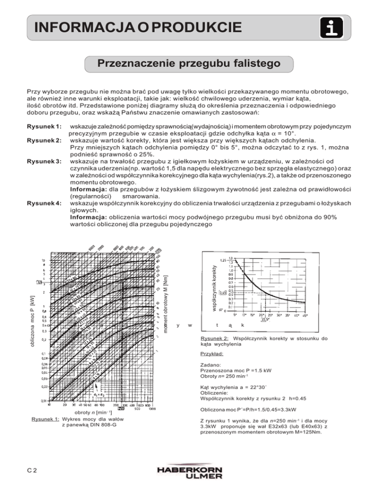 INFORMACJA O PRODUKCIE Przeznaczenie przegubu falistego Przy wyborze przegubu nie mo¿na braæ pod uwagê tylko wielkoci przekazywanego momentu obrotowego, ale równie¿ inne warunki eksploatacji, takie jak: wielkoæ chwilowego uderzenia, wymiar k¹ta, iloæ obrotów itd. Przedstawione poni¿ej diagramy s³u¿¹ do okrelenia przeznaczenia i odpowiedniego doboru przegubu, oraz wska¿¹ Pañstwu znaczenie omawianych zastosowañ: Rysunek 3: obliczona moc P [kW] Rysunek 4: α a i n e l y h c wspó³czynnik korekty η Rysunek 2: wskazuje zale¿noæ pomiêdzy sprawnoci¹(wydajnoci¹) i momentem obrotowym przy pojedynczym precyzyjnym przegubie w czasie eksploatacji gdzie odchy³ka k¹ta α = 10°. wskazuje wartoæ korekty, która jest wiêksza przy wiêkszych k¹tach odchylenia. Przy mniejszych k¹tach odchylenia pomiêdzy 0° bis 5°, mo¿na odczytaæ to z rys. 1, mo¿na podnieæ sprawnoæ o 25%. wskazuje na trwa³oæ przegubu z igie³kowym ³o¿yskiem w urz¹dzeniu, w zale¿noci od czynnika uderzenia(np. wartoæ 1,5 dla napêdu elektrycznego bez sprzêg³a elastycznego) oraz w zale¿noci od wspó³czynnika korekcyjnego dla k¹ta wychylenia(rys.2), a tak¿e od przenoszonego momentu obrotowego. Informacja: dla przegubów z ³o¿yskiem lizgowym ¿ywotnoæ jest zale¿na od prawid³owoci (regularnoci) smarowania. wskazuje wspó³czynnik korekcyjny do obliczenia trwa³oci urz¹dzenia z przegubami o ³o¿yskach ig³owych. Informacja: obliczenia wartoci mocy podwójnego przegubu musi byæ obni¿ona do 90% wartoci obliczonej dla przegubu pojedynczego moment obrotowy M [Nm] Rysunek 1: y w t ¹ k Rysunek 2: Wspó³czynnik korekty w stosunku do k¹ta wychylenia Przyk³ad: Zadano: Przenoszona moc P =1.5 kW Obroty n= 250 min -1 K¹t wychylenia a = 22°30´ Obliczenie: Wspó³czynnik korekty z rysunku 2 h=0.45 obroty n [min - 1] Rysunek 1: Wykres mocy dla wa³ów z panewk¹ DIN 808-G C2 Obliczona moc P´=P/h=1.5/0.45=3.3kW Z rysunku 1 wynika, ¿e dla n=250 min -1 i dla mocy 3.3kW proponuje siê wa³ E32x63 (lub E40x63) z przenoszonym momentem obrotowym M=125Nm. redukowany moment obrotowy M red Nm wspó³czynnik korekty η INFORMACJA O PRODUKCIE k¹t wychylenia a Rysunek 4:Wspó³czynnik korekty w stosunku do k¹ta wychylenia sprawie dodatkowych f z=wspó³czynnik uderzenia ( w technicznych informacji prosimy kontaktowaæ siê z firm¹ ULMER POLSKA ) h=wspó³czynnik korekty (dla rysunku 4) M=przenoszony moment obrotowy Mred=M . f z . h Przyk³ad: Zadano: Przenoszony moment obrotowy M =70 Nm Obroty n= 1400 min -1 ¯ywotnoæ L= 500 h K¹t wychylenia a=20° Wspó³czynnik uderzenia f z= 1.5 Wspó³czynnik korekty z rysunku 4 h=1.1 Redukowany moment obrotowy Mred =M x f z x h= 70 x 1.5 x 1.1=116 L x n = 500 x 1400 = 700 000 = 70 x 10 4 Wg rysunku 3 proponuje siê wa³ E32x63. ¿ywotnoæ x obroty Rysunek 3: Wykres ¿ywotnoci dla wa³ów z igie³kowym ³o¿yskiem DIN 808-W Wskazówki monta¿owe: Büco-precyzyjne przeguby faliste i wa³y przegubowe s¹ niezbêdnymi i wielostronnymi czêciami urz¹dzeñ, które s³u¿¹ do przenoszenia momentu obrotowego napêdu do urz¹dzenia wykonawczego. Przy po³¹czeniu dwóch wa³ów pojedynczym przegubem falistym pod okrelonym k¹tem mo¿e dojæ do tego, ¿e wa³ napêdzany poruszaæ siê bêdzie nierównomiernie.Ta nierównomiernoæ znana jako b³¹d Kardana powoduje sinosuidalne przypieszenie lub zwolnienie prêdkoci obrotowej wa³u napêdzanego, przy czym nierównomiernoæ ronie ze wzrostem k¹ta nachylenia a. Dlatego te¿ pojedyncze przeguby faliste mog¹ byæ u¿ywane tylko tam, gdzie jest dopuszczalna nierównomiernoæ obrotów. Ta nierównomiernoæ mo¿e byæ ograniczana przez uk³ad dwóch pojedynczych przegubów jeden po drugim , albo przez zastosowanie podwójnych przegubów falistych. Przy prawid³owym monta¿u nierównomiernoæ jednego przegubu bêdzie wyrównywana przez drugi przegub, jeli bêd¹ dotrzymywane nastêpuj¹ce normy DIN 808: 1.W po³¹czeniu z dwoma pojedynczymi przegubami nale¿y utrzymaæ prawid³ow¹ wzajemn¹ pozycjê wide³ek tak, aby obydwie wide³ki le¿a³y w jednej p³aszczynie, jak przy podwójnym przegubie. Dobrze: Wide³ki w jednakowym ustawieniu le: Wide³ki odwrócone o 90° 2. Nachylenie k¹ta musi byæ na obydwu koñcach jednakowe. Dobrze: K¹t a wszêdzie jednakowy le: K¹t a i b s¹ ró¿ne C3 INFORMACJA O PRODUKCIE 3. Wa³y - napêdzaj¹cy i napêdzany mog¹ O 1 byæ przy zmianie po³o¿enia przesuwane do siebie tylko równolegle. O 1 O 2 O 2 Dobrze: O 1 jest równolegla do osi 2 4. U³o¿enie parami przegubu wa³ów , lub podwójnych przegubów musz¹ byæ(wa³y) dosuniête do p³aszczyzny tak blisko jak to jest tylko mo¿liwe le: O 1 nie jest równoleg³a do osi 2 Dobrze: le: Mocowanie jest tak blisko jak tylko to mo¿liwe. Mocowanie zbyt dalekie. Konserwacja i smarowanie Do zapewnienia bezawaryjnej eksploatacji przegubów falistych oraz panwii z ³o¿yskami lizgowymi nale¿y przestrzegaæ odpowiednich okresów smarowania. Przeguby faliste z ³o¿yskami igie³kowymi s¹ bezobs³ugowe, a dziêki swej d³ugiej trwa³oci smarowania umieszczone s¹ w trudno dostêpnych miejscach. UWAGA: Przeguby i ich panwie s¹ podczas eksploatacji smarowane litowym wysokoobrotowym smarem na bazie oleju mineralnego. Ró¿nica temperatur: od -30°C do +125°C (ci¹g³e smarowanie) Temperatura maksymalna: 140°C Do kolejnych smarowañ nale¿y u¿ywaæ tylko smarów o identycznych parametrach. Smarowanie: W takiej eksploatacji nale¿a³oby conajmniej raz dziennie smarowaæ wszystkie oznaczone miejsca. Dotyczy to g³ównie po³¹czeñ przegubów z ³o¿yskami lizgowymi (punkt 1 i 2) a tak¿e lizgowych p³aszczyzn wielowypustowych w wa³ach przegubów (punkt 3) Przy eksploatacji z silnym zanieczyszczeniem mechanicznym zaleca siê u¿yæ do odnowy przegubów i wielowypustów specjalnych ochraniaczy. Przez nape³nianie ochraniaczy smarem zapewniamy samosmarowanie na nieokrelony czas. UWAGA: S³u¿ba ruchu jest zobowi¹zana w przepisowych terminach (odstê
