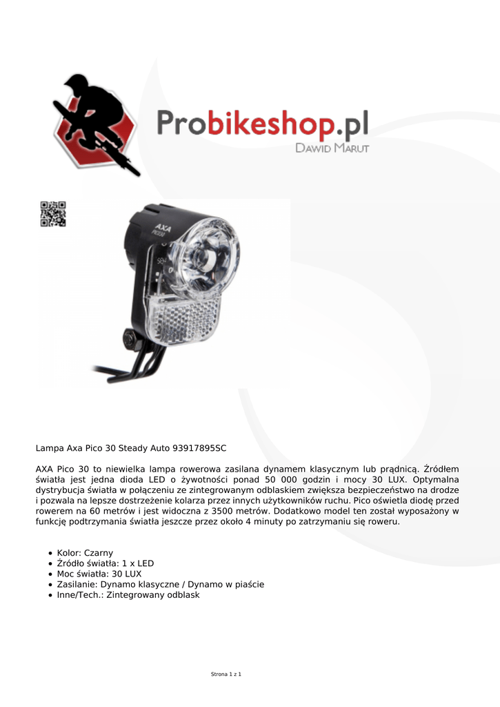 Lampa Axa Pico 30 Steady Auto 93917895SC AXA Pico 30 to niewielka lampa rowerowa zasilana dynamem klasycznym lub prądnicą. Źródłem światła jest jedna dioda LED o żywotności ponad 50 000 godzin i mocy 30 LUX. Optymalna dystrybucja światła w połączeniu ze zintegrowanym odblaskiem zwiększa bezpieczeństwo na drodze i pozwala na lepsze dostrzeżenie kolarza przez innych użytkowników ruchu. Pico oświetla diodę przed rowerem na 60 metrów i jest widoczna z 3500 metrów. Dodatkowo model ten został wyposażony w funkcję podtrzymania światła jeszcze przez około 4 minuty po zatrzymaniu się roweru. Kolor: Czarny Źródło światła: 1 x LED Moc światła: 30 LUX Zasilanie: Dynamo klasyczne / Dynamo w piaście Inne/Tech.: Zintegrowany odblask Strona 1 z 1