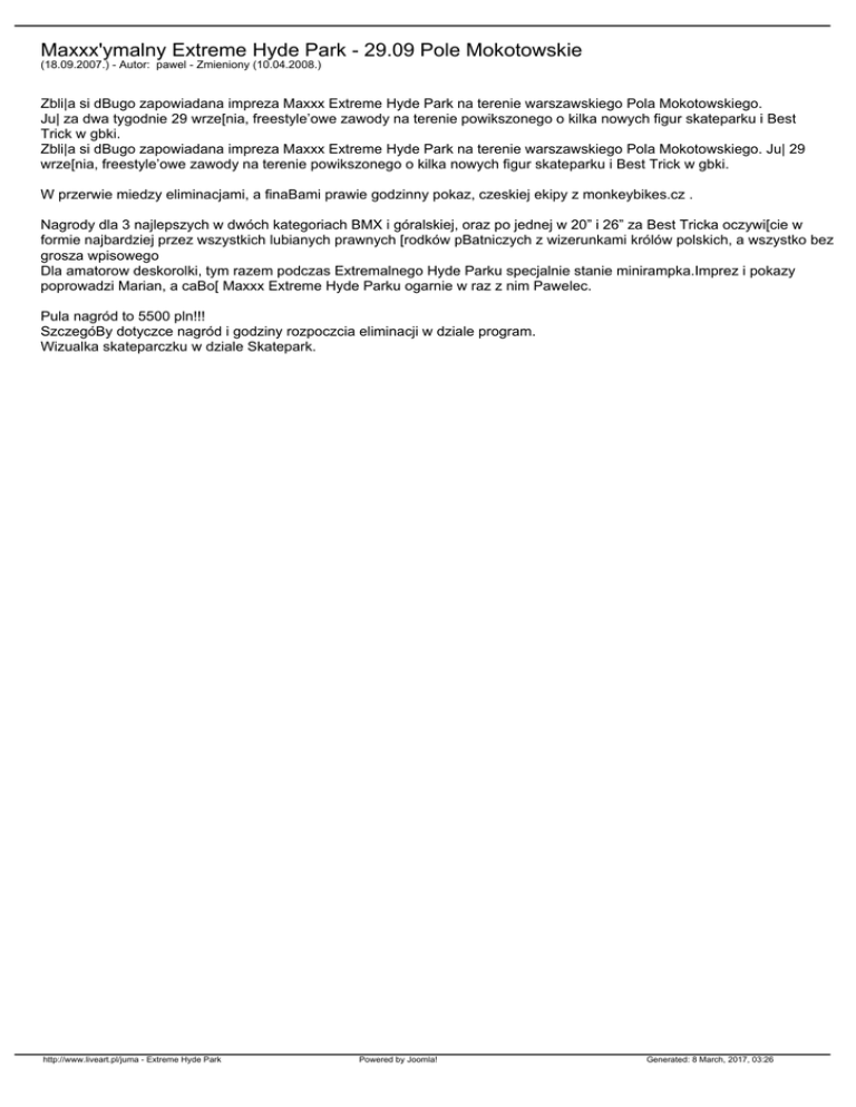 Maxxx'ymalny Extreme Hyde Park - 29.09 Pole Mokotowskie (18.09.2007.) - Autor: pawel - Zmieniony (10.04.2008.) Zbli|a si dBugo zapowiadana impreza Maxxx Extreme Hyde Park na terenie warszawskiego Pola Mokotowskiego. Ju| za dwa tygodnie 29 wrze[nia, freestyle’owe zawody na terenie powikszonego o kilka nowych figur skateparku i Best Trick w gbki. Zbli|a si dBugo zapowiadana impreza Maxxx Extreme Hyde Park na terenie warszawskiego Pola Mokotowskiego. Ju| 29 wrze[nia, freestyle’owe zawody na terenie powikszonego o kilka nowych figur skateparku i Best Trick w gbki. W przerwie miedzy eliminacjami, a finaBami prawie godzinny pokaz, czeskiej ekipy z monkeybikes.cz . Nagrody dla 3 najlepszych w dwóch kategoriach BMX i góralskiej, oraz po jednej w 20” i 26” za Best Tricka oczywi[cie w formie najbardziej przez wszystkich lubianych prawnych [rodków pBatniczych z wizerunkami królów polskich, a wszystko bez grosza wpisowego Dla amatorow deskorolki, tym razem podczas Extremalnego Hyde Parku specjalnie stanie minirampka.Imprez i pokazy poprowadzi Marian, a caBo[ Maxxx Extreme Hyde Parku ogarnie w raz z nim Pawelec. Pula nagród to 5500 pln!!! SzczegóBy dotyczce nagród i godziny rozpoczcia eliminacji w dziale program. Wizualka skateparczku w dziale Skatepark. http://www.liveart.pl/juma - Extreme Hyde Park Powered by Joomla! Generated: 8 March, 2017, 03:26