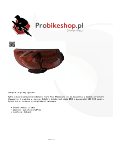 Lampa AXA tył Ray dynamo Tylna lampa rowerowa holenderskiej marki AXA. Mocowana jest do bagażnika, a zasilana dynamem klasycznym i prądnicą w piaście. Źródłem światła jest dioda LED o żywotności 100 000 godzin. Całość jest wykonana z wysokiej jakości tworzywa. Źródło światła: 1 x LED Zasilanie: Dynamo / prądnica Inne/tech.: Odblask Strona 1 z 1