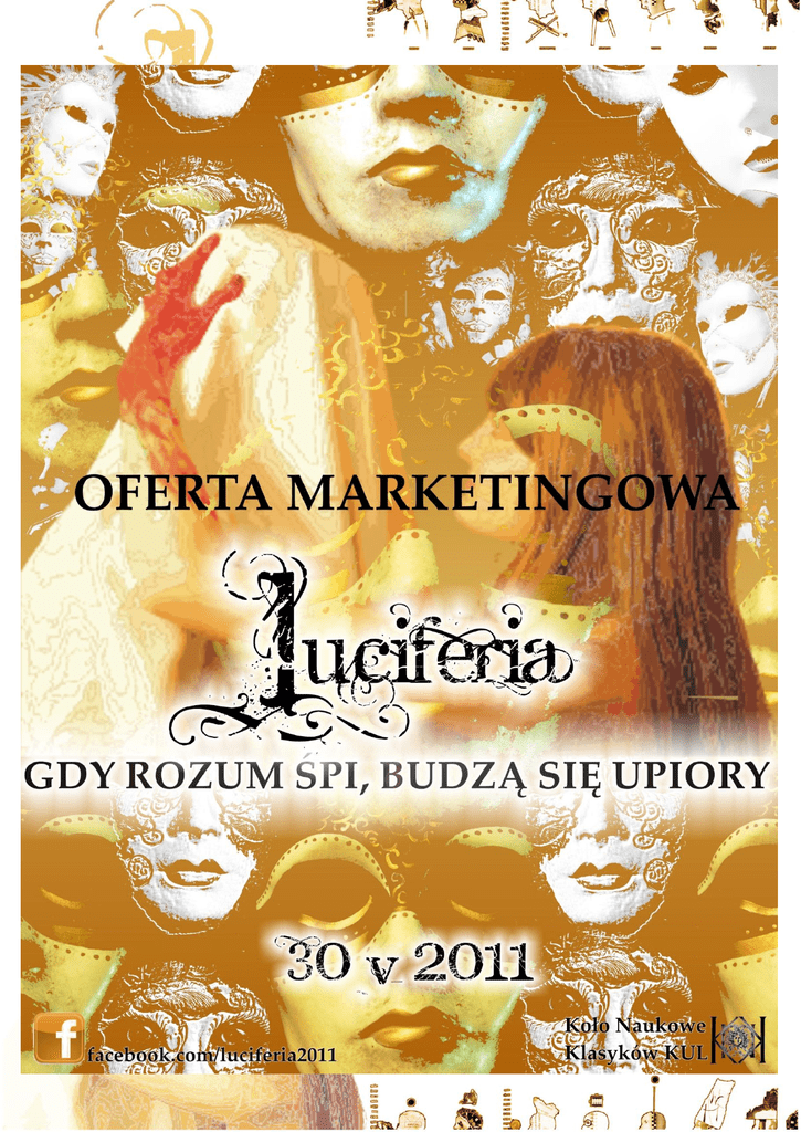 OFERTA MARKETINGOWA LUCIFERIA Szanowni Państwo, Koło Naukowe Klasyków działające przy Instytucie Filologii klasycznej na Katolickim Uniwersytecie Lubelskim Jana Pawła II to jedna z niewielu organizacji studenckich w kraju łącząca w celach swojego istnienia pogłębione studium dorobku kultury starożytnych Grecji i Rzymu, a także wczesnego chrześcijaństwa z ich recepcją w kulturze współczesnej. Filologia klasyczna na KUL jest jednym z tych polskich ośrodków badawczych nad antykiem, który oprócz wieloletniej, sięgającej początków uniwersytetu historii oraz licznego gremium znanych w Polsce profesorów-specjalistów, może poszczycić się również otwartością na wszelkie inicjatywy studenckie przy pełnej współpracy oraz wsparciu kadry naukowo-dydaktycznej. W czasie swojej działalności, Koło Naukowe Klasyków ukazywało szerszej publiczności kulturę, tradycję i historię antyczną nie tylko poprzez organizowanie konferencji i wyjazdów naukowych, ale również poprzez wzmożoną działalność kulturalną. Dowodem tego jest choćby wystawienie w czasie Lubelskich Dni Nauki w roku 2007 modernistycznej reinterpretacji „Orestei” przy współpracy z Mieszkiem Sibilskim z duetu Grupa Operacyjna. W tym roku, w dniu 30 V, planujemy wystawić musical „Luciferia” będący nawiązaniem do niektórych wątków z „Alkestis” Eurypidesa oraz do mitu o Pigmalionie. W związku z tym zwracamy się do Państwa z ofertą współpracy podczas realizacji tego przedsięwzięcia. Siłą przekazu antycznych tragedii był ich uniwersalizm. Obecnie jednak wartości niesione w treści sztuk autorstwa tak znamienitych autorów, jak choćby Sofokles, Eurypides czy Seneka, zdają się ulegać stopniowej dewaluacji na rzecz uproszczonych przez współczesną masową kulturę przekazów i redukcji wartości. „Luciferia” (łac. Niosąca światło) jest odpowiedzią na potrzebę połączenia wysokiej kultury z kulturą popularną. Jest to całkowicie autorskie przedstawienie, które łączy antyczną strukturę tragedii ze współczesną muzyką i uniwersalnym przesłaniem. Serdecznie zachęcamy do wsparcia inicjatywy Koła Naukowego Klasyków. Jesteśmy przekonani, że współpraca zaowocuje wzrostem zainteresowania wobec Państwa produktów i usług wśród studentów, oraz przyczyni się do budowania pozytywnych skojarzeń na długi czas. Nam natomiast umożliwi realizację naszych planów kulturalnych. PODSTAWOWE INFORMACJE Oficjalny profil na facebooku: facebook.com/luciferia2011 Termin: 30 V 2011 r. Miejsce realizacji: Aula im. Stefana Kardynała Wyszyńskiego (Gmach Główny KUL, al. Racławickie 14, Lublin), Grupa docelowa: o mieszkańcy Lublina o studenci o osoby zainteresowane kulturą antyczną oraz muzyką współczesną o osoby zainteresowane współczesnym teatrem Scenariusz i reżyseria: Mateusz Kowalski Muzyka: Mateusz Kowalski, Kolektyw Inicjatyw Kulturalnych METAMATERIA Choreografia: Mateusz Kowalski Kostiumy: Natalia Siebuła Taniec: Uliczna Formacja w składzie: Marcin Kołczyński, Paweł Stachowicz, Przemysław Sztyber Występują: Magdalena Bogusz, Beata Chowaniec, Tomasz Dziedzic, Alicja Kisielewska, Katarzyna Kołakowska, Marcin Kołczyński, Michał Kośla, Mateusz Kowalski, Agnieszka Łatwińska, Mateusz Michor, Małgorzata Pawlik, Barbara Stachowicz, Paweł Stachowicz, Przemysław Sztyber, Natalia Turkiewicz, Barbara Wieczorek Współpraca: Radio Lublin, TVP Lublin, iTVL.pl, Nestlé Waters Polska (Dar Natury), „Traditio Antiquitatis”, czasopismo „Littera Antiqua” Patronat: Europejska Stolica Kultury Lublin 2016, Prezydent Miasta Lublin, TVP Lublin, Radio Lublin, iTVL.pl, Nestlé Waters Polska, „Traditio Antiquitatis”, czasopismo „Littera Antiqua” CZYM JEST LUCIFERIA? „Luciferia” to opowieść o dwóch braciach, służącym oraz kobiecie i bogu, którzy ich poróżnili. Ubrana w formę antycznej tragedii, sztuka ta jest przede wszystkim opowieścią o ścieraniu się różnych rodzajów miłości i ambicji. Dwóch braci – Corvus i Cygnus (łac. Kruk i Łabędź) wyprawia się w podróż, która odmieni na zawsze ich życie: jeden liczy na to, że stworzy kopię Paradotis (gr. Ta, która zdradziła), kobiety, którą kochał, a która go porzuciła; drugi - że znajdzie wreszcie sposób na zdjęcie klątwy ciążącej na nim za zabójstwo ojca. Jednakże Corvus nie wyjawia swojego celu bratu, wiedząc, że ten nie pozwoliłby mu na podróż w celu spełnienia jego zachcianek. Dlatego też wmawia Cygnusowi, że znalazł sposób na zdjęcie jego klątwy. Ich służący, Trymalchion, pod pozorem litości dla Cygnusa, walczy jednak przede wszystkim o zachowanie takiego stanu rzeczy, jaki mu wcześniej odpowiadał - czyli służbie w zimnym, pustym pałacu, rządzonym przez dwóch braci popadających w depresję. Wezwanie Dionizosa, by ten ukarał Corvusa za bluźniercze stworzenie człowieka, doprowadzi jednak do większej tragedii, niż się spodziewał... Świadkiem tych wydarzeń jest chór bezsilnych służących, którzy – jeszcze mniej znaczący niż zaufany Trymalchion – biernie przygląda się rozpadowi rodziny i temu, jak obłęd Corvusa niszczy znany im do tej pory świat. CELE WYDARZENIA: Dotarcie do ludzi zainteresowanych jednym z elementów musicalu (tragedia antyczna, wątek fabularny, gatunki muzyki – rock, metal, opera) i zapewnienie im szerokiego dostępu do ciągłości tradycji antycznej w Polsce i na świecie. Uczestnicy imprezy zyskają dostęp nie tylko do odnowionej formy teatru starożytnej Grecji i Rzymu, ale także do muzyki będącej połączeniem tak gatunków popularnych, jak i uznawanych za niszowe – w tym rocka, metalu, elektroniki, pieśni liturgicznej oraz muzyki świata. Wraz z nowoczesnymi w formie elementami scenografii (minimalizm, elementy multimedialne – prezentacje, projekcje miniatur filmowych; kostiumy autorstwa radomskiej projektantki Natalii Siebuły) widzowie będą świadkam
