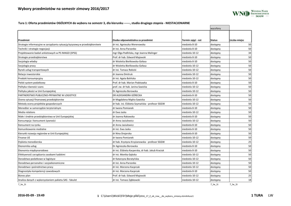 Wybory przedmiotów na semestr zimowy 2016/2017 Tura 1: Oferta przedmiotów OGÓLNYCH do wyboru na semestr 3, dla kierunku ‐‐‐‐‐‐, studia drugiego stopnia ‐ NIESTACJONARNE wycofany Przedmiot Osoba odpowiedzialna za przedmiot Termin zajęć ‐ nst Status Strategie informacyjne w zarządzaniu sytuacją kyzysową w przedsiębiorstwie dr inż. Agnieszka Werenowska niedziela 8‐10 dostępny Liczba miejsc 50 Techniki i strategie negocjacji dr inż. Anna Parzonko niedziela 8‐10 dostępny 50 Projektowanie badań ankietowych w PS IMAGO (SPSS) mgr Olga Podlińska, mgr Joanna Malinger niedziela 10‐12 dostępny 34 Strategie przedsiębiorstwa Prof. dr hab. Edward Majewski niedziela 8‐10 dostępny 50 Socjologia władzy dr Wioletta Bieńkowska‐Gołasa niedziela 8‐10 dostępny 50 Socjologia pracy dr Wioletta Bieńkowska‐Gołasa niedziela 10‐12 dostępny 50 Rynek usług transportowych dr inż. Tomasz Rokicki niedziela 10‐12 dostępny 50 Relacje inwestorskie dr Joanna Dmitruk niedziela 10‐12 dostępny 50 Produkt konsumpcyjny dr inż. Agata Balińska niedziela 10‐12 dostępny 50 Polski system podatkowy Prof. dr hab. Marian Podstawka niedziela 8‐10 dostępny 50 Polityka równości szans prof. zw. dr hab. Janina Sawicka niedziela 10‐12 dostępny 50 Polityka jakości w Unii Europejskiej Dr Agnieszka Borowska niedziela 10‐12 dostępny 50 PARTNERSTWO PUBLICZNO‐PRYWATNE W LOGISTYCE DR ALEKSANDRA GÓRECKA niedziela 8‐10 dostępny 50 Ocena sytuacji finansowej przedsiębiorstw dr Magdalena Mądra‐Sawicka niedziela 10‐12 dostępny 50 Metody oceny projektów gospodarczych dr hab. inż. Elżbieta Szymańska ‐ profesor SGGW niedziela 10‐12 dostępny 50 Menedżer w samorządzie terytorialnym dr Iwona Pomianek niedziela 8‐10 dostępny 50 Media relations dr Ewa Jaska niedziela 10‐12 dostępny 50 Małe i średnie przedsiębiorstwa w Unii Europejskiej dr Joanna Rakowska niedziela 8‐10 dostępny 50 Konsumpcja i konsument żywności dr Anna Jasiulewicz niedziela 10‐12 dostępny 50 Konsument na rynku dr Anna Jasiulewicz niedziela 8‐10 dostępny 50 Komunikowanie medialne dr inż. Ewa Jaska niedziela 8‐10 dostępny 50 Kierunki rozwoju regionów w Unii Europejskiej dr Nina Drejerska niedziela 8‐10 dostępny 50 Finanse UE dr Iwona Pomianek niedziela 10‐12 dostępny 50 Etykieta menedżerska dr hab. Krystyna Krzyżanowska ‐ profesor SGGW niedziela 10‐12 dostępny 25 Ekonomika usług Dr Agnieszka Borowska niedziela 8‐10 dostępny 50 Ekonomia międzynarodowa dr inż. Elżbieta Kacperska, dr hab. Jakub Kraciuk niedziela 8‐10 dostępny 50 Efektywność zarządzania zasobami ludzkimi dr inż. Monika Gębska niedziela 10‐12 dostępny 50 Doradztwo podatkowe w logistyce dr Katarzyna Boratyńska niedziela 10‐12 dostępny 50 Doradztwo personalne i socjoekonomiczne Doradztwo i pośrednictwo pracy dr inż. Anna Parzonko dr inż. Marzena Kacprzak niedziela 10‐12 niedziela 10‐12 dostępny dostępny 50 50 50 Diagnostyka kompetencji zawodowych dr inż. Marzena Kacprzak niedziela 8‐10 dostępny Biznes plan Prof. dr hab. Edward Majewski niedziela 10‐12 dostępny 25 Analiza danych z wykorzystaniem pakietu SAS ‐ fakulet dr inż. Tomasz Ząbkowski niedziela 10‐12 dostępny 18 7_lw_1t 2016‐05‐09 ‐ 19:49 7_lw_1t 1 C:\Users\Wicki\Filr\Moje pliki\2016_17_Z_ok_row__do_wyboru_zmiany.xlsmArkusz1 7_lw_1t 1 TURA LW