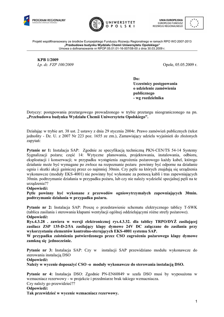 Projekt współfinansowany ze środków Europejskiego Funduszu Rozwoju Regionalnego w ramach RPO WO 2007-2013 „Przebudowa budynku Wydziału Chemii Uniwersytetu Opolskiego” Umowa o dofinansowanie nr RPOP.05.01.01-16-007/08-00 z dnia 30.03.2009 r. KPB 1/2009 Lp. dz. FZP 100/2009 Opole, 05.05.2009 r. Do: Uczestnicy postępowania o udzielenie zamówienia publicznego - wg rozdzielnika Dotyczy: postępowania przetargowego prowadzonego w trybie przetargu nieograniczonego na pn. „Przebudowa budynku Wydziału Chemii Uniwersytetu Opolskiego”. Działając w trybie art. 38 ust. 2 ustawy z dnia 29 stycznia 2004r. Prawo zamówień publicznych (tekst jednolity - Dz. U. z 2007 Nr 223 poz. 1655 ze zm.), Zamawiający udziela wyjaśnień do złożonych zapytań: Pytanie nr 1: Instalacja SAP: Zgodnie ze specyfikacją techniczną PKN-CEN/TS 54-14 Systemy Sygnalizacji pożaru; część 14: Wytyczne planowania, projektowania, instalowania, odbioru, eksploatacji i konserwacji; w przypadku wystąpienia zagrożenia pożarowego każdy kabel, którego działanie może być wymagane po zwłoce na rozpoznanie pożaru powinny być odporne na działanie ognia i skutki akcji gaśniczej przez co najmniej 30min. Czy pętle na których znajdują się urządzenia wykonawcze (moduły EKS-4001) nie powinny być wykonane za pomocą kabli i tras zapewniających 30min. podtrzymanie działania w przypadku pożaru, lub czy nie należy wydzielić specjalnej pętli na te urządzenia?? Odpowiedź: Pętle powinny być wykonane z przewodów ogniowytrzymałych zapewniających 30min. podtrzymanie działania w przypadku pożaru. Pytanie nr 2: Instalacja SAP: Proszę o przedstawienie schematu elektrycznego tablicy T-SWK (tablica zasilania i sterowania klapami wentylacji ogólnej oddzielającymi różne strefy pożarowe). Odpowiedź: Rys.4.3.28 . zawiera w wersji elektronicznej rys.4.3.32. dla tablicy TRPO/DYŻ zasilającej zasilacz ZSP 135-D-2/5A zasilający klapy dymowe 24V DC załączane do zasilania przy wykorzystaniu elementów kontrolno-sterujących EKS-4001 systemu SAP. W przypadku zaistnienia potwierdzonego przez CSO zagrożenia pożarowego klapy dymowe zamkną się jednocześnie. Pytanie nr 3: Instalacja SAP: Czy w instalacji SAP przewidziano modułu wykonawcze do sterowania instalacją DSO Odpowiedź: Należy w wycenie doposażyć CSO -o moduły wykonawcze do sterowania instalacją DSO. Pytanie nr 4: Instalacja DSO: Zgodnie PN-EN60849 w szafa DSO musi by wyposażona w wzmacniacz rezerwowy - w projekcie i przedmiarze brak takiego wzmacniacza. Czy należy go przewidzieć?? Odpowiedź: Tak przewidzieć w wycenie wzmacniacz rezerwowy. 1 Projekt współfinansowany ze środków Europejskiego Funduszu Rozwoju Regionalnego w ramach RPO WO 2007-2013 „Przebudowa budynku Wydziału Chemii Uniwersytetu Opolskiego” Umowa o dofinansowanie nr RPOP.05.01.01-16-007/08-00 z dnia 30.03.2009 r. Pytanie nr 5: Okablowanie Strukturalne: W związku z sprzecznymi informacjami, instalację okablowanie strukturalnego należy wykonać jak rozwiązania systemowe NEXANS czy LANSTER?? Odpowiedź: Zgodnie z Opisem Technicznym dot. okablowania strukturalnego oraz zawartym w pkt. 2.5 „Ogólna struktura okablowania”, ppkt. 2 cyt.„Powinno się dążyć do ujednolicenia osprzętu używanego do wykonywania okablowania strukturalnego – projektuje się rozwiązanie systemowe firmy NEXANS”, zatem ze względu na konieczność ujednolicenia systemów okablowania strukturalnego oraz z uwagi na posiadane już okablowanie strukturalne w pozostałych budynkach UO firmy NEXANS, przedmiotowe okablowanie winno być wykonane również w oparciu o rozwiązania systemowe firmy NEXANS, stosując elementy wyszczególnione w ppkt. 2.6 Cześć nr 2 – zakup i montaż wyposażenia wymagającego montażu wraz z uruchomieniem (dygestoria, przystawki) Pytanie nr 6: Dotyczy pkt. 5.2.1.2 SIWZ. Czy Zamawiający dopuści wykonawców którzy wykonali w okresie ostatnich 5 lat przed dniem wszczęcia postępowania o udzielenie zamówienia, a jeśli okres prowadzenia działalności jest krótszy - w tym okresie minimum 3 zadania odpowiadające swoim rodzajem stanowiącym przedmiot zamówienia o wartości każdego zadania nie mniejszej niż 1 200 000 zł brutto. W zakresie jednego zadania wlicza się dostawę, wykonanie montażu i rozruchu urządzeń technologicznych w laboratorium? Obecny zapis SIWZ powoduje nierówne traktowanie oferentów (w szczególności firm zajmujących się wyposażeniem laboratoriów), gdyż na rynku polskim nie było realizacji o tak dużych wartościach. Odpowiedź: Wykonawcy przystępujący do części nr 2 muszą spełnić, miedzy innymi, warunek z pkt. 5.2.1.2. Warunki udziału w postępowaniu stanowią o równym traktowaniu wykonawców na rynku europejskim zgodnie z ustawą Pzp. Dotyczy B.18.00.00 STWiOR Pytanie nr 7: Czy ze względu na specyfikę pracy dygestoria ceramiczne i przeciwwybuchowe mają być w całości wykonane z blach i kształtowników metalowych z dodatkiem ceramiki i szkła, bez użycia materiałów drewnopochodnych? Odpowiedź: Dygestoria mają spełniać wymagania określone w SIWZ i posiadać wymagane certyfikaty. Nie dopuszcza się elementów i materiałów drewnopochodnych. Pytanie nr 8: Czy konstrukcja dygestorium ma być oparta na nośnych ścianach bocznych, bez stelaża pod blatem ? Odpowiedź: Konstrukcja dygestoriów powinna być stabilna i gwarantować spełnienie postawionych wymagań technologicznych, ergonomicznych i bezpieczeństwa użytkowania dostarczanych i uruchamianych urządzeń. Pytanie nr 9: Czy konstrukcja dygestorium ma zapewniać dostęp do wszystkich elementów instalacyjnych obiektu (przyłączeń mediów), bez konieczności demontażu jakichkolwiek innych elementów dygestorium czy też sąsiednich elementów umeblowania a także bez konieczności przemieszczania dygestorium? 2 Projekt współfinansowany ze środków Europejskiego Funduszu Rozwoju Regionalnego w ramach RPO WO 2007-2013 „Przebudow