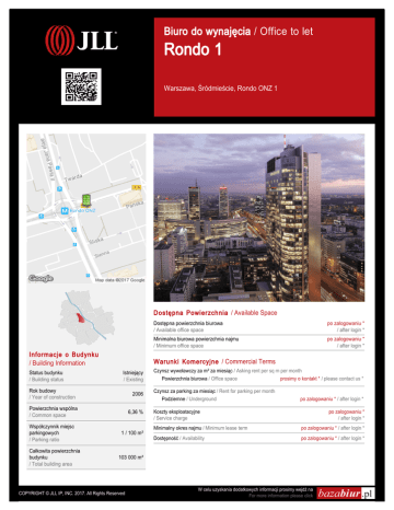 Biuro do wynajęcia / Office to let Rondo 1 Warszawa, Śródmieście, Rondo ONZ 1 Dostępna Powierzchnia / Available Space Informacje o Budynku / Building Information Status budynku / Building status Istniejący / Existing 2006 Powierzchnia wspólna / Common space Całkowita powierzchnia budynku / Total building area po zalogowaniu * / after login * Minimalna biurowa powierzchnia najmu / Minimum office space po zalogowaniu * / after login * Warunki Komercyjne / Commercial Terms Rok budowy / Year of construction Współczynnik miejsc parkingowych / Parking ratio Dostępna powierzchnia biurowa / Available office space 6,36 % 1 / 100 m² Czynsz wywoławczy za m² za miesiąc / Asking rent per sq m per month Powierzchnia biurowa / Office space prosimy o kontakt * / please contact us * Czynsz za parking za miesiąc / Rent for parking per month Podziemne / Underground po zalogowaniu * / after login * Koszty eksploatacyjne / Service charge po zalogowaniu * / after login * Minimalny okres najmu / Minimum lease term po zalogowaniu * / after login * Dostępność / Availability po zalogowaniu * / after login * 103 000 m² COPYRIGHT © JLL IP, INC. 2017. All Rights Reserved W celu uzyskania dodatkowych informacji prosimy wejdź na For more information please click Dostępna Powierzchnia / Available Space Wieża B Piętro / Floor Powierzchnia wolna / Vacant space Dostępność / Availability 0* prosimy o kontakt * / please contact us * prosimy o kontakt * / please contact us * 1 prosimy o kontakt * / please contact us * prosimy o kontakt * / please contact us * 2 prosimy o kontakt * / please contact us * prosimy o kontakt * / please contact us * 5 prosimy o kontakt * / please contact us * prosimy o kontakt * / please contact us * 7 prosimy o kontakt * / please contact us * prosimy o kontakt * / please contact us * 9 prosimy o kontakt * / please contact us * prosimy o kontakt * / please contact us * 9 prosimy o kontakt * / please contact us * prosimy o kontakt * / please contact us * 11 prosimy o kontakt * / please contact us * prosimy o kontakt * / please contact us * 13 prosimy o kontakt * / please contact us * prosimy o kontakt * / please contact us * 13 prosimy o kontakt * / please contact us * prosimy o kontakt * / please contact us * 20 prosimy o kontakt * / please contact us * prosimy o kontakt * / please contact us * Razem / Total po zalogowaniu * / after login * Budynek Mały A Piętro / Floor 8-9 Powierzchnia wolna / Vacant space Dostępność / Availability prosimy o kontakt * / please contact us * prosimy o kontakt * / please contact us * Razem / Total po zalogowaniu * / after login * (*) Powierzchnia handlowa / Retail space Standardowe Wykończenie / Standard Fit-Out Typowy Plan Piętra / Typical Floor Plan Klimatyzacja / Air conditioning Podnoszone podłogi / Raised floor Podwieszany sufit / Suspended ceiling Okablowanie telefoniczne / Telephone cabling Okablowanie komputerowe / Computer cabling Okablowanie elektryczne / Power cabling Tryskacze / Sprinklers Czujniki dymu / Smoke detectors Wykładzina / Carpeting Podział powierzchni ściankami / Wall partitioning Recepcja / Reception Ochrona budynku / Security Kable światłowodowe / Fiber optics Kontrola dostępu do budynku / Access control Uchylne okna / Openable windows BMS / BMS W celu uzyskania dodatkowych informacji lub zorganizowania spotkania prosimy o kontakt: / For more information or to arrange a viewing please contact: +48 22 167 00 00 Niniejsze warunki mają charakter wyłącznie informacyjny i nie stanowią części wiążącej oferty lub umowy. / The Property Particulars are for information purposes only and do not form any part of binding offer or contract. COPYRIGHT © JLL IP, INC. 2017. All Rights Reserved W celu uzyskania dodatkowych informacji prosimy wejdź na For more information please click