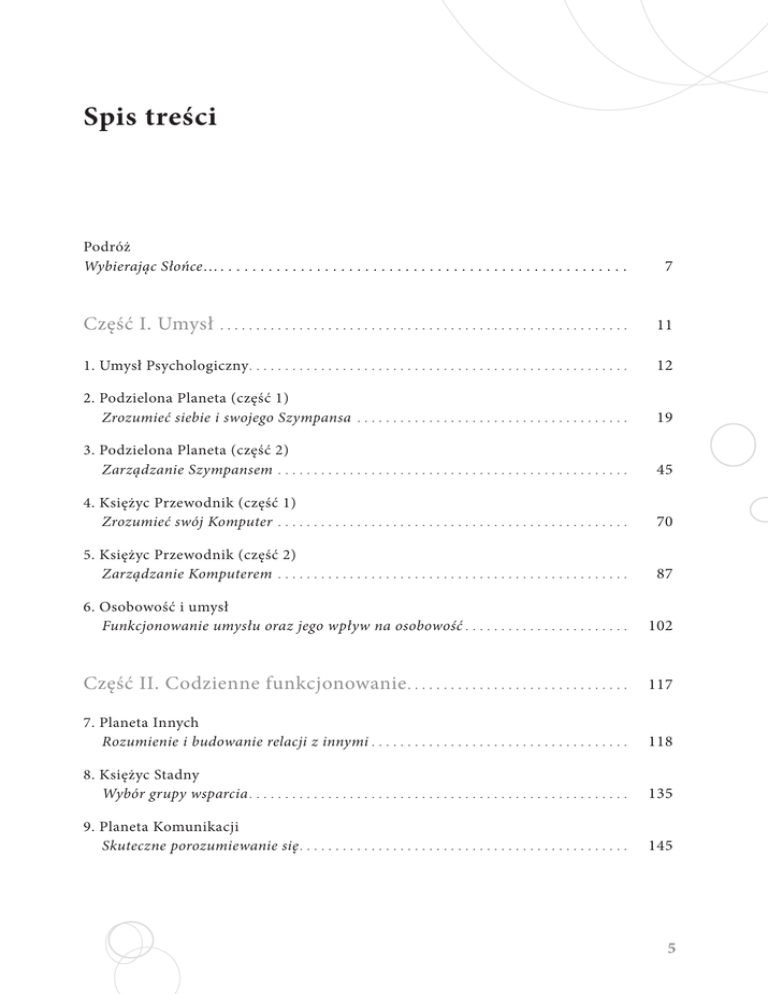 Spis treści Podróż Wybierając Słońce… . . . . . . . . . . . . . . . . . . . . . . . . . . . . . . . . . . . . . . . . . . . . . . . . . . . Część I. Umysł 7 ......................................................... 11 1. Umysł Psychologiczny . . . . . . . . . . . . . . . . . . . . . . . . . . . . . . . . . . . . . . . . . . . . . . . . . . . . . 12 2. Podzielona Planeta (część 1) Zrozumieć siebie i swojego Szympansa . . . . . . . . . . . . . . . . . . . . . . . . . . . . . . . . . . . . . . 19 3. Podzielona Planeta (część 2) Zarządzanie Szympansem . . . . . . . . . . . . . . . . . . . . . . . . . . . . . . . . . . . . . . . . . . . . . . . . . 45 4. Księżyc Przewodnik (część 1) Zrozumieć swój Komputer . . . . . . . . . . . . . . . . . . . . . . . . . . . . . . . . . . . . . . . . . . . . . . . . . 70 5. Księżyc Przewodnik (część 2) Zarządzanie Komputerem . . . . . . . . . . . . . . . . . . . . . . . . . . . . . . . . . . . . . . . . . . . . . . . . . 87 6. Osobowość i umysł Funkcjonowanie umysłu oraz jego wpływ na osobowość . . . . . . . . . . . . . . . . . . . . . . . 102 Część II. Codzienne funkcjonowanie . . . . . . . . . . . . . . . . . . . . . . . . . . . . . . . 117 7. Planeta Innych Rozumienie i budowanie relacji z innymi . . . . . . . . . . . . . . . . . . . . . . . . . . . . . . . . . . . . 118 8. Księżyc Stadny Wybór grupy wsparcia . . . . . . . . . . . . . . . . . . . . . . . . . . . . . . . . . . . . . . . . . . . . . . . . . . . . . 135 9. Planeta Komunikacji Skuteczne porozumiewanie się . . . . . . . . . . . . . . . . . . . . . . . . . . . . . . . . . . . . . . . . . . . . . . 145 5 10. Planeta Prawdziwego Świata Życie w zgodzie z otoczeniem . . . . . . . . . . . . . . . . . . . . . . . . . . . . . . . . . . . . . . . . . . . . . . 170 11. Księżyc Doraźnego Stresu Radzenie sobie ze stresem krótkotrwałym . . . . . . . . . . . . . . . . . . . . . . . . . . . . . . . . . . . 177 12. Księżyc Chronicznego Stresu Radzenie sobie ze stresem przewlekłym . . . . . . . . . . . . . . . . . . . . . . . . . . . . . . . . . . . . . 193 Część III. Zdrowie, sukces i szczęście . . . . . . . . . . . . . . . . . . . . . . . . . . . . . . 205 13. Planeta Cieni i Pas Asteroid Dbanie o zdrowie . . . . . . . . . . . . . . . . . . . . . . . . . . . . . . . . . . . . . . . . . . . . . . . . . . . . . . . . 206 14. Planeta Sukcesu i jej Trzy Księżyce Podstawy sukcesu . . . . . . . . . . . . . . . . . . . . . . . . . . . . . . . . . . . . . . . . . . . . . . . . . . . . . . . . 214 15. Planeta Sukcesu Planowanie sukcesu . . . . . . . . . . . . . . . . . . . . . . . . . . . . . . . . . . . . . . . . . . . . . . . . . . . . . . 241 16. Planeta Szczęścia Praca nad poczuciem szczęścia . . . . . . . . . . . . . . . . . . . . . . . . . . . . . . . . . . . . . . . . . . . . 265 17. Księżyc Pewności Siebie Budowanie poczucia pewności siebie . . . . . . . . . . . . . . . . . . . . . . . . . . . . . . . . . . . . . . . 287 18. Księżyc Bezpieczeństwa Budowanie poczucia bezpieczeństwa . . . . . . . . . . . . . . . . . . . . . . . . . . . . . . . . . . . . . . . 294 Oczekiwanie Wschód słońca . . . . . . . . . . . . . . . . . . . . . . . . . . . . . . . . . . . . . . . . . . . . . . . . . . . . . . . . . . . . . . 301 Dodatek A Umysł Psychologiczny . . . . . . . . . . . . . . . . . . . . . . . . . . . . . . . . . . . . . . . . . . . . . . . . . . . . . . . . 302 Dodatek B Kompletny obraz Psychologicznego Wszechświata . . . . . . . . . . . . . . . . . . . . . . . . . . . . . . . 303 Podziękowania . . . . . . . . . . . . . . . . . . . . . . . . . . . . . . . . . . . . . . . . . . . . . . . . . . . . . . . 304 6 www.samosedno.com.pl