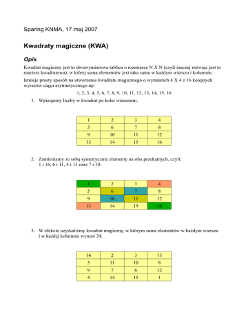 Sparing KNMA, 17 maj 2007 Kwadraty magiczne (KWA) Opis Kwadrat magiczny jest to dwuwymiarowa tablica o rozmiarze N X N (czyli inaczej mówiąc jest to macierz kwadratowa), w której suma elementów jest taka sama w każdym wierszu i kolumnie. Istnieje prosty sposób na utworzenie kwadratu magicznego o wymiarach 4 X 4 z 16 kolejnych wyrazów ciągu arytmetycznego np: 1, 2, 3, 4, 5, 6, 7, 8, 9, 10, 11, 12, 13, 14, 15, 16 1. Wpisujemy liczby w kwadrat po kolei wierszami. 1 2 3 4 5 6 7 8 9 10 11 12 13 14 15 16 2. Zamieniamy ze sobą symetrycznie elementy na obu przekątnych, czyli: 1 i 16, 6 i 11, 4 i 13 oraz 7 i 10. 1 2 3 4 5 6 7 8 9 10 11 12 13 14 15 16 3. W efekcie uzyskaliśmy kwadrat magiczny, w którym suma elementów w każdym wierszu i w każdej kolumnie wynosi 34. 16 2 3 13 5 11 10 8 9 7 6 12 4 14 15 1 Sparing KNMA, 17 maj 2007 Zadanie Napisz program, który: 1. Utworzy i wyświetli przy użyciu przytoczonej metody kwadrat magiczny, o rozmiarze 4 X 4, zbudowany z elementów ciągu arytmetycznego, dla którego wczytamy z klawiatury: ○ Pierwszy element ciągu A. ○ Różnicę ciągu R. 2. Poda sumę elementów w każdym wierszu i w każdej kolumnie. Wejście W pierwszej i jedynej linii wejścia znajdują się dwie liczby całkowite oddzielone pojedynczą spacją A, R, 0 ≤ A ≤ 20, 0 ≤ R ≤ 10, oznaczające odpowiednio wartość pierwszego elementu ciągu arytmetycznego oraz różnicę tego ciągu. Wyjście W pierwszych czterech liniach wyjścia wyświetlamy utworzony przez nas magiczny kwadrat. W każdej z linii znajdują się dokładnie cztery liczby całkowite reprezentujące elementy danego wiersza naszego kwadratu magicznego. Liczby są oddzielone od siebie pojedynczą spacją. W piątej linii należy wypisać jedną liczbę całkowitą będącą sumą elementów w każdym wierszu i w każdej kolumnie. Przykład Wejście: 42 Wyjście: 34 6 8 28 12 24 22 18 20 16 14 26 10 30 32 4 76