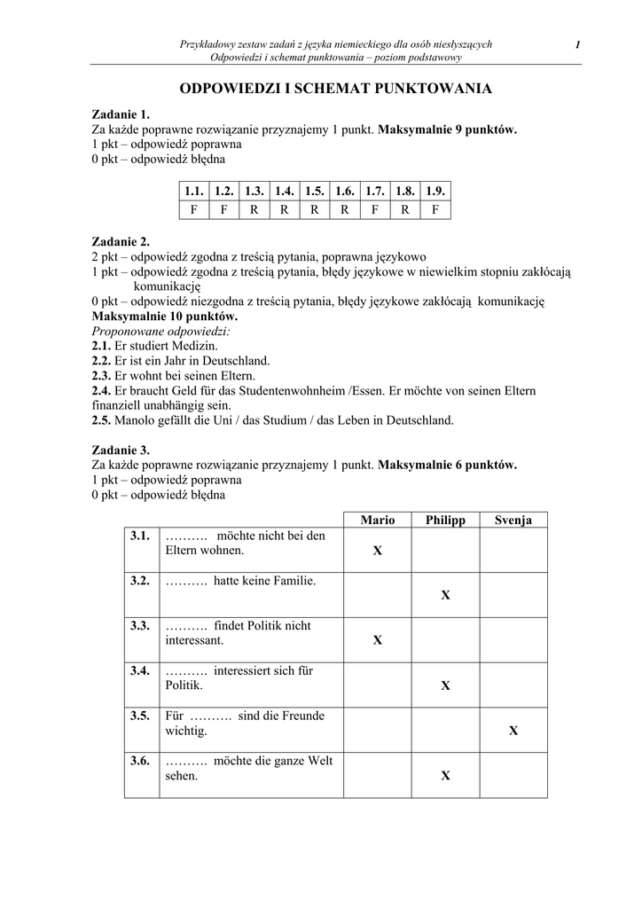 Przykładowy zestaw zadań z języka niemieckiego dla osób niesłyszących Odpowiedzi i schemat punktowania – poziom podstawowy 1 ODPOWIEDZI I SCHEMAT PUNKTOWANIA Zadanie 1. Za każde poprawne rozwiązanie przyznajemy 1 punkt. Maksymalnie 9 punktów. 1 pkt – odpowiedź poprawna 0 pkt – odpowiedź błędna 1.1. 1.2. 1.3. 1.4. 1.5. 1.6. 1.7. 1.8. 1.9. F F R R R R F R F Zadanie 2. 2 pkt – odpowiedź zgodna z treścią pytania, poprawna językowo 1 pkt – odpowiedź zgodna z treścią pytania, błędy językowe w niewielkim stopniu zakłócają komunikację 0 pkt – odpowiedź niezgodna z treścią pytania, błędy językowe zakłócają komunikację Maksymalnie 10 punktów. Proponowane odpowiedzi: 2.1. Er studiert Medizin. 2.2. Er ist ein Jahr in Deutschland. 2.3. Er wohnt bei seinen Eltern. 2.4. Er braucht Geld für das Studentenwohnheim /Essen. Er möchte von seinen Eltern finanziell unabhängig sein. 2.5. Manolo gefällt die Uni / das Studium / das Leben in Deutschland. Zadanie 3. Za każde poprawne rozwiązanie przyznajemy 1 punkt. Maksymalnie 6 punktów. 1 pkt – odpowiedź poprawna 0 pkt – odpowiedź błędna Mario 3.1. 3.2. ………. möchte nicht bei den Eltern wohnen. Philipp Svenja X ………. hatte keine Familie. X 3.3. 3.4. 3.5. 3.6. ………. findet Politik nicht interessant. ………. interessiert sich für Politik. X X Für ………. sind die Freunde wichtig. ………. möchte die ganze Welt sehen. X X Przykładowy zestaw zadań z języka niemieckiego dla osób niesłyszących Odpowiedzi i schemat punktowania – poziom podstawowy 2 Zadanie 4. 2 pkt – odpowiedź zgodna z treścią pytania, poprawna językowo 1 pkt – odpowiedź zgodna z treścią pytania, błędy językowe w niewielkim stopniu zakłócają komunikację 0 pkt – odpowiedź niezgodna z treścią pytania, błędy językowe zakłócają komunikację Maksymalnie 8 punktów. Proponowane odpowiedzi: 4.1. Ich sehe einen See, einen Strand, Leute, einen Ball…. 4.2. Sie spielen Ball/ Volleyball. / Sie machen Urlaub. 4.3. Die Menschen sind am Strand/ am See. 4.4. Das Wetter ist schön. / Es ist schön. / Die Sonne scheint. / Es ist warm. Zadanie 5. Za każde poprawne rozwiązanie przyznajemy 1 punkt. Maksymalnie 6 punktów. 1 pkt – odpowiedź poprawna 0 pkt – odpowiedź błędna Zdanie w języku niemieckim 5.1. 5.2. 5.3. 5.4. 5.5. 5.6. D A F B C E Zadanie 6. Za każde poprawne rozwiązanie przyznajemy 1 punkt. Maksymalnie 5 punktów. 1 pkt – odpowiedź poprawna 0 pkt – odpowiedź błędna 6.1 6.2 6.3. 6.4. 6.5. B. A. E. C. D. Zadanie 7. Za każde poprawne rozwiązanie przyznajemy 1 punkt. Maksymalnie 6 punktów. 1 pkt – odpowiedź poprawna 0 pkt – odpowiedź błędna 7.1. - B. 7.2. - A. 7.3. - A. 7.4. - B. 7.5. - A. 7.6. - A. Zadanie 8. Za każde poprawne rozwiązanie przyznajemy 1 punkt. Maksymalnie 4 punkty. 1 pkt – odpowiedź poprawna 0 pkt – odpowiedź błędna 8.1. – einen Test 8.2. – Fragen 8.3. – Bücher 8.4. – ein Auto Przykładowy zestaw zadań z języka niemieckiego dla osób niesłyszących Odpowiedzi i schemat punktowania – poziom podstawowy 3 Zadanie 9. Za każde poprawne rozwiązanie przyznajemy 1 punkt. Maksymalnie 6 punktów. 1 pkt – odpowiedź poprawna 0 pkt – odpowiedź błędna 9.1. möchte 9.2. mit wem 9.3. woher 9.4. wie 9.5. mag 9.6. musst Zadanie 10. Za każde poprawne rozwiązanie przyznajemy 1 punkt. Maksymalnie 4 punkty. 1 pkt – odpowiedź poprawna 0 pkt – odpowiedź błędna 10.1. – fährt 10.2. – kaufen 10.3. – liest 10.4. – helfe Zadanie 11. Za każde poprawne rozwiązanie przyznajemy 1 punkt. Maksymalnie 6 punktów. 1 pkt – odpowiedź poprawna 0 pkt – odpowiedź błędna Początek zdania 11.1. 11.2. 11.3. 11.4. 11.5. 11.6. Dokończenie zdania C D F A B E Zadanie 12. TREŚĆ: 5 – 4 pkt – zdający wykorzystuje wszystkie podane informacje, tworzy logiczną całość wypowiedzi, zgodną z poleceniem i przetwarzanym materiałem (stymulującym, pomocniczym) 3 – 2 pkt - zdający wykorzystuje przynajmniej połowę podanych informacji, tworzy tekst częściowo logiczny, częściowo zgodny z poleceniem i przetwarzanym materiałem 1 – 0 pkt - zdający wykorzystuje mniej niż połowę podanych informacji, wypowiedź jest nie w pełni logiczna, niezgodna z poleceniem, znacznie odbiega od treści przetwarzanego materiału BOGACTWO JĘZYKOWE: 2 pkt – urozmaicone słownictwo, zróżnicowane struktury gramatyczne 1 pkt – mało urozmaicone słownictwo, niewielkie zróżnicowanie struktur gramatycznych 0 pkt – bardzo ubogie słownictwo, brak zróżnicowania struktur gramatycznych POPRAWNOŚĆ JĘZYKOWA: 3 pkt – sporadyczne błędy językowe nie zakłócające komunikacji 2 pkt – nieliczne błędy językowe w niewielkim stopniu zakłócające komunikację 1 pkt – dość liczne błędy językowe w znacznym stopniu zakłócające komunikację 0 pkt – liczne błędy językowe uniemożliwiające komunikację 4 Przykładowy zestaw zadań z języka niemieckiego dla osób niesłyszących Odpowiedzi i schemat punktowania – poziom podstawowy Maksymalnie 10 punktów. Zadanie 13. TREŚĆ: Za każdą z pięciu informacji można uzyskać 2 punkty (maksymalnie 10 punktów) 2 pkt – pełna informacja (zawiera wszystkie wymagane elementy) 1 pkt – częściowa informacja (zawiera część wymaganych elementów) 0 pkt – brak informacji FORMA: 3 pkt – wypowiedź zgodna z wymaganą formą, tekst spójny i logiczny 2 pkt – wypowiedź częściowo zgodna z wymaganą formą, tekst częściowo spójny i logiczny 1 pkt – wypowiedź w niewielkim stopniu zgodna z wymaganą formą, tekst w niewielkim stopniu spójny i logiczny 0 pkt – wypowiedź niezgodna z wymaganą formą, tekst niespójny, chaotyczny BOGACTWO JĘZYKOWE: 4 - 3 pkt – bogate słownictwo, duże zróżnicowane struktury gramatyczne (na poziomie podstawowym) 2 - 1 pkt – mało urozmaicone słownictwo, niewielkie zróżnicowanie struktur gramatycznych 0 pkt – bardzo