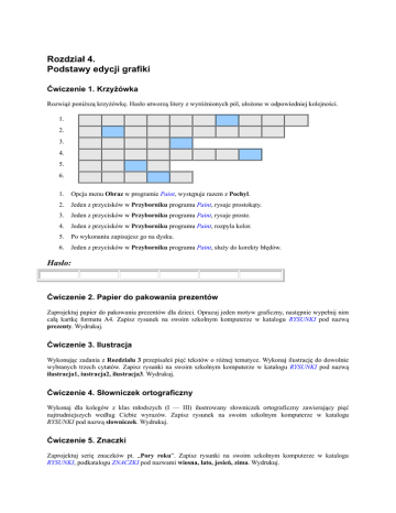 Rozdział 4. Podstawy edycji grafiki Ćwiczenie 1. Krzyżówka Rozwiąż poniższą krzyżówkę. Hasło utworzą litery z wyróżnionych pól, ułożone w odpowiedniej kolejności. 1. 2. 3. 4. 5. 6. 1. Opcja menu Obraz w programie Paint, występuje razem z Pochyl. 2. Jeden z przycisków w Przyborniku programu Paint, rysuje prostokąty. 3. Jeden z przycisków w Przyborniku programu Paint, rysuje proste. 4. Jeden z przycisków w Przyborniku programu Paint, rozpyla kolor. 5. Po wykonaniu zapisujesz go na dysku. 6. Jeden z przycisków w Przyborniku programu Paint, służy do korekty błędów. Hasło: Ćwiczenie 2. Papier do pakowania prezentów Zaprojektuj papier do pakowania prezentów dla dzieci. Opracuj jeden motyw graficzny, następnie wypełnij nim całą kartkę formatu A4. Zapisz rysunek na swoim szkolnym komputerze w katalogu RYSUNKI pod nazwą prezenty. Wydrukuj. Ćwiczenie 3. Ilustracja Wykonując zadania z Rozdziału 3 przepisałeś pięć tekstów o różnej tematyce. Wykonaj ilustrację do dowolnie wybranych trzech cytatów. Zapisz rysunki na swoim szkolnym komputerze w katalogu RYSUNKI pod nazwą ilustracja1, iustracja2, ilustracja3. Wydrukuj. Ćwiczenie 4. Słowniczek ortograficzny Wykonaj dla kolegów z klas młodszych (I — III) ilustrowany słowniczek ortograficzny zawierający pięć najtrudniejszych według Ciebie wyrazów. Zapisz rysunek na swoim szkolnym komputerze w katalogu RYSUNKI pod nazwą słowniczek. Wydrukuj. Ćwiczenie 5. Znaczki Zaprojektuj serię znaczków pt. „Pory roku”. Zapisz rysunki na swoim szkolnym komputerze w katalogu RYSUNKI, podkatalogu ZNACZKI pod nazwami wiosna, lato, jesień, zima. Wydrukuj. Ćwiczenie 6. Kreskówka Zaprojektuj krótka historyjkę obrazkową, która powinna mieć postać komiksu dla dzieci. Temat dowolny. Ustal atrybuty rysunku tak, aby sześć scenek zmieściło się na jednej kartce formatu A4. Zapisz rysunek na swoim szkolnym komputerze w katalogu RYSUNKI pod nazwą komiks. Wydrukuj. Ćwiczenie 7. Portret Wykonaj portret ulubionego bohatera z książki lub filmu, np.„Opowieści z Narnii”, „Seria niefortunnych zdarzeń” lub dowolny inny. Zapisz rysunek na swoim szkolnym komputerze w katalogu RYSUNKI pod nazwą portret. Wydrukuj. Ćwiczenie 8. Plac zabaw Narysuj wymarzony plac zabaw dla dzieci - domek na drzewie - ulubione miejsce zabaw wszystkich dzieci, zaprojektuj własne urządzenia. Zapisz rysunek na swoim szkolnym komputerze w katalogu RYSUNKI pod nazwą plac zabaw. Wydrukuj. Ćwiczenie 8. Tęcza Narysuj tęczę nad miastem. Zapisz rysunek na swoim szkolnym komputerze w katalogu RYSUNKI pod nazwą tęcza. Wydrukuj.
