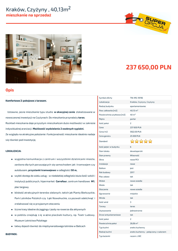 Kraków, Czyżyny , 40,13m2 mieszkanie na sprzedaż 237 650,00 PLN Opis Komfortowe 2-pokojowe z tarasem. Ustawne, jasne mieszkanie typu studio w okazyjnej cenie zlokalizowane w nowoczesnej inwestycji na Czyżynach. Do mieszkania przynależy taras. Rozkład mieszkania daje przyszłym mieszkańcom duże możliwości w zakresie indywidualnej aranżacji. Możliwość wydzielenia 2 osobnych sypialni. Ze względu na atrakcyjne położenie i funkcjonalność mieszkanie idealnie nadaje się również pod inwestycję. LOKALIZACJA: Symbol oferty TNI-MS-18196 Lokalizacja Kraków, Czyżyny, Czyżyny Rodzaj budynku apartamentowiec Pow. całkowita [m2] 40,13 m² Powierzchnia użytkowa [m2] 40 m² Piętro parter Ilość pokoi 2 Cena 237 650 PLN Cena/m2 5922.00 PLN Cena garażu 25 000 PLN Standard Ilość pięter w budynku 6 Stan lokalu deweloperski Stan prawny Własność wygodna komunikacja z centrum i wszystkimi dzielnicami miasta, Okna nowe PCV zarówno dla tych poruszających się samochodem jak i tramwajem czy Instalacje nowe Balkon jest autobusem, przystanki tramwajowe w odległości 50 m, Rok budowy 2017 szybki dostęp do wielu usług - w niedalekiej odległości duża ilość szkół i Plac zabaw tak instytucji publicznych, hipermarket Carrefour, centrum handlowe M1, Widok nowe osiedle Woda tak Otoczenie nowe osiedle bliskość atrakcyjnych terenów zielonych, takich jak Planty Bieńczyckie, Ogrzewanie miejskie Park Lotników Polskich czy Łąki Nowohuckie, co pozwoli odetchnąć i Winda tak Ilość wind 3 Tarasy taras Usytuowanie jednostronne Drzwi antywłamaniowe tak Ilość pokoi 2 Powierzchnia pokoi 26,06 m² Typ kuchni aneks kuchenny Rodzaj kuchni aneks kuchenny - połączony z salonem Typ łazienki razem z WC plac targowy zrelaksować się w przyjaznym otoczeniu liczne trasy idealne do joggingu i jazdy na rowerze dla aktywnych w pobliżu znajdują s ię w ażne placówki kultury, np. Teatr Ludowy, Muzeum Lotnictwa Polskiego łatwy dojazd również do międzynarodowego lotniska w Balicach BUDYNEK: Ilość łazienek 1 Powierzchnia łazienki [m2] 3,75 m² możliwość dowolnej aranżacji wnętrz jak również łączenia mieszkań, Ilość przedpokoi 1 podziemny garaż, oferujący miejsca postojowe w bardzo atrakcyjnej Powierzchnia przedpokoi 3,57 m² nowoczesna architektonicznie forma, cenie, ogrodzony teren, który zapewni ciszę, spokój i poczucie bezpieczeństwa, najwyższy standard wykończenia SUPEROPCJA Sp. z o.o. Morawskiego 5, 30-102 Kraków 12 423 22 50 500 061 557 Joanna Bogacz