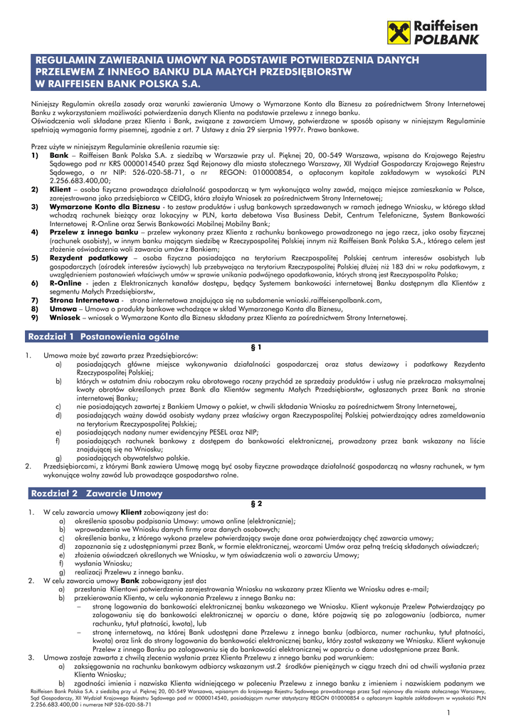 REGULAMIN ZAWIERANIA UMOWY NA PODSTAWIE POTWIERDZENIA DANYCH PRZELEWEM Z INNEGO BANKU DLA MAŁYCH PRZEDSIĘBIORSTW W RAIFFEISEN BANK POLSKA S.A. Niniejszy Regulamin określa zasady oraz warunki zawierania Umowy o Wymarzone Konto dla Biznesu za pośrednictwem Strony Internetowej Banku z wykorzystaniem możliwości potwierdzenia danych Klienta na podstawie przelewu z innego banku. Oświadczenia woli składane przez Klienta i Bank, związane z zawarciem Umowy, potwierdzone w sposób opisany w niniejszym Regulaminie spełniają wymagania formy pisemnej, zgodnie z art. 7 Ustawy z dnia 29 sierpnia 1997r. Prawo bankowe. Przez użyte w niniejszym Regulaminie określenia rozumie się: 1) Bank – Raiffeisen Bank Polska S.A. z siedzibą w Warszawie przy ul. Pięknej 20, 00-549 Warszawa, wpisana do Krajowego Rejestru Sądowego pod nr KRS 0000014540 przez Sąd Rejonowy dla miasta stołecznego Warszawy, XII Wydział Gospodarczy Krajowego Rejestru Sądowego, o nr NIP: 526-020-58-71, o nr REGON: 010000854, o opłaconym kapitale zakładowym w wysokości PLN 2.256.683.400,00; 2) Klient – osoba fizyczna prowadząca działalność gospodarczą w tym wykonująca wolny zawód, mająca miejsce zamieszkania w Polsce, zarejestrowana jako przedsiębiorca w CEIDG, która złożyła Wniosek za pośrednictwem Strony Internetowej; 3) Wymarzone Konto dla Biznesu - to zestaw produktów i usług bankowych sprzedawanych w ramach jednego Wniosku, w którego skład wchodzą rachunek bieżący oraz lokacyjny w PLN, karta debetowa Visa Business Debit, Centrum Telefoniczne, System Bankowości Internetowej R-Online oraz Serwis Bankowości Mobilnej Mobilny Bank; 4) Przelew z innego banku – przelew wykonany przez Klienta z rachunku bankowego prowadzonego na jego rzecz, jako osoby fizycznej (rachunek osobisty), w innym banku mającym siedzibę w Rzeczypospolitej Polskiej innym niż Raiffeisen Bank Polska S.A., którego celem jest złożenie oświadczenia woli zawarcia umów z Bankiem; 5) Rezydent podatkowy – osoba fizyczna posiadająca na terytorium Rzeczpospolitej Polskiej centrum interesów osobistych lub gospodarczych (ośrodek interesów życiowych) lub przebywająca na terytorium Rzeczypospolitej Polskiej dłużej niż 183 dni w roku podatkowym, z 6) 7) 8) 9) uwzględnieniem postanowień właściwych umów w sprawie unikania podwójnego opodatkowania, których stroną jest Rzeczypospolita Polska; R-Online - jeden z Elektronicznych kanałów dostępu, będący Systemem bankowości internetowej Banku dostępnym dla Klientów z segmentu Małych Przedsiębiorstw, Strona Internetowa - strona internetowa znajdująca się na subdomenie wnioski.raiffeisenpolbank.com, Umowa – Umowa o produkty bankowe wchodzące w skład Wymarzonego Konta dla Biznesu, Wniosek – wniosek o Wymarzone Konto dla Biznesu składany przez Klienta za pośrednictwem Strony Internetowej. Rozdział 1 Postanowienia ogólne 1. 2. §1 Umowa może być zawarta przez Przedsiębiorców: a) posiadających główne miejsce wykonywania działalności gospodarczej oraz status dewizowy i podatkowy Rezydenta Rzeczypospolitej Polskiej; b) których w ostatnim dniu roboczym roku obrotowego roczny przychód ze sprzedaży produktów i usług nie przekracza maksymalnej kwoty obrotów określonych przez Bank dla Klientów segmentu Małych Przedsiębiorstw, ogłaszanych przez Bank na stronie internetowej Banku; c) nie posiadających zawartej z Bankiem Umowy o pakiet, w chwili składania Wniosku za pośrednictwem Strony Internetowej, d) posiadających ważny dowód osobisty wydany przez właściwy organ Rzeczypospolitej Polskiej potwierdzający adres zameldowania na terytorium Rzeczypospolitej Polskiej; e) posiadających nadany numer ewidencyjny PESEL oraz NIP; f) posiadających rachunek bankowy z dostępem do bankowości elektronicznej, prowadzony przez bank wskazany na liście znajdującej się na Wniosku; g) posiadających obywatelstwo polskie. Przedsiębiorcami, z którymi Bank zawiera Umowę mogą być osoby fizyczne prowadzące działalność gospodarczą na własny rachunek, w tym wykonujące wolny zawód lub prowadzące gospodarstwo rolne. Rozdział 2 Zawarcie Umowy 1. 2. 3. §2 W celu zawarcia umowy Klient zobowiązany jest do: a) określenia sposobu podpisania Umowy: umowa online (elektronicznie); b) wprowadzenia we Wniosku danych firmy oraz danych osobowych; c) określenia banku, z którego wykona przelew potwierdzający swoje dane oraz potwierdzający chęć zawarcia umowy; d) zapoznania się z udostępnianymi przez Bank, w formie elektronicznej, wzorcami Umów oraz pełną treścią składanych oświadczeń; e) złożenia oświadczeń określonych we Wniosku, w tym oświadczenia woli o zawarciu Umowy; f) wysłania Wniosku; g) realizacji Przelewu z innego banku. W celu zawarcia umowy Bank zobowiązany jest do: a) przesłania Klientowi potwierdzenia zarejestrowania Wniosku na wskazany przez Klienta we Wniosku adres e-mail; b) przekierowania Klienta, w celu wykonania Przelewu z innego Banku na: stronę logowania do bankowości elektronicznej banku wskazanego we Wniosku. Klient wykonuje Przelew Potwierdzający po zalogowaniu się do bankowości elektronicznej w oparciu o dane, które pojawią się po zalogowaniu (odbiorca, numer rachunku, tytuł płatności, kwota), lub stronę internetową, na której Bank udostępni dane Przelewu z innego banku (odbiorca, numer rachunku, tytuł płatności, kwota) oraz link do strony logowania do bankowości elektronicznej banku, który został wskazany we Wniosku. Klient wykonuje Przelew z innego Banku po zalogowaniu się do bankowości elektronicznej w oparciu o dane udostępnione przez Bank. Umowa zostaje zawarta z chwilą zlecenia wysłania przez Klienta Przelewu z innego banku pod warunkiem: a) zaksięgowania na rachunku bankowym odbiorcy wskazanym ust.2 środków pieniężnych w ciągu trzech dni od chwili wysłania przez Klienta Wniosku; b) zgodności imienia i nazwiska Klienta widniejącego w poleceniu Przelewu z innego 