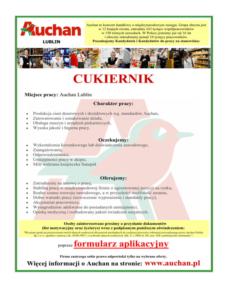 LUBLIN Auchan to koncern handlowy o międzynarodowym zasięgu. Grupa obecna jest w 12 krajach świata, zatrudnia 243 tysiące współpracowników w 150 różnych zawodach. W Polsce jesteśmy już od 16 lat i obecnie zatrudniamy ponad 10 tysięcy pracowników. Poszukujemy Kandydatek i Kandydatów do pracy na stanowisku: CUKIERNIK Miejsce pracy: Auchan Lublin Charakter pracy: Produkcja ciast deserowych i drożdżowych wg. standardów Auchan, Zatowarowanie i oznakowanie działu, Obsługa maszyn i urządzeń piekarniczych, Wysoka jakość i higiena pracy. Oczekujemy: Wykształcenia kierunkowego lub doświadczenia zawodowego, Zaangażowania, Odpowiedzialności, Umiejętności pracy w ekipie, Mile widziana książeczka Sanepid Oferujemy: Zatrudnienie na umowę o pracę, Stabilną pracę w międzynarodowej firmie o ugruntowanej pozycji na rynku, Realne szanse rozwoju zawodowego, a w przyszłości możliwość awansu, Dobre warunki pracy (nowoczesne wyposażenie i standardy pracy), Akcjonariat pracowniczy, Wynagrodzenie adekwatne do posiadanych umiejętności, Opiekę medyczną i rozbudowany pakiet świadczeń socjalnych. Osoby zainteresowane prosimy o przysłanie dokumentów (list motywacyjny oraz życiorys) wraz z podpisanym poniższym oświadczeniem: "Wyrażam zgodę na przetwarzanie moich danych osobowych dla potrzeb niezbędnych do realizacji procesów rekrutacji prowadzonego przez Auchan Polska Sp. z o. o. zgodnie z ustawą z dn. 29.08.1997 r. o ochronie danych osobowych, (Dz. U. z 2002 nr 101. poz. 926 z późniejszymi zmianami).", poprzez formularz aplikacyjny Firma zastrzega sobie prawo odpowiedzi tylko na wybrane oferty. Więcej informacji o Auchan na stronie: www.auchan.pl