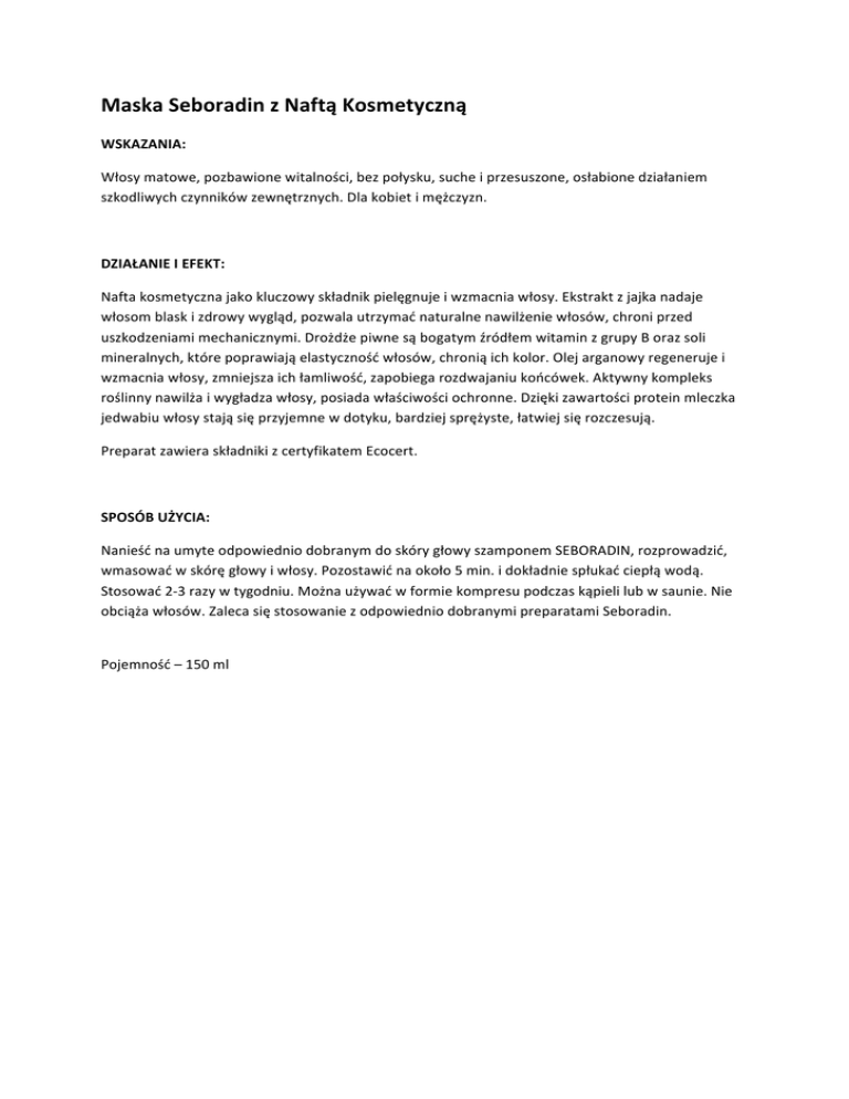 Maska Seboradin z Naftą Kosmetyczną WSKAZANIA: Włosy matowe, pozbawione witalności, bez połysku, suche i przesuszone, osłabione działaniem szkodliwych czynników zewnętrznych. Dla kobiet i mężczyzn. DZIAŁANIE I EFEKT: Nafta kosmetyczna jako kluczowy składnik pielęgnuje i wzmacnia włosy. Ekstrakt z jajka nadaje włosom blask i zdrowy wygląd, pozwala utrzymać naturalne nawilżenie włosów, chroni przed uszkodzeniami mechanicznymi. Drożdże piwne są bogatym źródłem witamin z grupy B oraz soli mineralnych, które poprawiają elastyczność włosów, chronią ich kolor. Olej arganowy regeneruje i wzmacnia włosy, zmniejsza ich łamliwość, zapobiega rozdwajaniu końcówek. Aktywny kompleks roślinny nawilża i wygładza włosy, posiada właściwości ochronne. Dzięki zawartości protein mleczka jedwabiu włosy stają się przyjemne w dotyku, bardziej sprężyste, łatwiej się rozczesują. Preparat zawiera składniki z certyfikatem Ecocert. SPOSÓB UŻYCIA: Nanieść na umyte odpowiednio dobranym do skóry głowy szamponem SEBORADIN, rozprowadzić, wmasować w skórę głowy i włosy. Pozostawić na około 5 min. i dokładnie spłukać ciepłą wodą. Stosować 2-‐3 razy w tygodniu. Można używać w formie kompresu podczas kąpieli lub w saunie. Nie obciąża włosów. Zaleca się stosowanie z odpowiednio dobranymi preparatami Seboradin. Pojemność – 150 ml