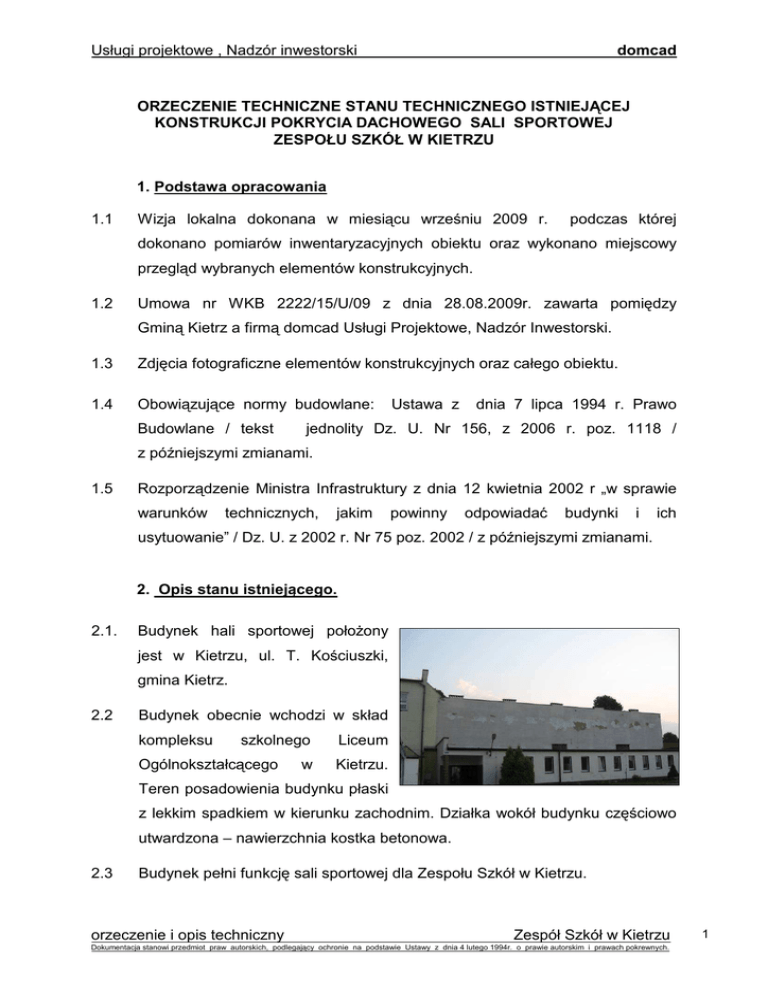 Usługi projektowe , Nadzór inwestorski domcad ORZECZENIE TECHNICZNE STANU TECHNICZNEGO ISTNIEJĄCEJ KONSTRUKCJI POKRYCIA DACHOWEGO SALI SPORTOWEJ ZESPOŁU SZKÓŁ W KIETRZU 1. Podstawa opracowania 1.1 Wizja lokalna dokonana w miesiącu wrześniu 2009 r. podczas której dokonano pomiarów inwentaryzacyjnych obiektu oraz wykonano miejscowy przegląd wybranych elementów konstrukcyjnych. 1.2 Umowa nr WKB 2222/15/U/09 z dnia 28.08.2009r. zawarta pomiędzy Gminą Kietrz a firmą domcad Usługi Projektowe, Nadzór Inwestorski. 1.3 Zdjęcia fotograficzne elementów konstrukcyjnych oraz całego obiektu. 1.4 Obowiązujące normy budowlane: Budowlane / tekst Ustawa z dnia 7 lipca 1994 r. Prawo jednolity Dz. U. Nr 156, z 2006 r. poz. 1118 / z późniejszymi zmianami. 1.5 Rozporządzenie Ministra Infrastruktury z dnia 12 kwietnia 2002 r „w sprawie warunków technicznych, jakim powinny odpowiadać budynki i ich usytuowanie” / Dz. U. z 2002 r. Nr 75 poz. 2002 / z późniejszymi zmianami. 2. Opis stanu istniejącego. 2.1. Budynek hali sportowej połoŜony jest w Kietrzu, ul. T. Kościuszki, gmina Kietrz. 2.2 Budynek obecnie wchodzi w skład kompleksu szkolnego Ogólnokształcącego w Liceum Kietrzu. Teren posadowienia budynku płaski z lekkim spadkiem w kierunku zachodnim. Działka wokół budynku częściowo utwardzona – nawierzchnia kostka betonowa. 2.3 Budynek pełni funkcję sali sportowej dla Zespołu Szkół w Kietrzu. orzeczenie i opis techniczny Zespół Szkół w Kietrzu Dokumentacja stanowi przedmiot praw autorskich, podlegający ochronie na podstawie Ustawy z dnia 4 lutego 1994r. o prawie autorskim i prawach pokrewnych. 1 Usługi projektowe , Nadzór inwestorski domcad 3. Opis konstrukcji budynku. Budynek sali sportowej jedno - kondygnacyjny, wykonany w konstrukcji mieszanej stalowo-Ŝelbetowej: Istniejącą konstrukcję główną staną dźwigary stalowe IKS 700 ze stali St3S o rozpiętości 18 m posadowione na słupach Ŝelbetowych w rozstawie 3m. Ściany ocieplone styropianem gr. 5 cm. Konstrukcja stropodachu – ocieplenie wełną mineralną miękką w dwóch warstwach. Pokrycie dachu blachą trapezową T18x720. zewnętrzne Ściany konstrukcję Główną stanowią słupy Ŝelbetowe o wymiarach 25 x 50 cm w rozstawie 3 m z wypełnieniem bloczkami typu suporeks gr. 24 cm pomiędzy nimi. Całość styropianem ocieplona gr. 5 cm od zewnątrz z wykończeniem ścianą z bloczków suporeks gr. 12 cm. Ściany zewnętrzne wykazują miejscowe zarysowania pionowe i poziome, które pogorszyły ich jakość oraz warunki termiczne ścian. Ponadto ściany zewnętrzne ulegają zawilgoceniu i przez co nadają do renowacji i oczyszczenia. Konstrukcja Istniejąca stropodachu blacha trapezowa TR60/235/075 posadowiona na dźwigarach stalowych głównych w rozstawie wełną 3m, mineralną ocieplenie miękką w dwóch warstwach. Pokrycie dachu blachą trapezową typ T18x720. Konstrukcja stropodachu została zmieniona w stosunku do projektu budowlanego - zastąpiono papę jednowarstwową typu MONOFLEX M blachą trapezową T18x720 o nie wystarczającej wysokości fali i kierunku ułoŜenia orzeczenie i opis techniczny Zespół Szkół w Kietrzu Dokumentacja stanowi przedmiot praw autorskich, podlegający ochronie na podstawie Ustawy z dnia 4 lutego 1994r. o prawie autorskim i prawach pokrewnych. 2 Usługi projektowe , Nadzór inwestorski domcad / strona A/B / przez co odprowadzenie wody z dachu jest utrudnione i powoduje zbieranie się wody i miejscowe zastoje. Ponadto zmieniono ocieplenie stropodachu poprzez zastosowanie wełny mineralnej miękkiej gr. 15 cm zamiast dwóch warstw wełny mineralnej z płyt twardych gr 12 cm. Całość istniejącego pokrycia dachowego nadaje się do rozbiórki i wymiany. Tynki wewnętrzne miejscowo wymagają skucia i ponownego wykonania – szczególnie w miejscach połączenia ścian – w pobliŜu okien / jak zdjęcie powyŜej /. Tynki zewnętrzne stan techniczny zły. Szczególnie od strony wejścia do sali sportowej – ściana szczytowa posiada na powierzchni wiele rys i pęknięć a w paru miejscach tynk odpadł całkowicie. Częściowo wymagają skucia i ponownego wykonania po uprzednim zmniejszeniu wysokości murów szczytowych wychodzących teraz ponad połać dachu. Obróbki blacharskie stan techniczny zły – wykonać nowe obróbki blacharskie po rozebraniu istniejących murów ogniowych i połoŜeniu nowego pokrycia dachowego w systemie płyt hybrydowych w obrysie budynku. Stolarka okienna pcv typowa dostępna w handlu – w stanie technicznym dostatecznym - wymaga ponownego szczegółowego sprawdzenia przez wykonawcę. orzeczenie i opis techniczny Zespół Szkół w Kietrzu Dokumentacja stanowi przedmiot praw autorskich, podlegający ochronie na podstawie Ustawy z dnia 4 lutego 1994r. o prawie autorskim i prawach pokrewnych. 3 Usługi projektowe , Nadzór inwestorski Wnioski: Istniejące budynku nie sali domcad pokrycie sportowej spełnia warunków technicznych i technologicznych do dalszej i jego eksploatacji wymaga bezwzględnej wymiany. Proponuje się zastosowanie zmianę technologii systemu krycia / system i technologia krycia w oraz likwidację / rozebranie / pokrycia dachu dachowego płytami poprzez hybrydowymi opisie technicznym poniŜej / istniejących murów ogniowych wykonanych z bloczków typu suporeks. Ponadto zaleca się szczegółowe sprawdzenie całości wykończenia tynków ścian zewnętrznych i częściowo wewnętrznych celem określenia ilości nowych do wykonania. orzeczenie i opis techniczny Zespół Szkół w Kietrzu Dokumentacja stanowi przedmiot praw autorskich, podlegający ochronie na podstawie Ustawy z dnia 4 lutego 1994r. o prawie autorskim i prawach pokrewnych. 4 Usługi projektowe , Nadzór inwestorski domcad I. Dane ewidencyjne: 1. Projektuje się zmianę pokrycia dachu budynku Sali sportowej dla Zespołu Szkół w Kietrzu. Konstrukcja dachu istniejącego, stalowo-Ŝelbetowa jednospadowa pokryta blachą trapezową T18x720. 2. I