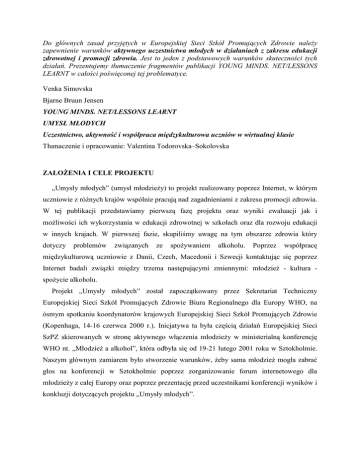 Do głównych zasad przyjętych w Europejskiej Sieci Szkół Promujących Zdrowie należy zapewnienie warunków aktywnego uczestnictwa młodych w działaniach z zakresu edukacji zdrowotnej i promocji zdrowia. Jest to jeden z podstawowych warunków skuteczności tych działań. Prezentujemy tłumaczenie fragmentów publikacji YOUNG MINDS. NET/LESSONS LEARNT w całości poświęconej tej problematyce. Venka Simovska Bjarne Bruun Jensen YOUNG MINDS. NET/LESSONS LEARNT UMYSŁ MŁODYCH Uczestnictwo, aktywność i współpraca międzykulturowa uczniów w wirtualnej klasie Tłumaczenie i opracowanie: Valentina Todorovska–Sokolovska ZAŁOŻENIA I CELE PROJEKTU „Umysły młodych” (umysł młodzieży) to projekt realizowany poprzez Internet, w którym uczniowie z różnych krajów wspólnie pracują nad zagadnieniami z zakresu promocji zdrowia. W tej publikacji przedstawiamy pierwszą fazę projektu oraz wyniki ewaluacji jak i możliwości ich wykorzystania w edukacji zdrowotnej w szkołach oraz dla rozwoju edukacji w innych krajach. W pierwszej fazie, skupiliśmy uwagę na tym obszarze zdrowia który dotyczy problemów związanych ze spożywaniem alkoholu. Poprzez współpracę międzykulturową uczniowie z Danii, Czech, Macedonii i Szwecji kontaktując się poprzez Internet badali związki między trzema następującymi zmiennymi: młodzież - kultura spożycie alkoholu. Projekt „Umysły młodych” został zapoczątkowany przez Sekretariat Techniczny Europejskiej Sieci Szkół Promujących Zdrowie Biura Regionalnego dla Europy WHO, na ósmym spotkaniu koordynatorów krajowych Europejskiej Sieci Szkół Promujących Zdrowie (Kopenhaga, 14-16 czerwca 2000 r.). Inicjatywa ta była częścią działań Europejskiej Sieci SzPZ skierowanych w stronę aktywnego włączenia młodzieży w ministerialną konferencję WHO nt. „Młodzież a alkohol”, która odbyła się od 19-21 lutego 2001 roku w Sztokholmie. Naszym głównym zamiarem było stworzenie warunków, żeby sama młodzież mogła zabrać głos na konferencji w Sztokholmie poprzez zorganizowanie forum internetowego dla młodzieży z całej Europy oraz poprzez prezentację przed uczestnikami konferencji wyników i konkluzji dotyczących projektu „Umysły młodych”. Główne cele tego projektu to: • rozwój, badanie i dokumentowanie demokratycznej (uczestnictwo i aktywne działanie) edukacji zdrowotnej i promocji zdrowia w szkołach; • badanie wzajemnego oddziaływania aktywnego uczestnictwa w edukacji i współpracy międzykulturowej przy wykorzystaniu Internetu (technologii dotyczącej informacje i komunikacji); • umożliwienie młodzieży wypowiedzenia się na temat problemów wynikających ze spożywania alkoholu w ich środowisku rówieśniczym. Podejście ogólne i główne zasady Rozpoczęcie projektu wiąże się z przyjęciem rezolucji pierwszej konferencji Europejskiej Sieci Szkół Promujących Zdrowie, w której między innymi zapisano, że: Szkoła Promująca Zdrowie opiera się na demokratycznych zasadach. Szkoła Promująca Zdrowie zwiększa możliwości młodych ludzi do podejmowania działań i dokonywania zmian. Wzmacnia młodych ludzi, wspiera ich wizje i idee, umożliwia im wpływ na ich życie i warunki życia". (WHO, 1997) Od momentu przyjęcia rezolucji w 1997 roku, prezentowano wiele projektów realizowanych w Europejskiej Sieci SzPZ, które mieszczą się w ramach powyższych stwierdzeń oraz są zgodne z treścią całej rezolucji. W wielu z tych projektów kładziono nacisk na aktywne uczestnictwo młodych w edukacji i promocji zdrowia w szkołach oraz wykazywano korzyści i potencjały tego podejścia. W wielu krajowych sieciach szkół promujących zdrowie dość powszechna jest tendencja do integrowania metod służących komunikacji i wymianie informacji w edukacji zdrowotnej. Poza tym, wiele szkół Europejskiej Sieci rozwijało współpracę międzynarodową na wielu rożnych poziomach (nauczyciele, studenci, itd.). Projekt „Umysły Młodzieży” zmierza do zintegrowania i analizowania tych doświadczeń. Zostały ustalone następujące zasady lub kryteria projektu „Umysły Młodych”: projekty szkolne obierają za cel działanie i zmianę, wizje i pomysły uczniów decydują o tym jakie zmiany mają być wprowadzone i jakie działania podjęte. Jako główną ramę w tworzeniu projektów szkolnych traktuje się podejście znane jako „badanie – wizja – działanie – zmiana” (IVAC approach: investigation – vision – action - change ): • uczniowie są aktywnie włączeni w decydowanie o specyfice problemów alkoholowych którymi chcieliby się zajmować; • nauczyciele mają za zadanie pomagać uczniom, inspirować i wspierać, jak również wymagać od nich; • projekt opiera się na współpracy międzykulturowej poprzez włączenie do jego realizacji czterech klas z różnych krajów europejskich pracujących w tym samym czasie nad tym samym zagadnieniem; • projekt ma sprawdzić możliwości i ograniczenia wykorzystania w edukacji zdrowotnej Internetu - zintegrowanej technologii informacji i komunikacji, która wspiera uczestnictwo i aktywne działanie. Uczestnicy Projekt adresowany jest do uczniów gimnazjum w wieku od 12-16 lat. W tym projekcie bezpośrednio uczestniczyło około 100 uczniów z czterech klas w Czechach, Danii, Macedonii i Szwecji, oraz niektórzy nauczyciele. Dodatkowo, wiele szkół i uczniów z Europejskiej Sieci SzPZ wzięło udział w forum internetowym w ostatniej fazie projektu związanej z konferencją w Sztokholmie. Projekt ten był koordynowany przez międzynarodową grupę doradców składającą się z przedstawicieli każdego z czterech krajów oraz badaczy z Duńskiego Uniwersytetu Edukacji. Centrum koordynacyjne mieściło się przy Programie Badawczym dla Edukacji dotyczącej Środowiska i Zdrowia Duńskiego Uniwersytetu Edukacji. TEORETYCZNE PODSTAWY PRZYJĘTEJ KONCEPCJI W tej części, zwięźle przedstawiamy kluczowe pojęcia na kt